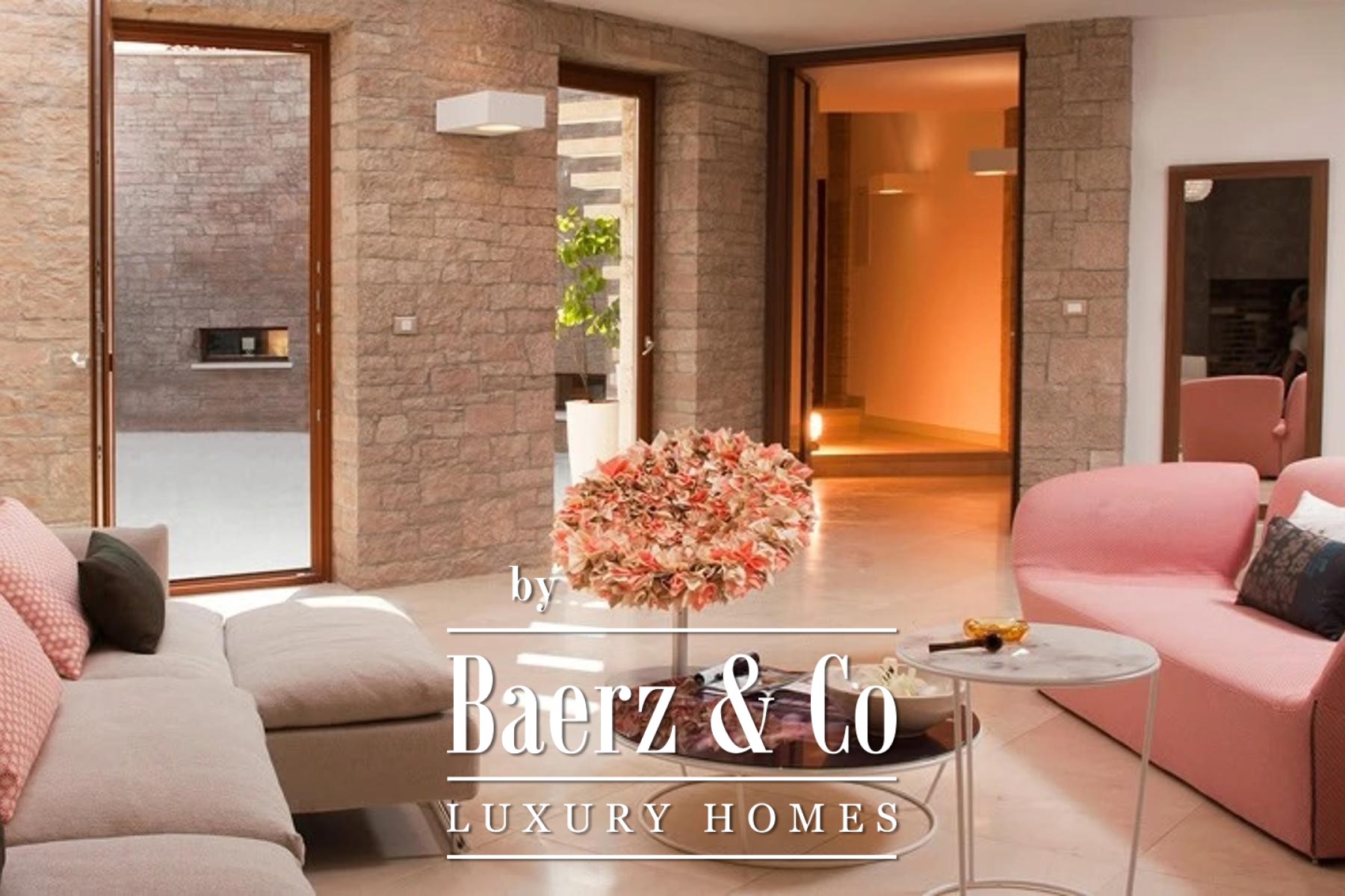 Inside, five spacious bedrooms each feature their own bathrooms and refined décor, supporting a lifestyle of ease and privacy. The lower level includes a guest apartment, sauna, summer kitchen, and laundry, supporting daily comfort and relaxation. The outdoor 12-meter heated swimming pool, with hydromassage and sun terrace, forms the focal point of social life, oriented to the shimmering coastline.