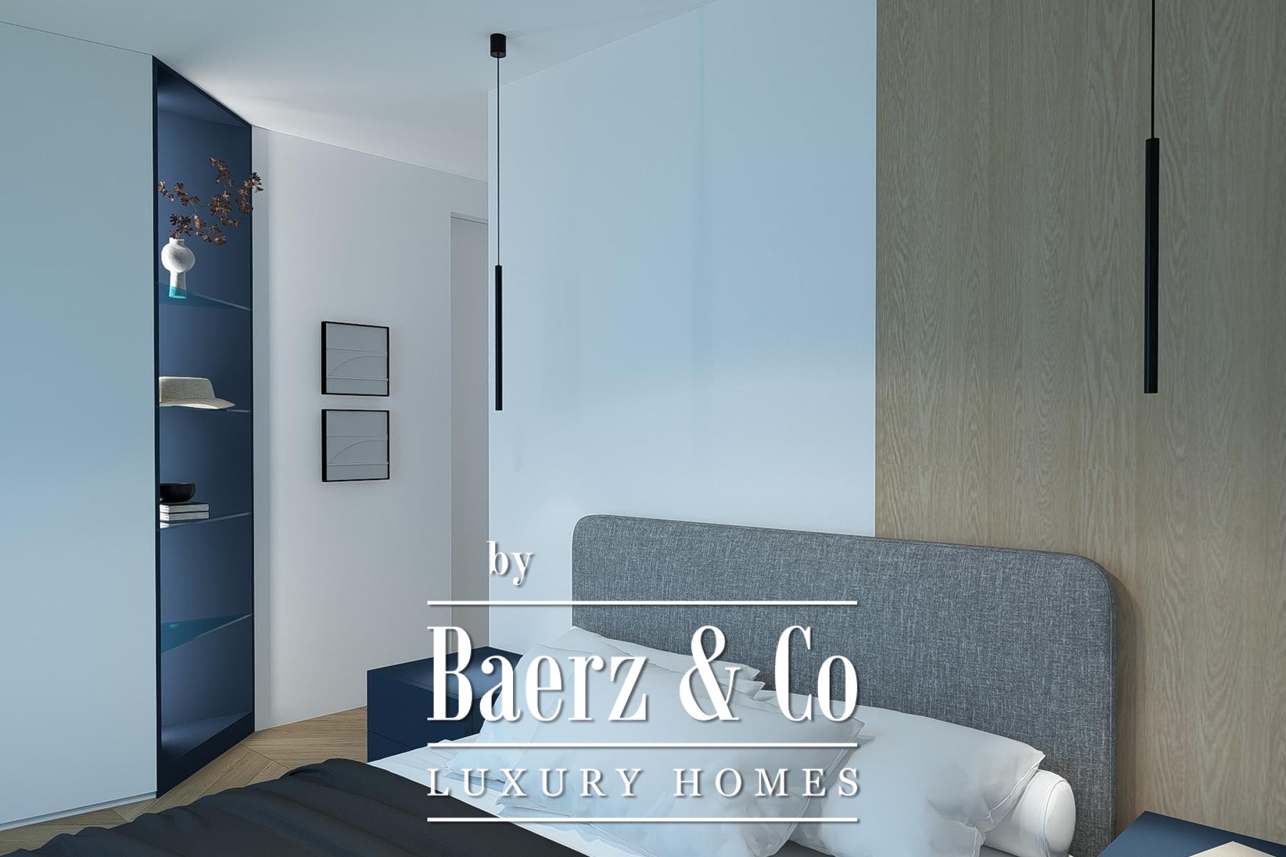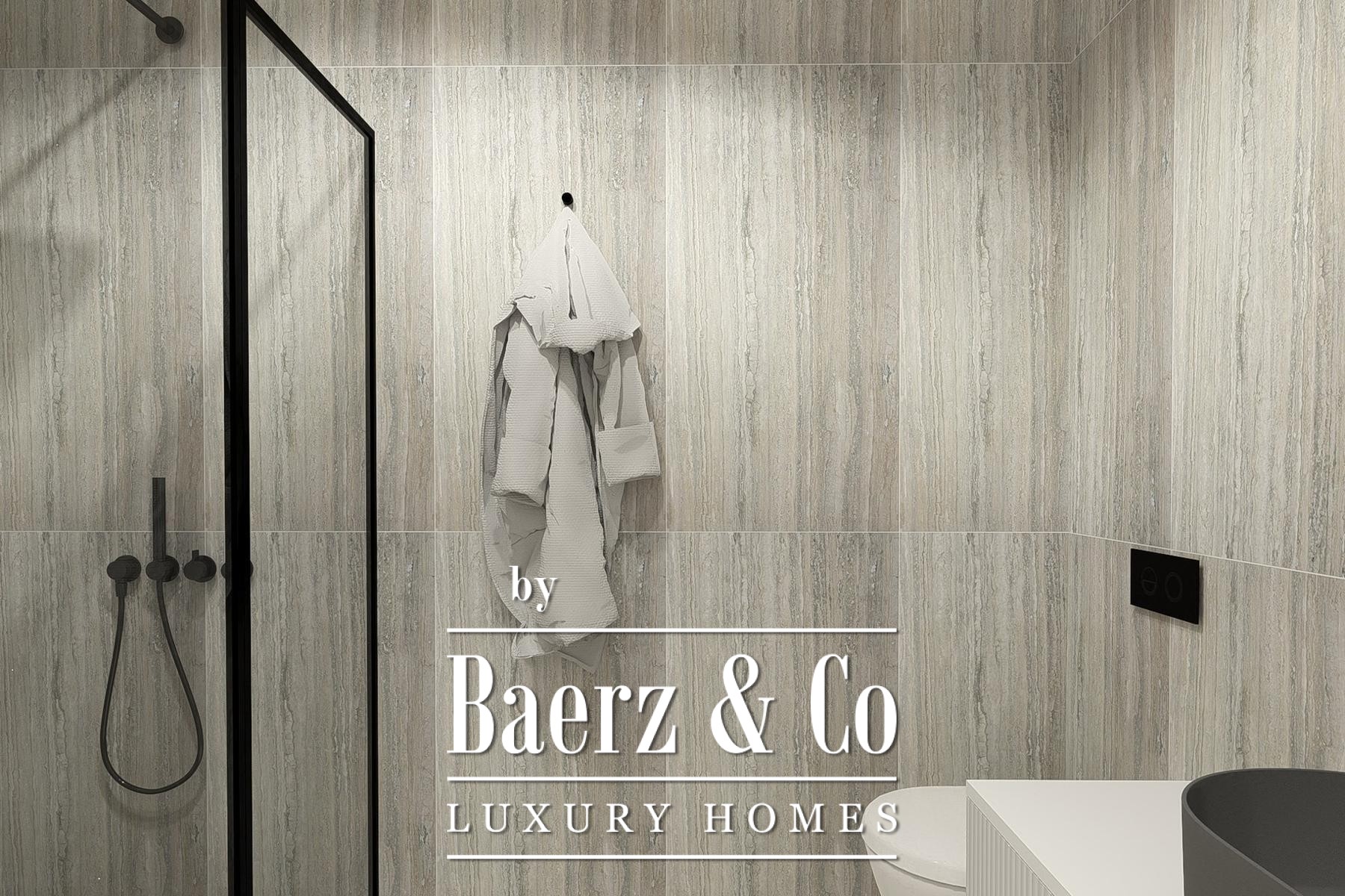 Three bedrooms include a principal suite with its own bathroom, while a separate bathroom serves the remaining rooms. The living area opens to the kitchen and dining space, connecting fluidly to the generous terrace where the private pool and panoramic sea views elevate daily rituals. Underfloor heating and air conditioning in each room bring year-round comfort, and an elevator offers discreet arrival.