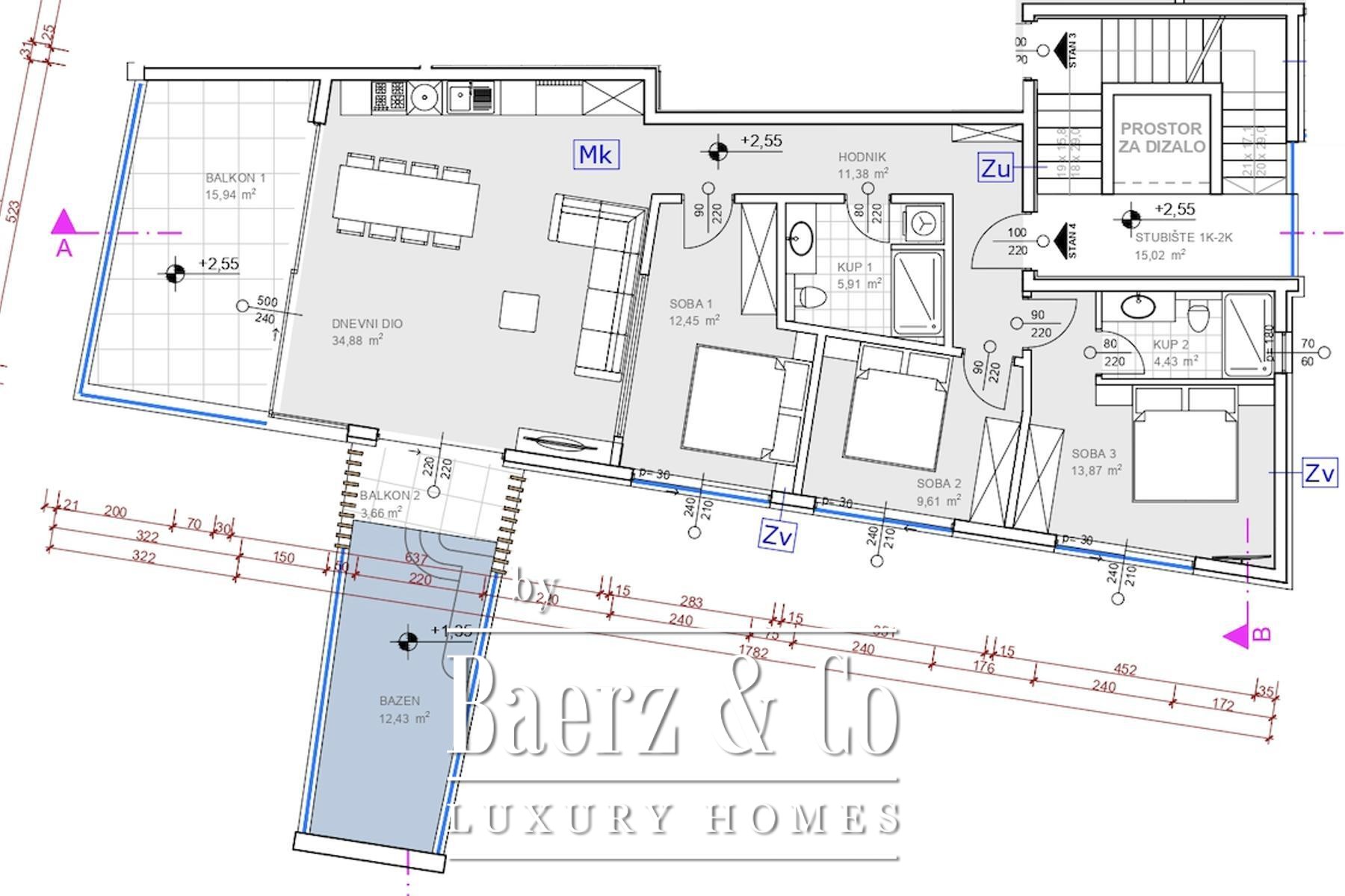 This luxury apartment Grebaštica brings a private encounter with the Adriatic, where architecture meets clarity and sea views frame every moment. Set on the first floor, this 114 m² residence belongs to a contemporary development of just nine apartments, each with its own pool. The residence features a closed living space of 92.53 m² complemented by a 15.94 m² terrace, ensuring a balance of indoor sophistication and outdoor tranquility.