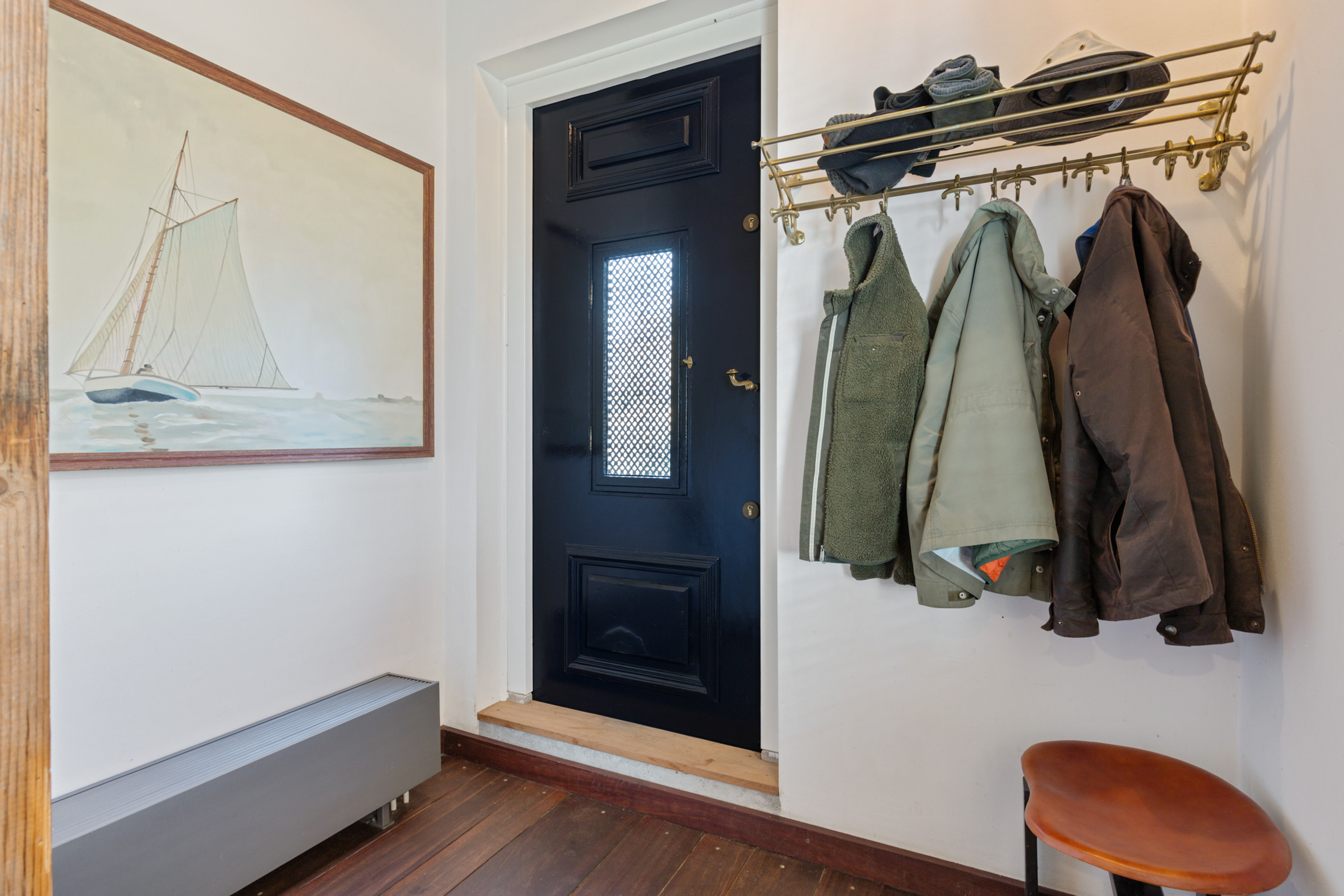 Entrance hall with corridor, cloakroom cupboard, extensive meter cabinet with 16 groups and three-phase power, toilet with washbasin and side entrance.