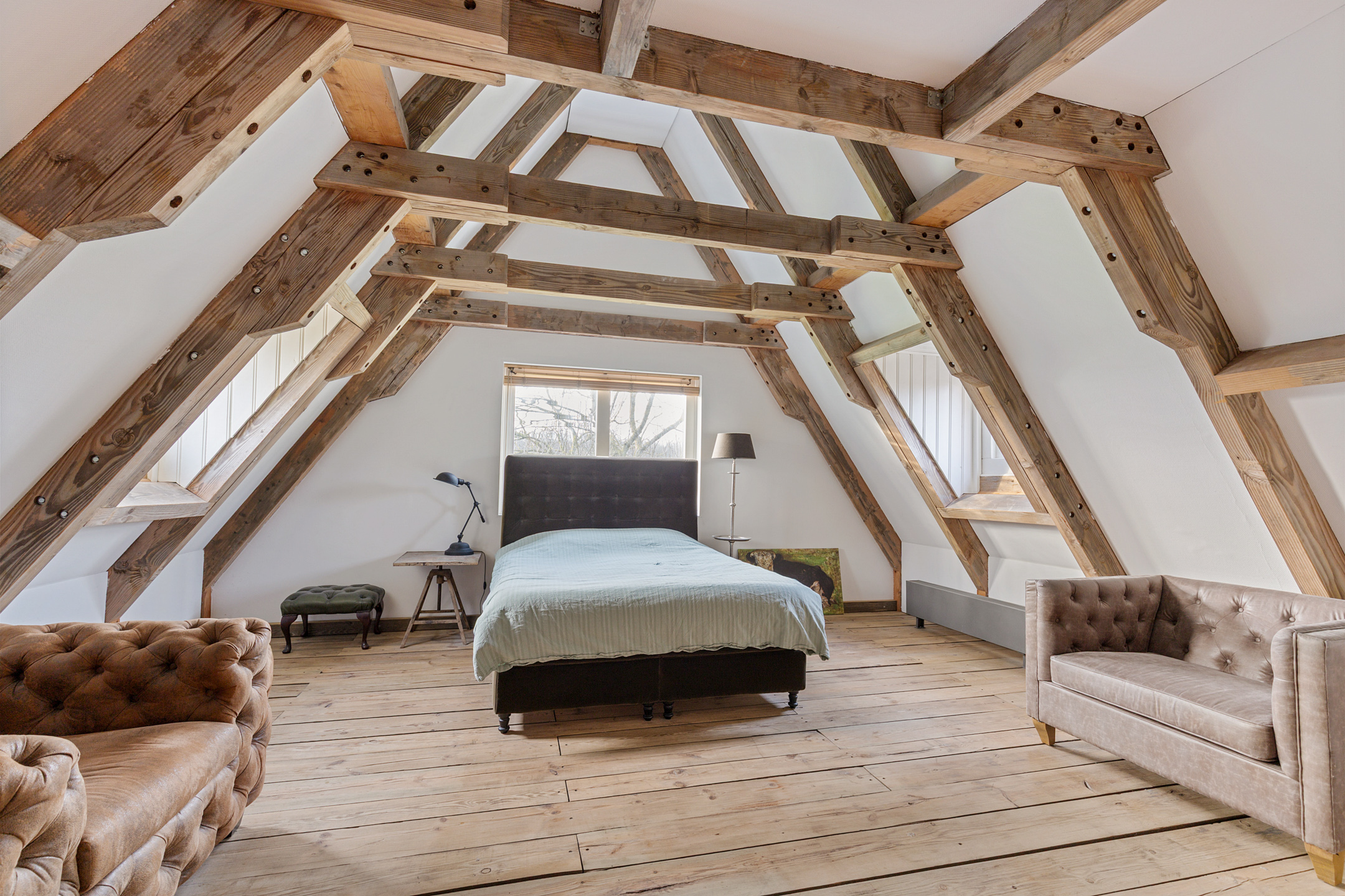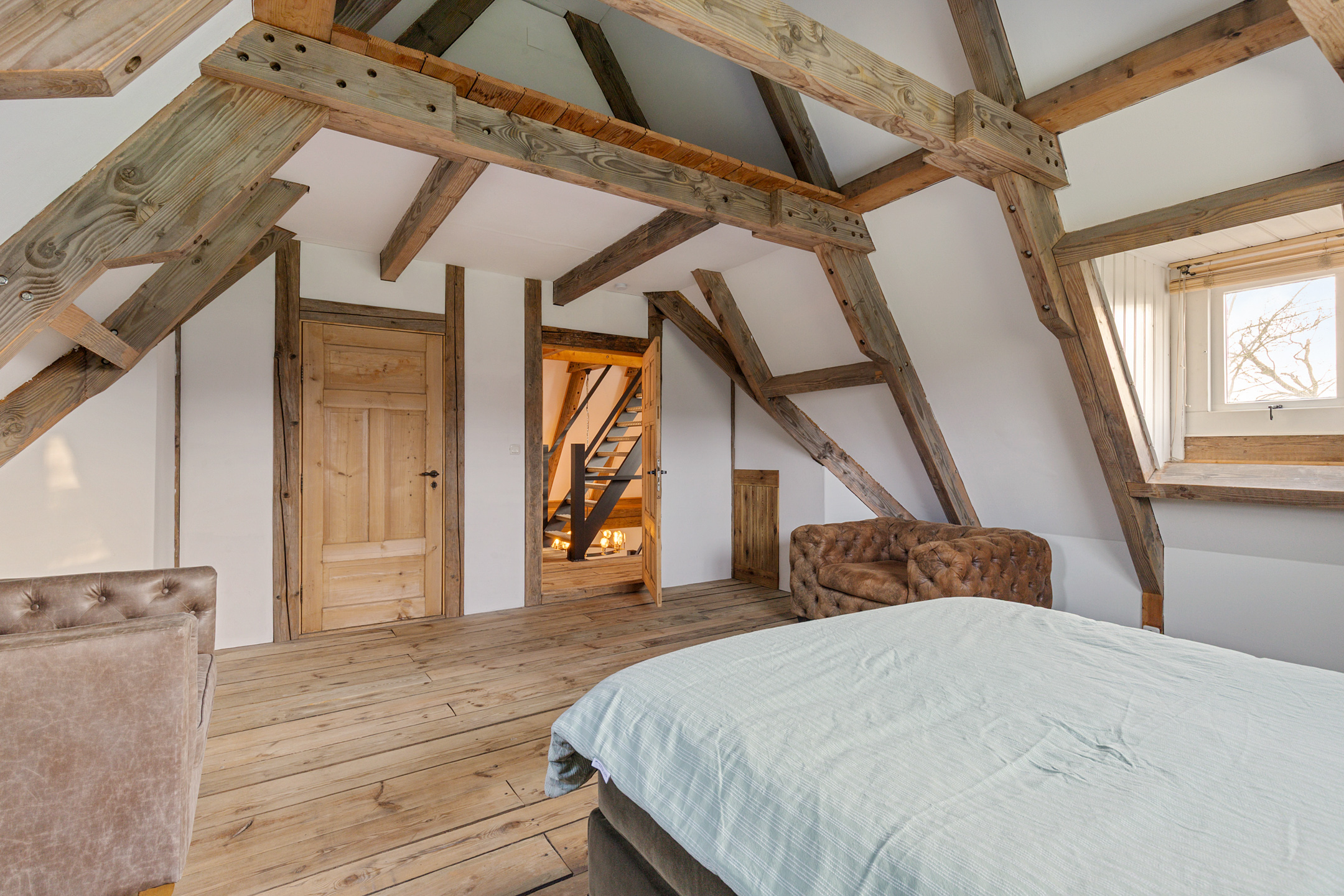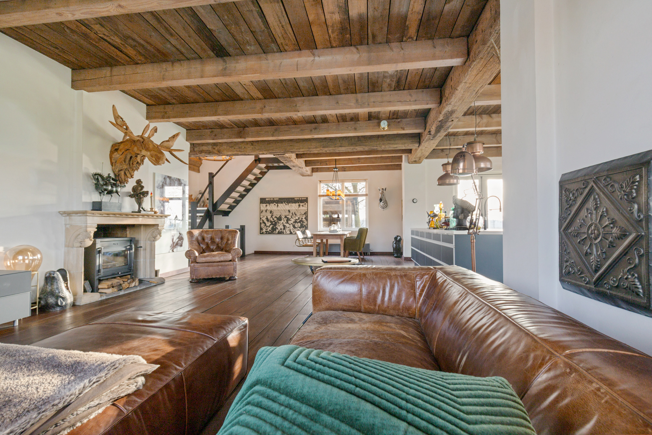 The spacious living room offers beautiful views of the Gaasterland natural landscape from virtually every window. Wherever you sit or stand, the surrounding nature becomes part of the interior experience. The atmosphere is defined by robust exposed beams, hardwood floors, a stylish fireplace with wood-burning stove and an impressive aluminium stair hall.
