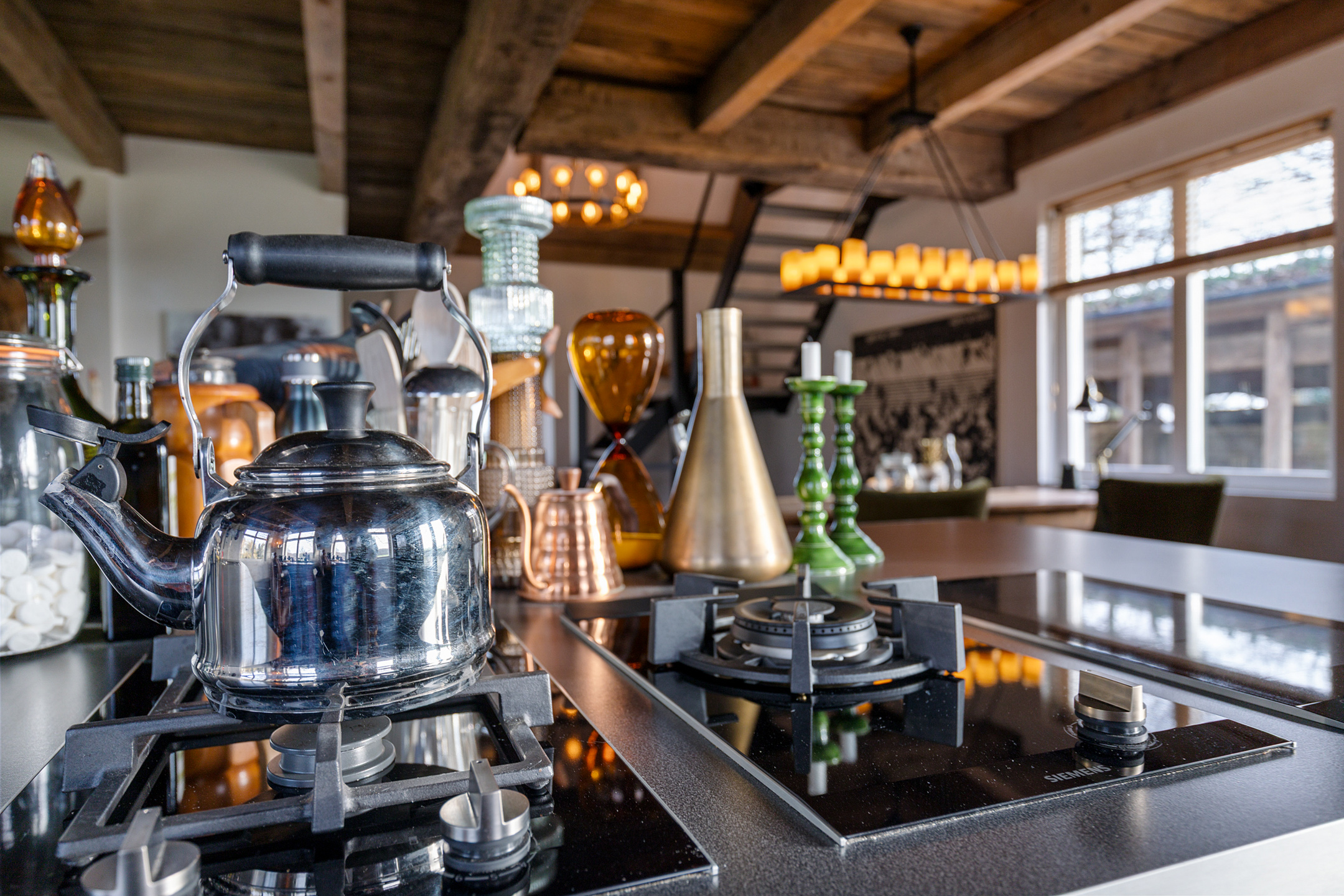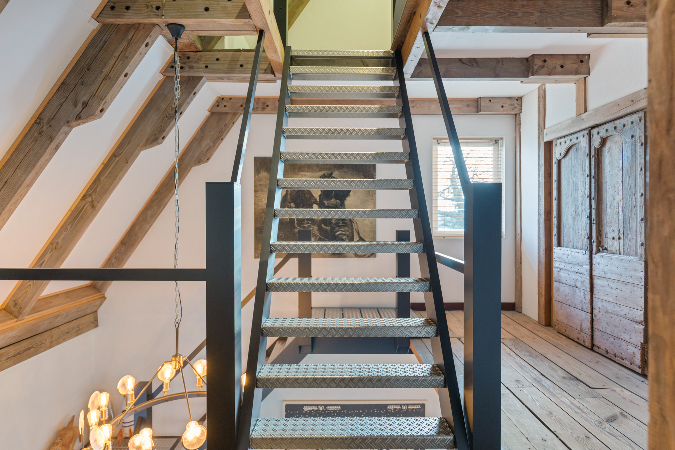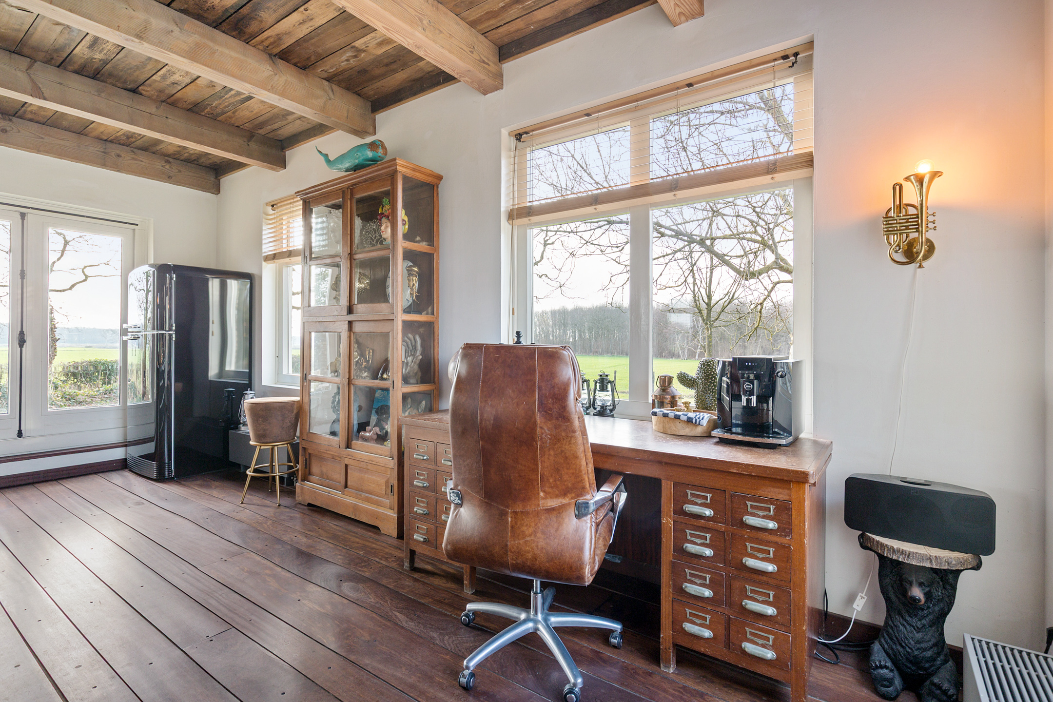 The spacious living room offers beautiful views of the Gaasterland natural landscape from virtually every window. Wherever you sit or stand, the surrounding nature becomes part of the interior experience. The atmosphere is defined by robust exposed beams, hardwood floors, a stylish fireplace with wood-burning stove and an impressive aluminium stair hall.