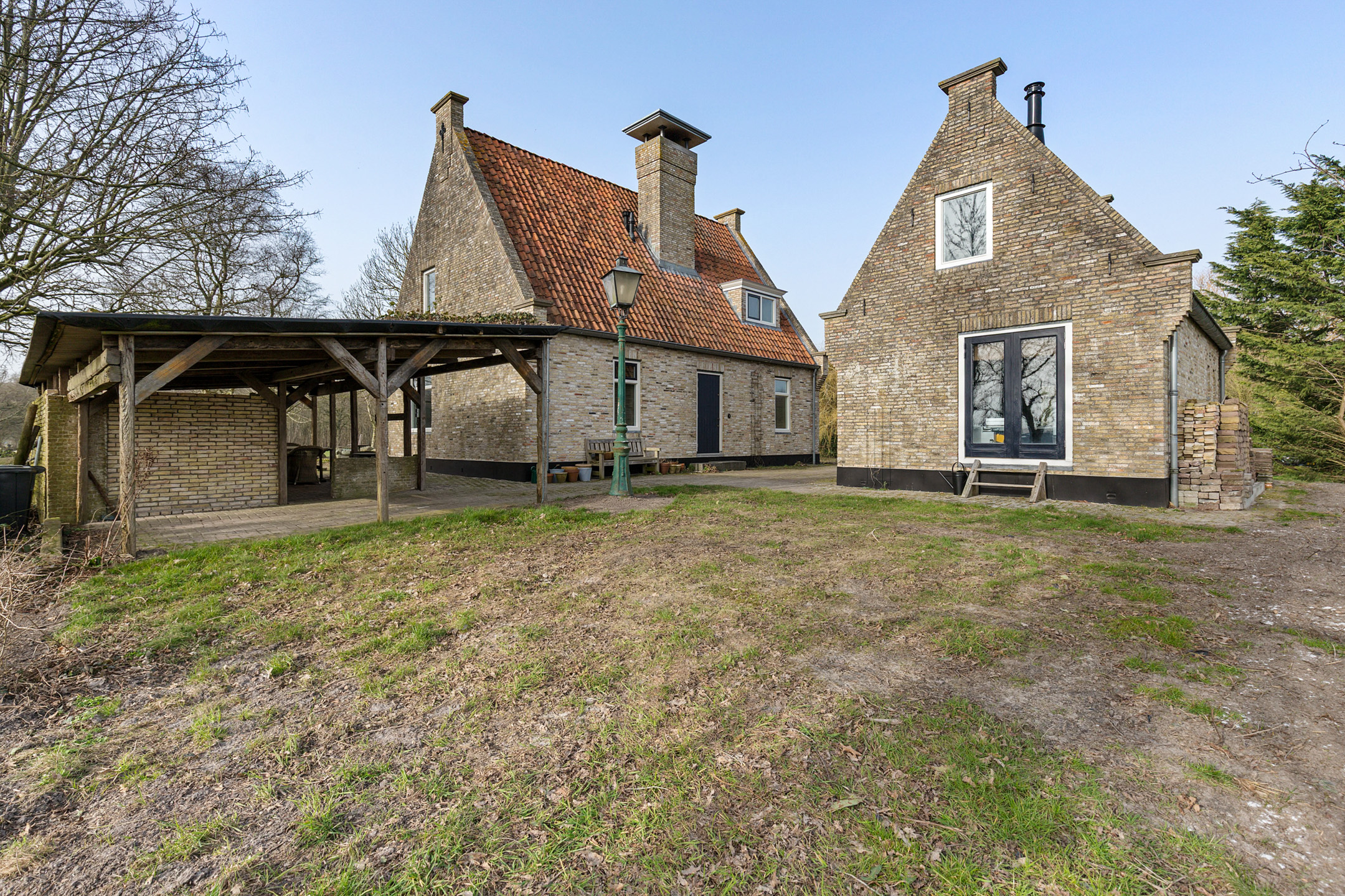 The garden is thoughtfully designed around the terp and blends harmoniously with the surrounding landscape. A long private driveway, guest parking area, carport with covered west-facing terrace, easy-to-maintain lawn, various planted borders, an orchard with traditional fruit varieties and a beautiful pond with sheltered decking terrace together create a true countryside oasis.
