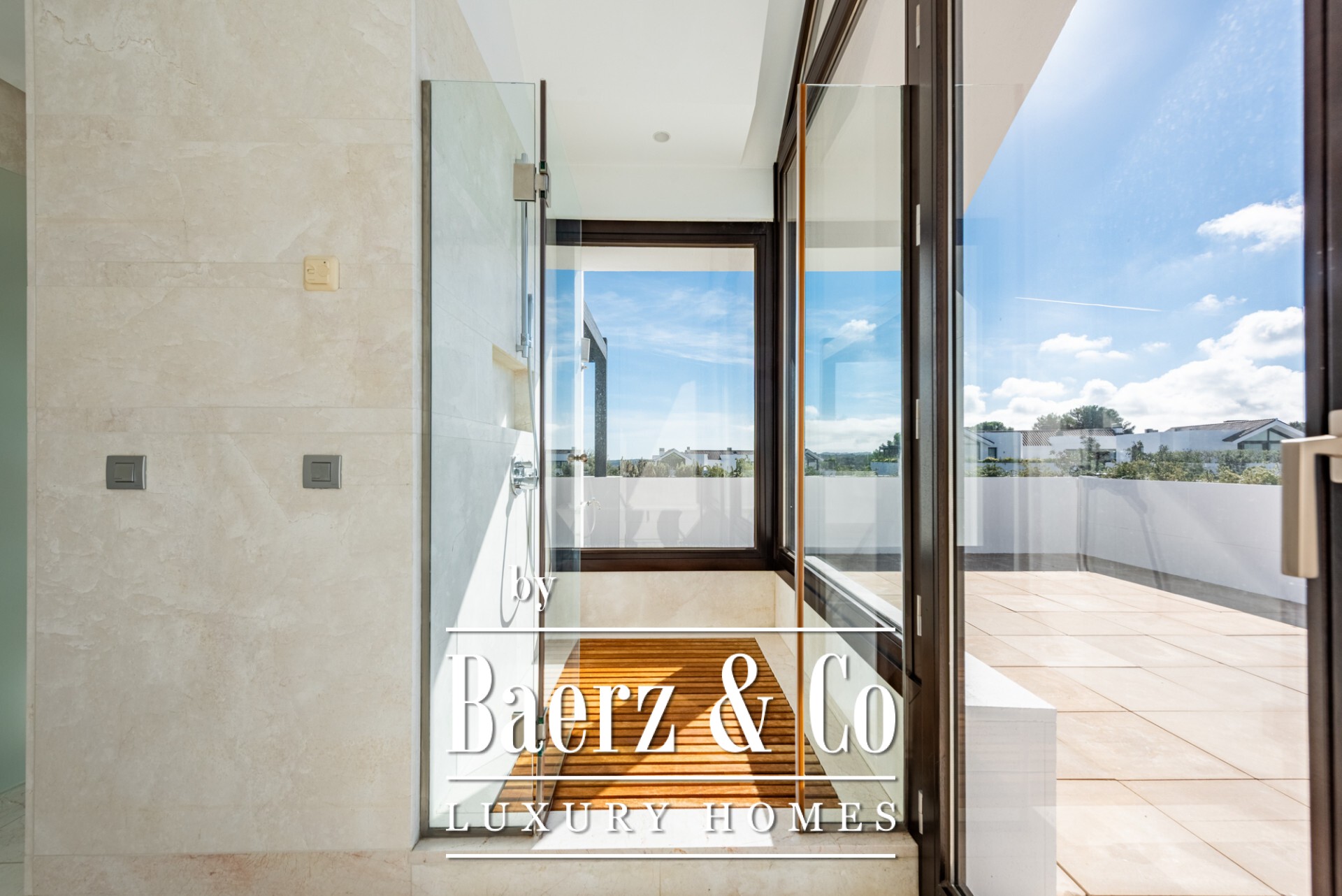 The main floor presents three bedroom suites, each benefitting from considered orientation and quiet outlooks, while the living and dining areas connect seamlessly to a fully fitted kitchen and utility room. The staircase rises to a master suite of presence and calm, framed by panoramic and partial sea views from its private terrace. Marble floors, underfloor heating, a smart home system, and double glazing offer comfort and control throughout.