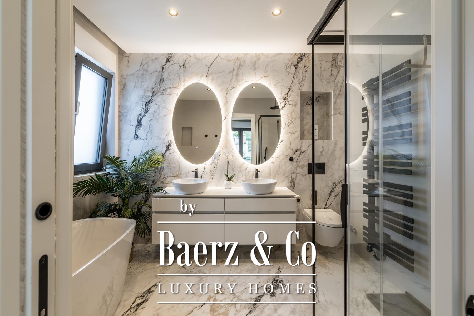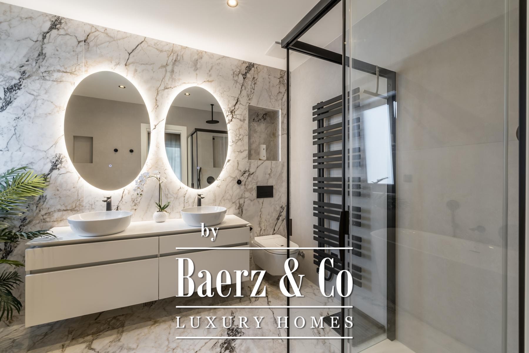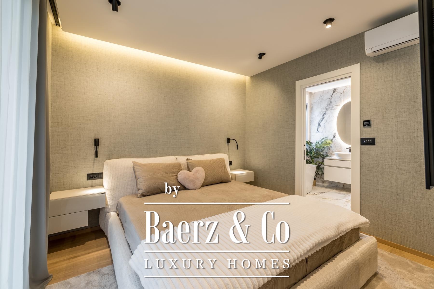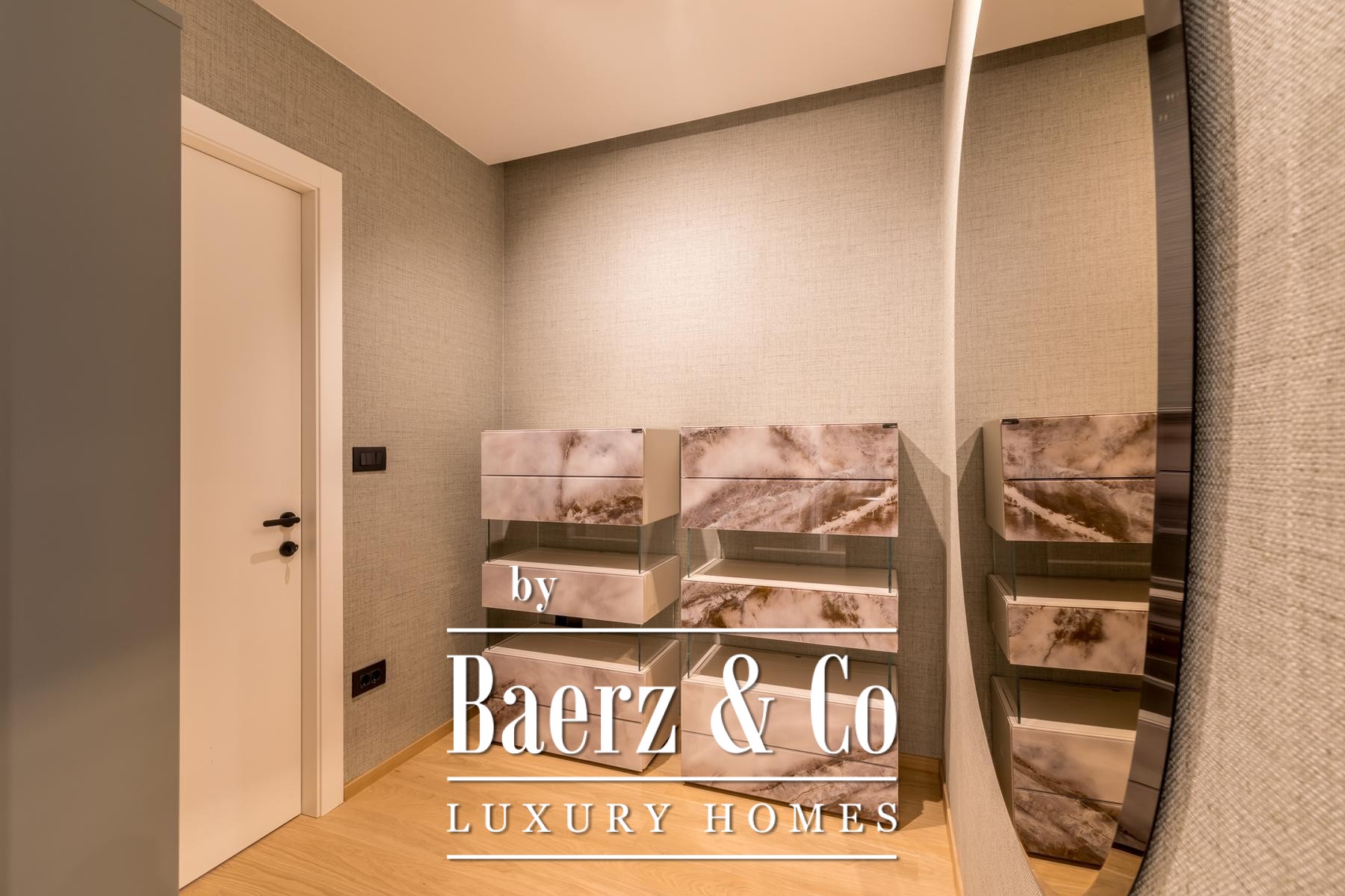 A south-facing loggia of 18.35 m² opens to a view over the sea, perfectly positioned for year-round relaxation. Technical specifications include a heat pump system, underfloor heating, high-efficiency air conditioning, Schuco joinery, electric shutters, and an automatic irrigation system. Security features encompass burglar-proof and fire-resistant doors. The property includes a garage parking space and a storage room, rare and valuable additions for this sought-after area.
