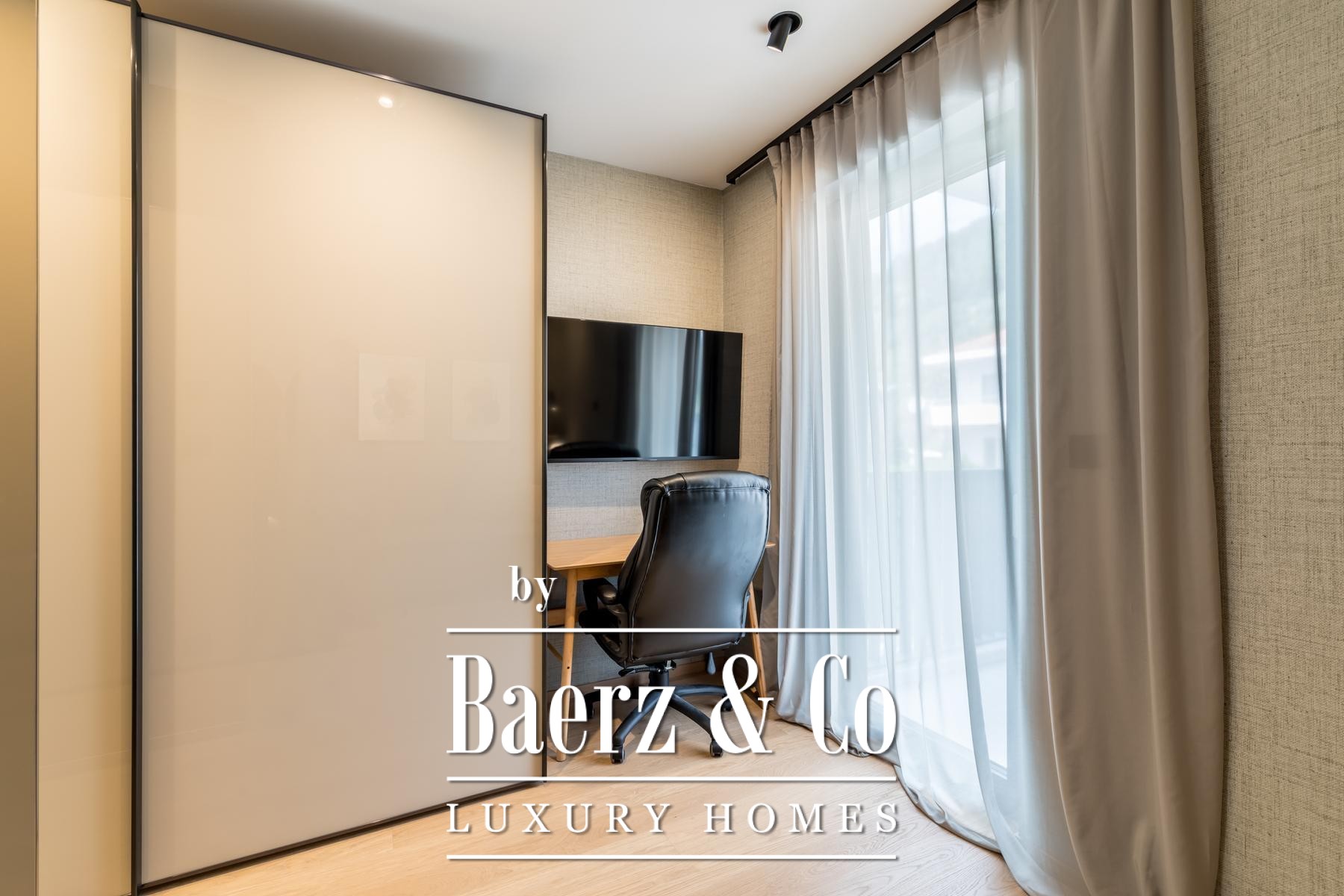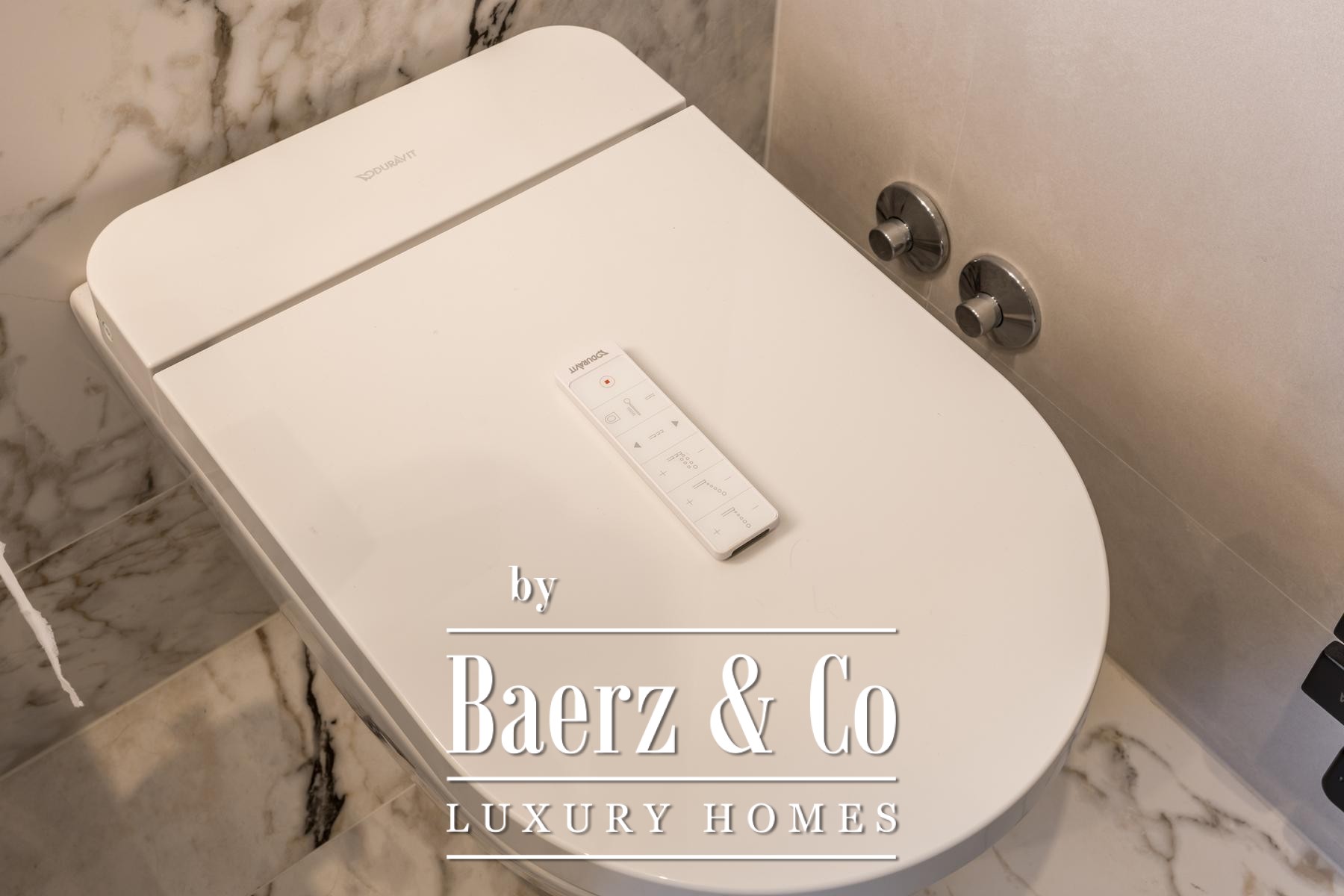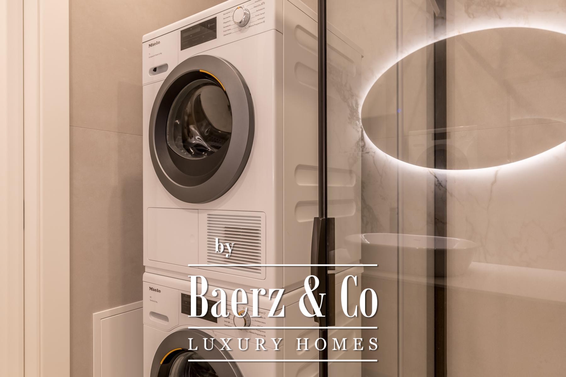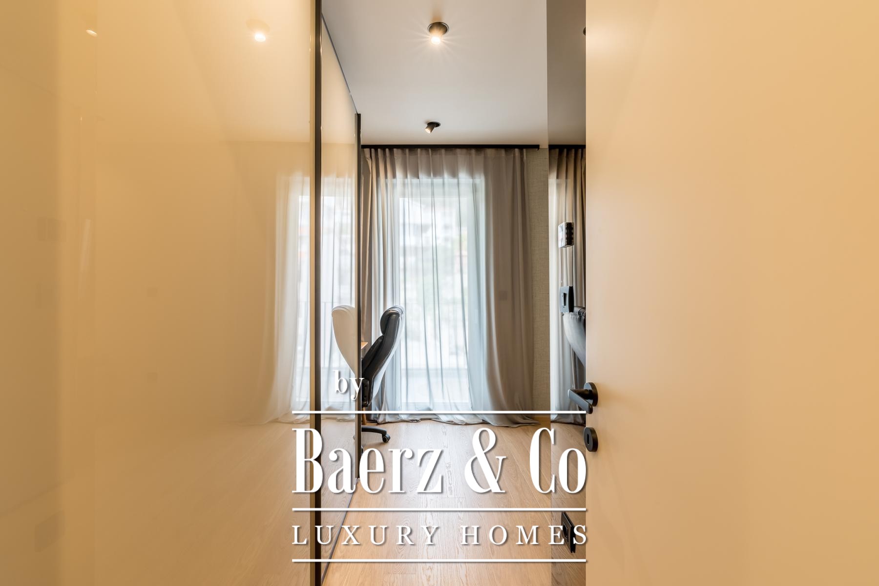 A south-facing loggia of 18.35 m² opens to a view over the sea, perfectly positioned for year-round relaxation. Technical specifications include a heat pump system, underfloor heating, high-efficiency air conditioning, Schuco joinery, electric shutters, and an automatic irrigation system. Security features encompass burglar-proof and fire-resistant doors. The property includes a garage parking space and a storage room, rare and valuable additions for this sought-after area.