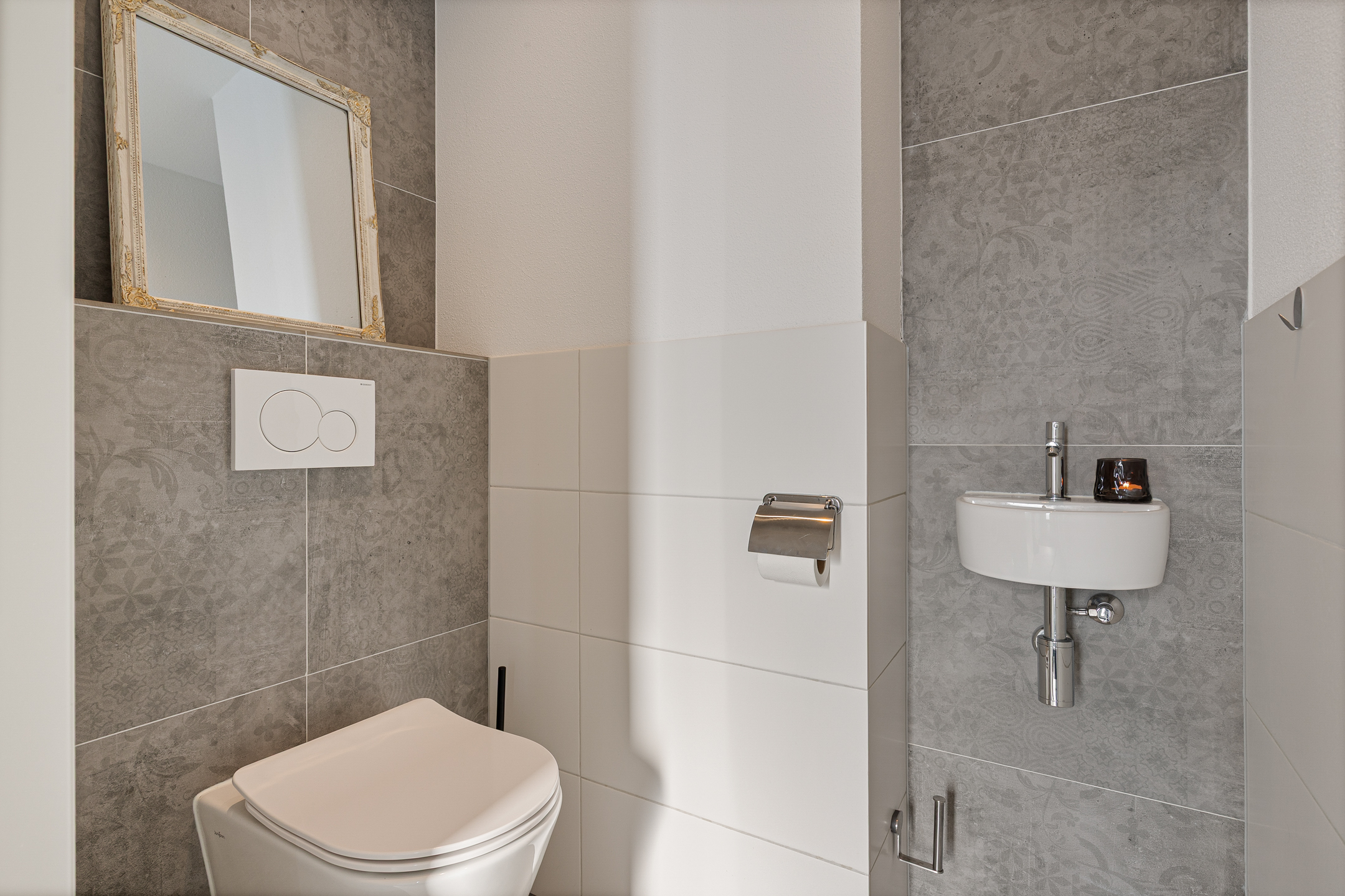 Lichte entree, hal met meterkast en modern royaal toilet.