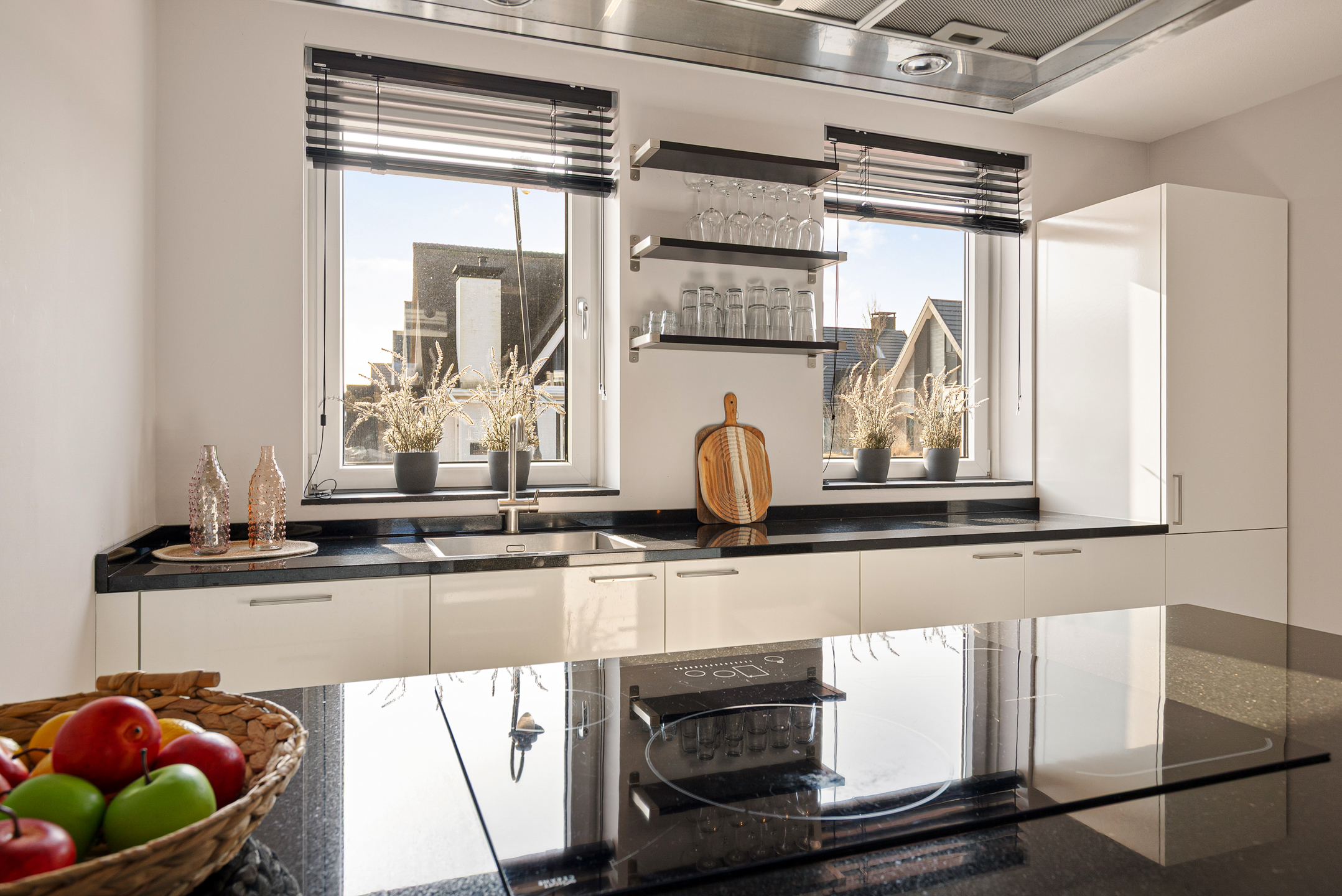 De luxe open keuken vormt een centraal onderdeel van de living en is uitgevoerd met moderne inbouwapparatuur en ruime werkbladen. Vanuit de keuken heeft u speels zicht op de waterpartij aan de straatzijde.