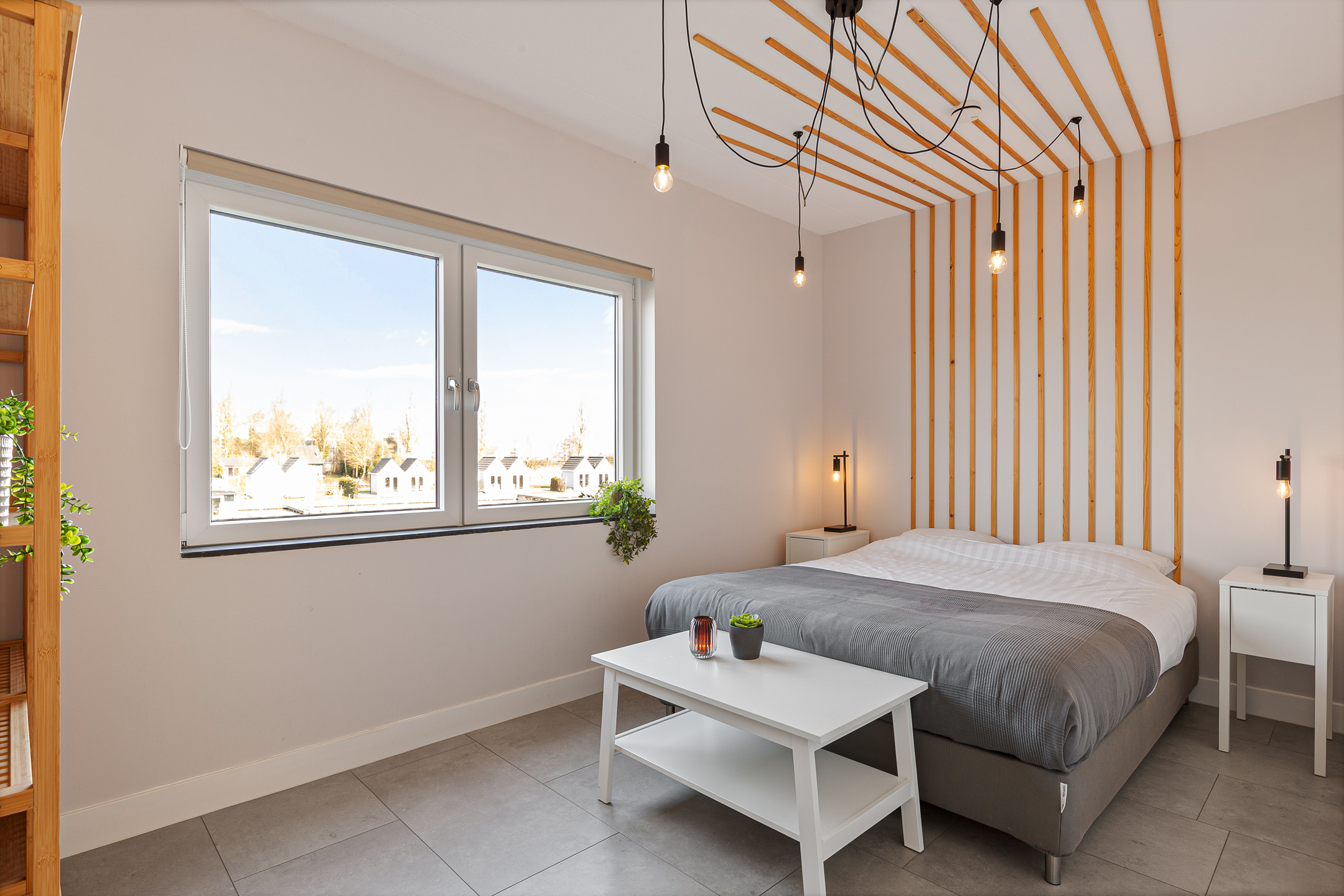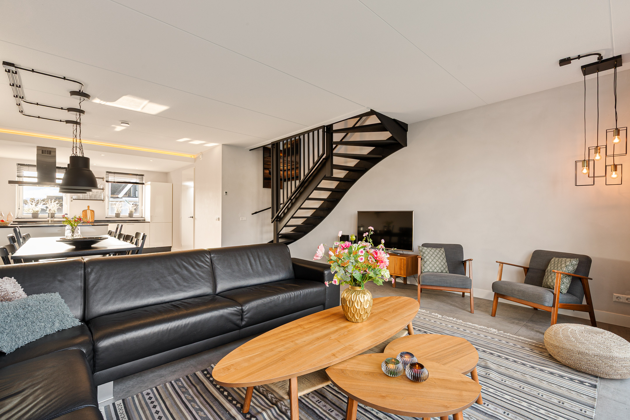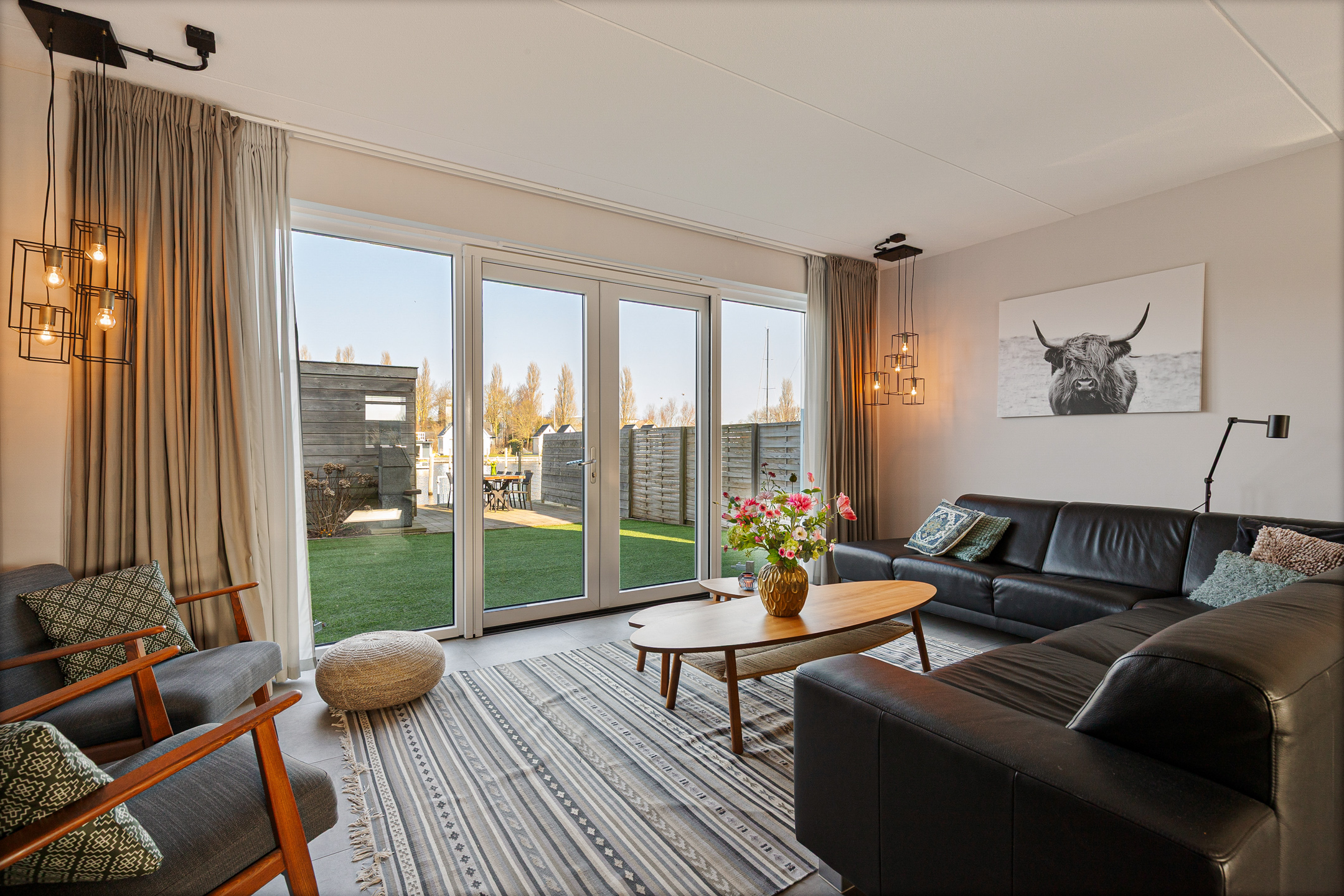 De ruime en lichte woonkamer is gesitueerd aan de achterzijde en biedt door de grote raampartijen een prachtig uitzicht over de tuin en het water. Openslaande deuren zorgen voor een directe verbinding met het terras en de steiger.