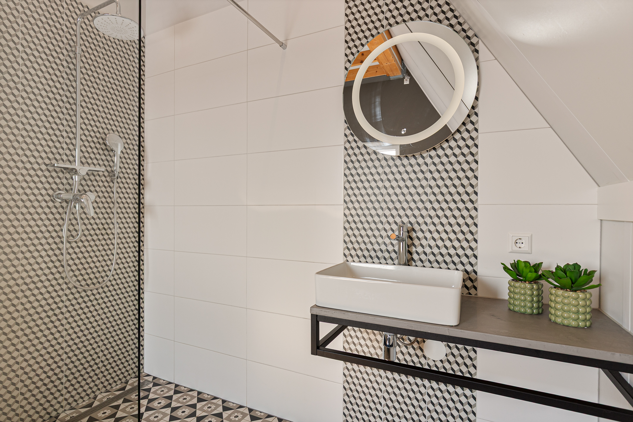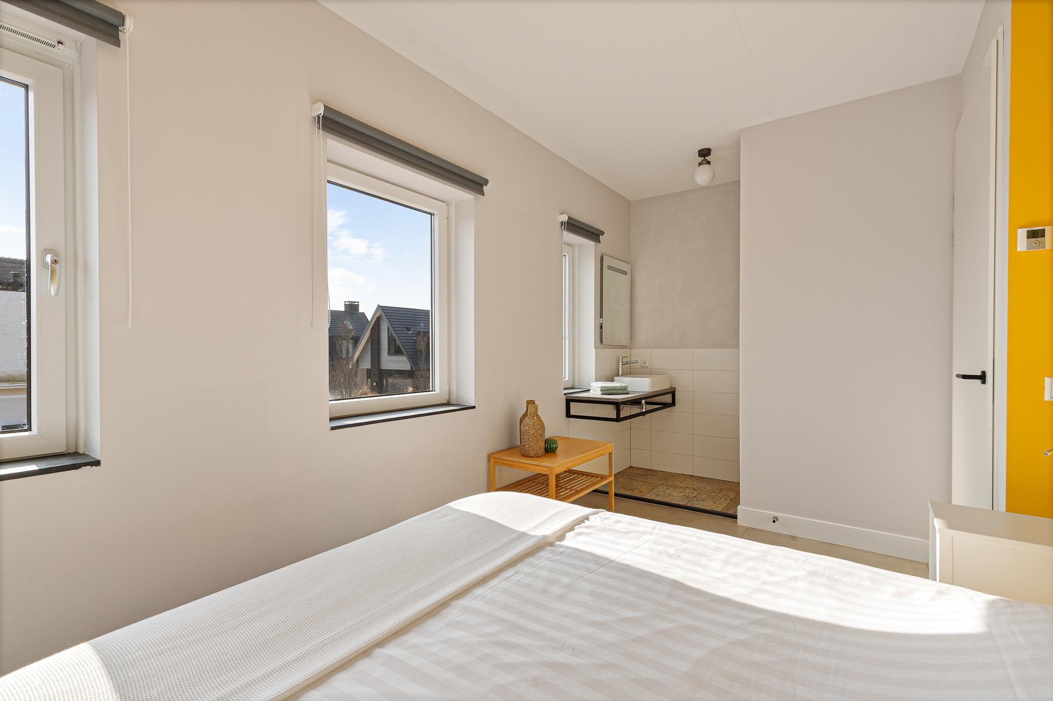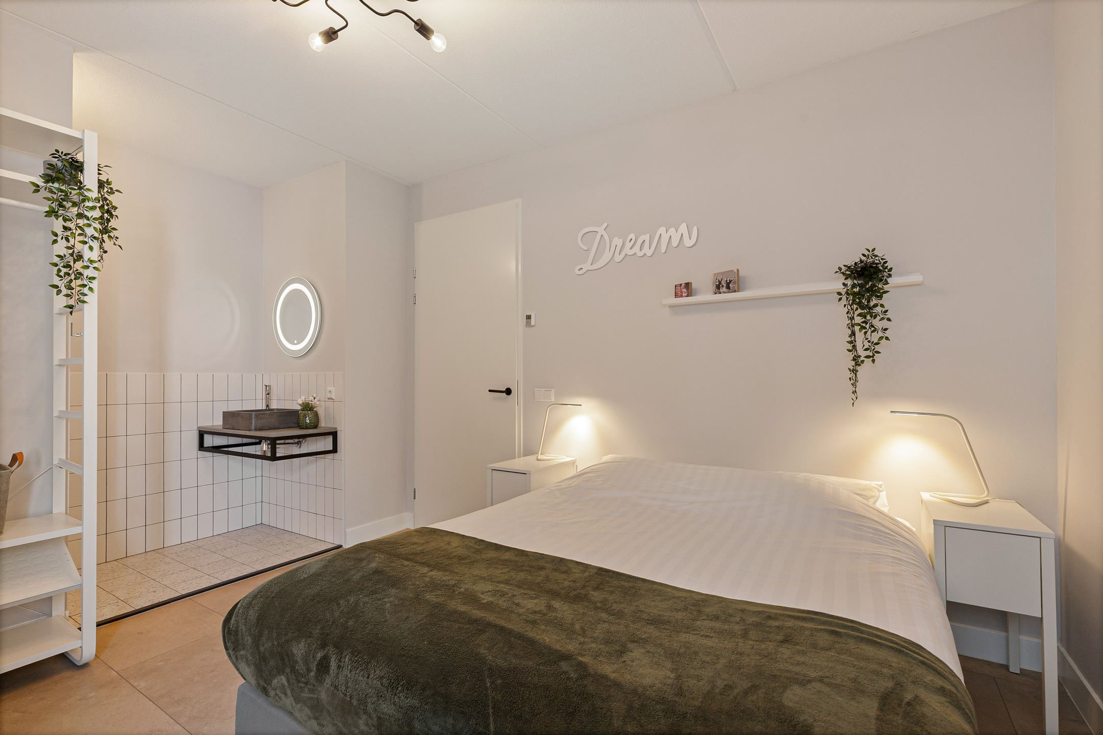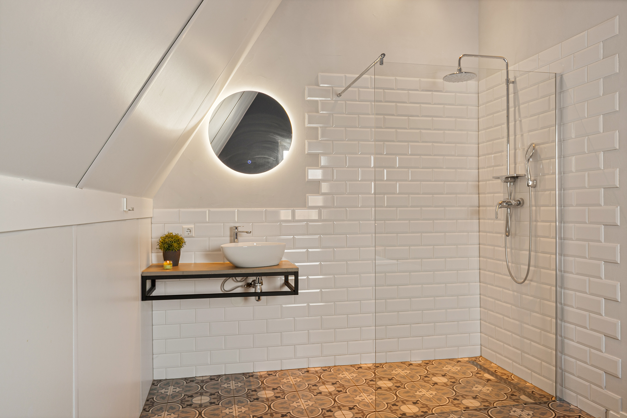 Overloop met toegang tot drie ruime slaapkamers met elk een eigen ensuite badkamer betegeld in mediterrane stijl, voorzien van inloopdouche en wastafelmeubel. De verdiepingsvloer is afgewerkt met een duurzame pvc-vloer en ook hier is vloerverwarming aanwezig. Alle kamers zijn individueel qua temperatuur in te regelen. Op de overloop is een tweede toilet en grote kastruimte gesitueerd.