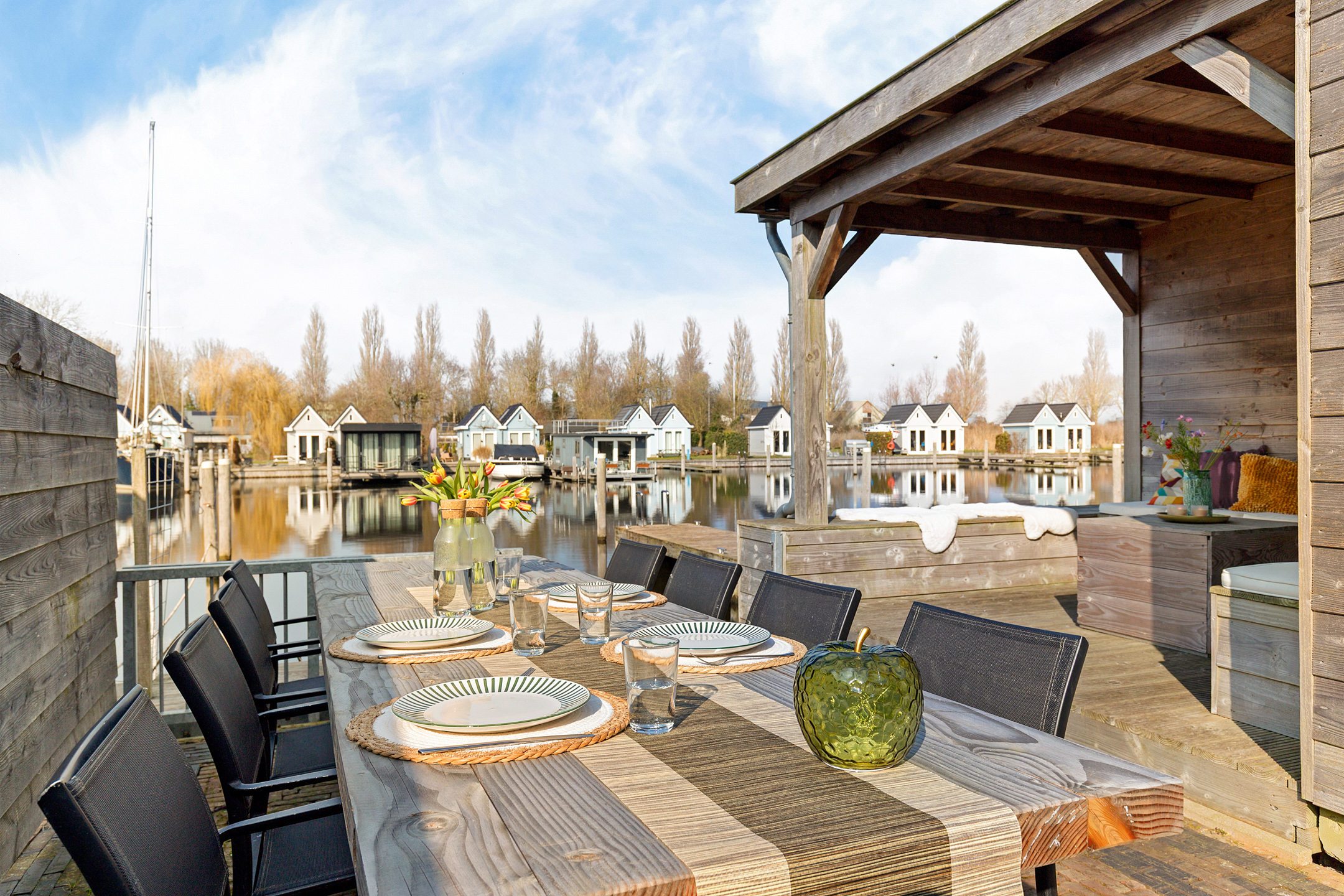 Aan de steiger staat een houten overkapping met berging, een ideale plek om beschut buiten te zitten, zelfs wanneer het weer wat minder is. De bergruimte is groot genoeg voor fietsen, tuingereedschap en/of bootkussens.