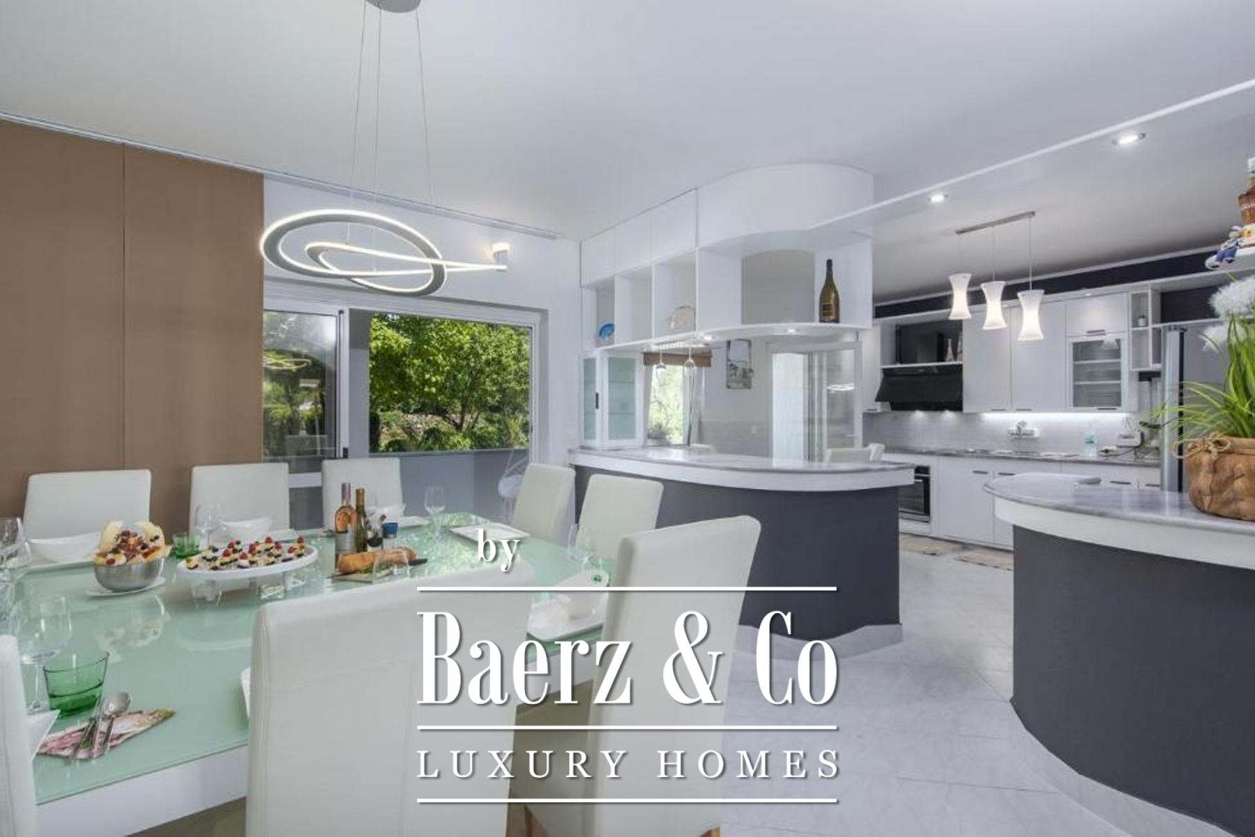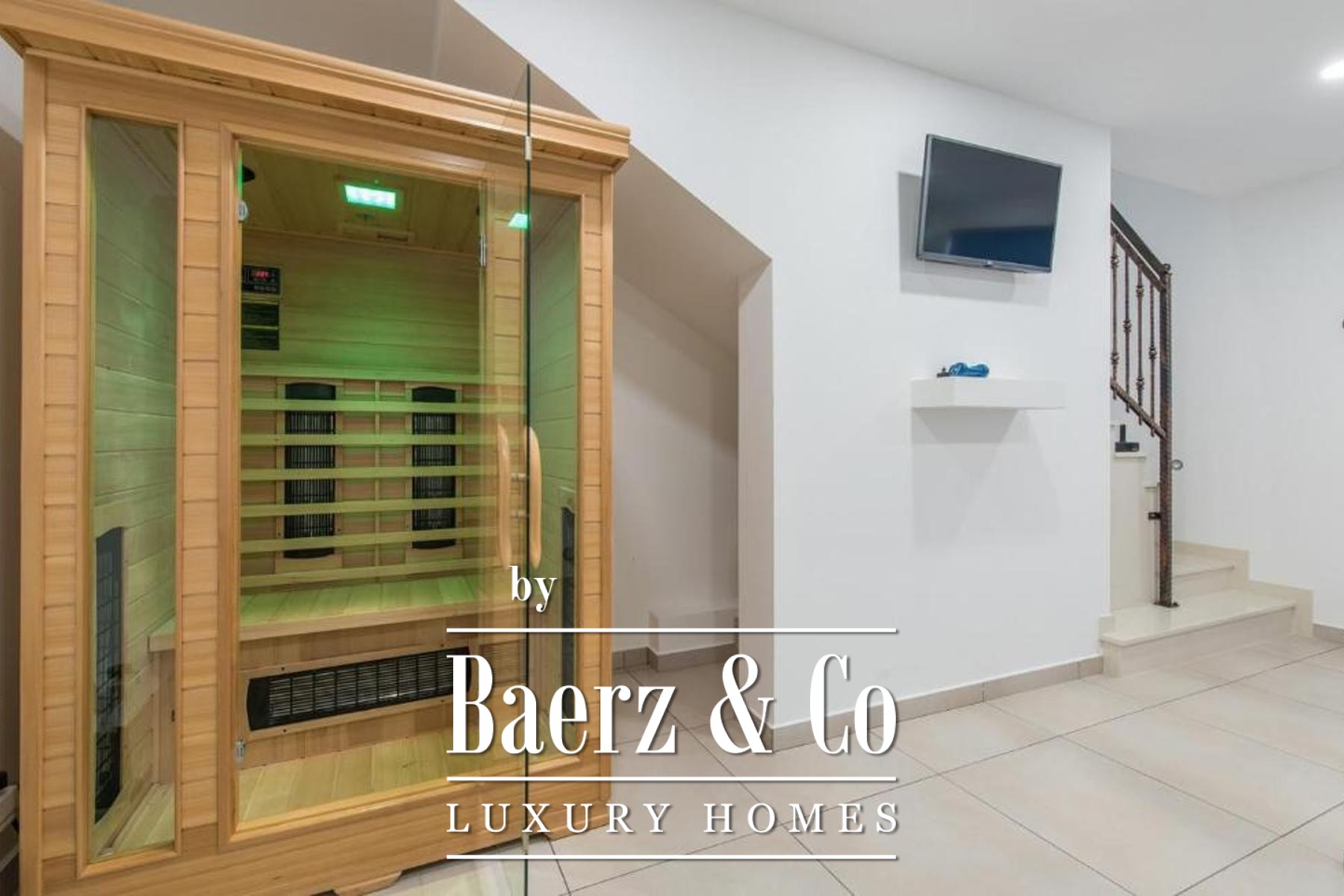 The ground floor flows between expansive interiors and outdoor areas, with a 30 m² swimming pool, jacuzzi, two covered terraces, and a living room seamlessly connected to the garden. The kitchen and dining area open to their own terrace, inviting gatherings in both sun and shade. The basement houses a gym and sauna, fostering relaxation and well-being. On the first floor, three bedrooms and three bathrooms enjoy terrace access, revealing soothing views of the surrounding nature and distant sea. The attic provides two further bedrooms and two bathrooms, ensuring privacy for guests or family members; a mezzanine features an en-suite bedroom for added comfort.