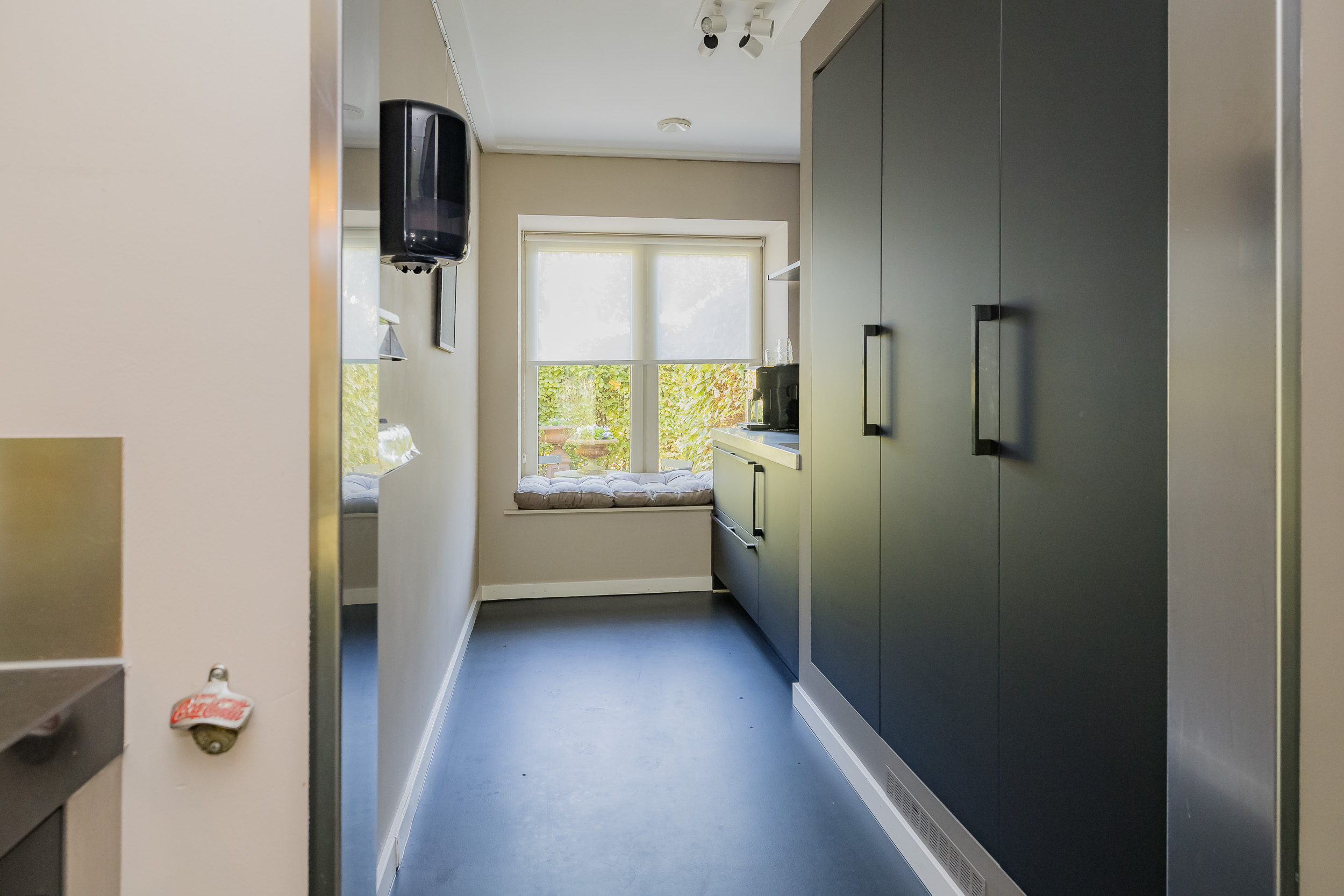 A fixed staircase leads to the second floor with two more (bed)rooms, which are currently used as office space. From the back room, you have access to the boiler room with central heating system (2016) and the heat recovery ventilation system.