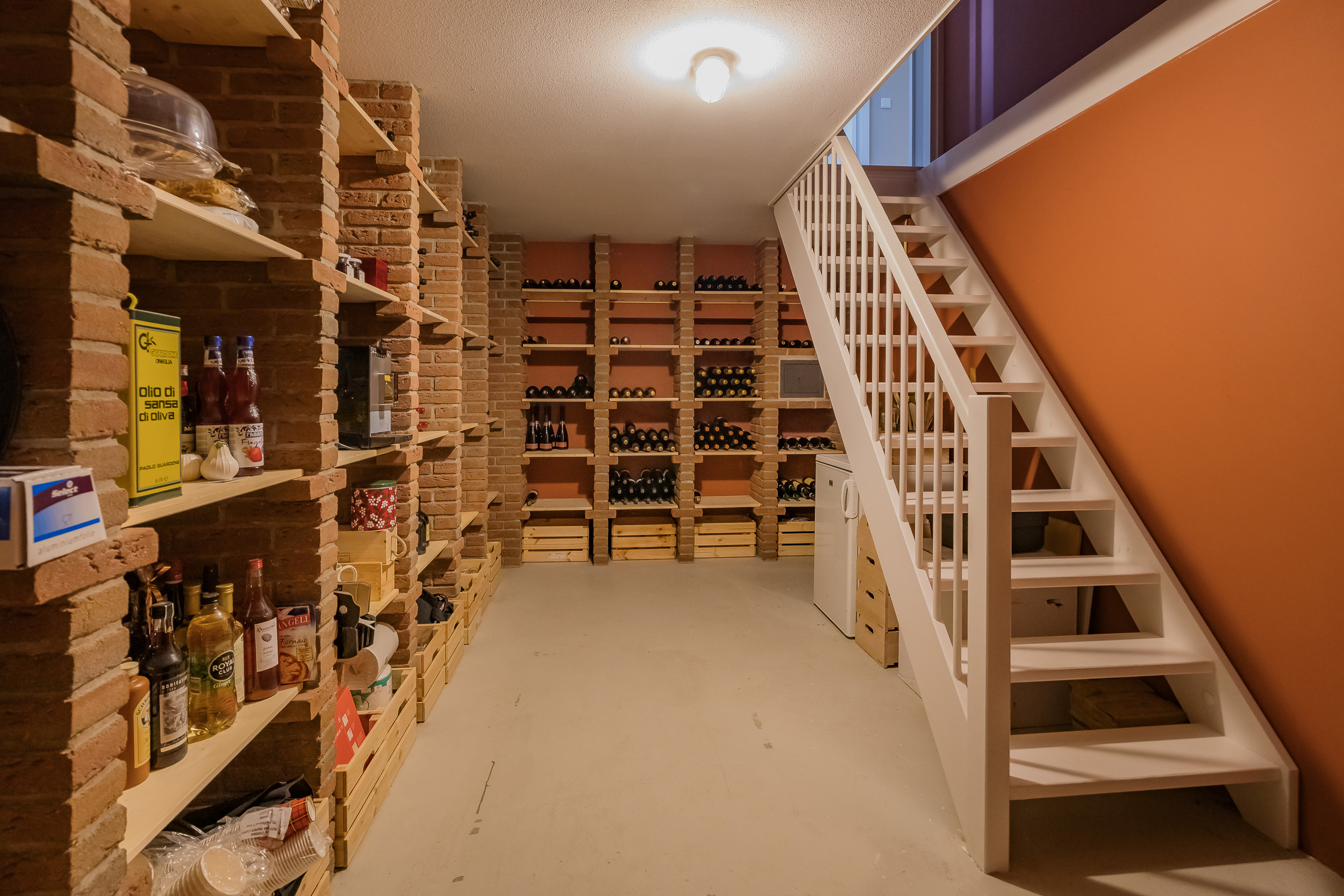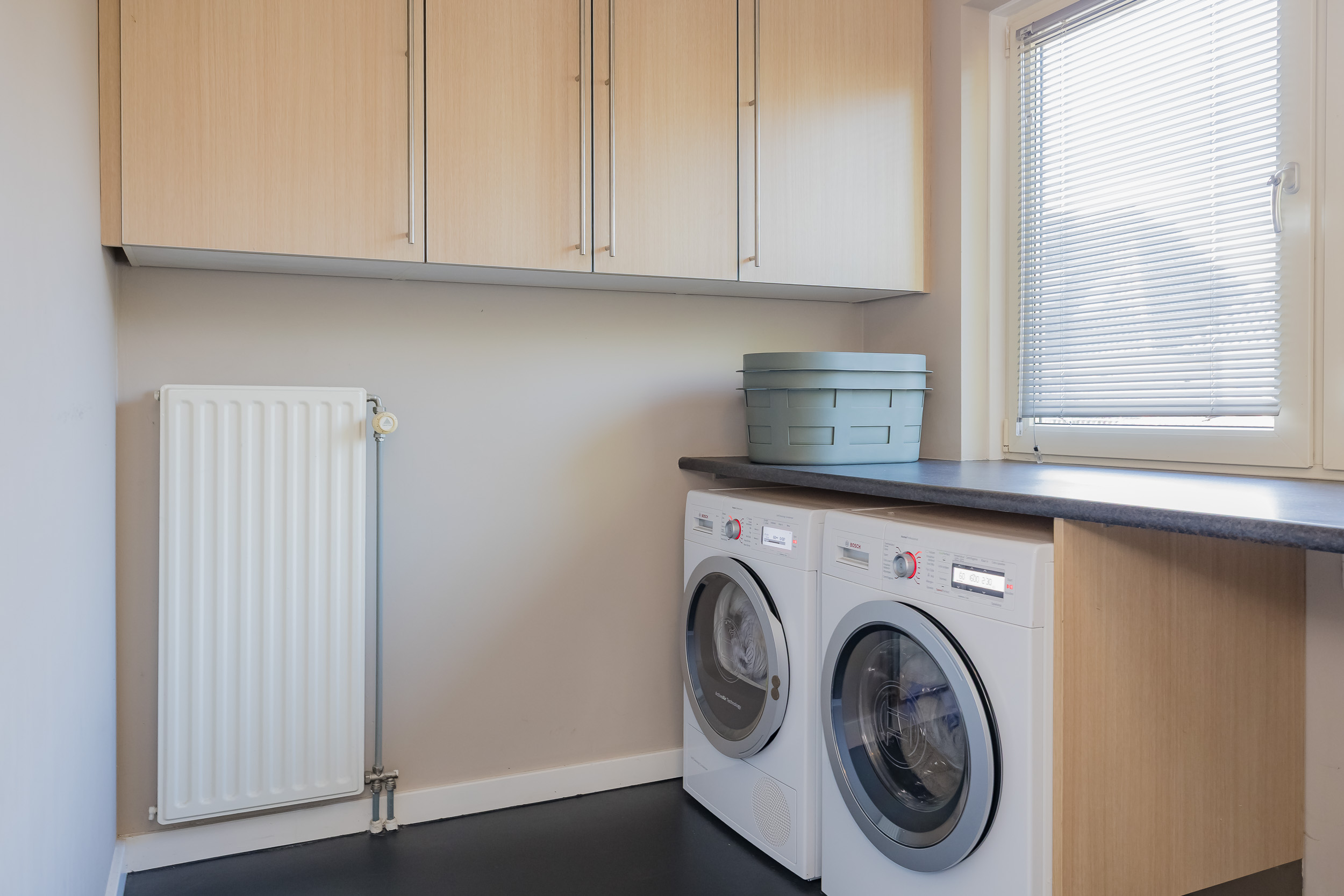 Next to the kitchen is the practical utility room, which has a kitchen unit with sink and connections for the washing machine and dryer. From here, there is access to the garage and the deck terrace with mooring. A fixed staircase leads to the spacious, dry basement (2.29 m high!), ideal as extra storage space or wine cellar.