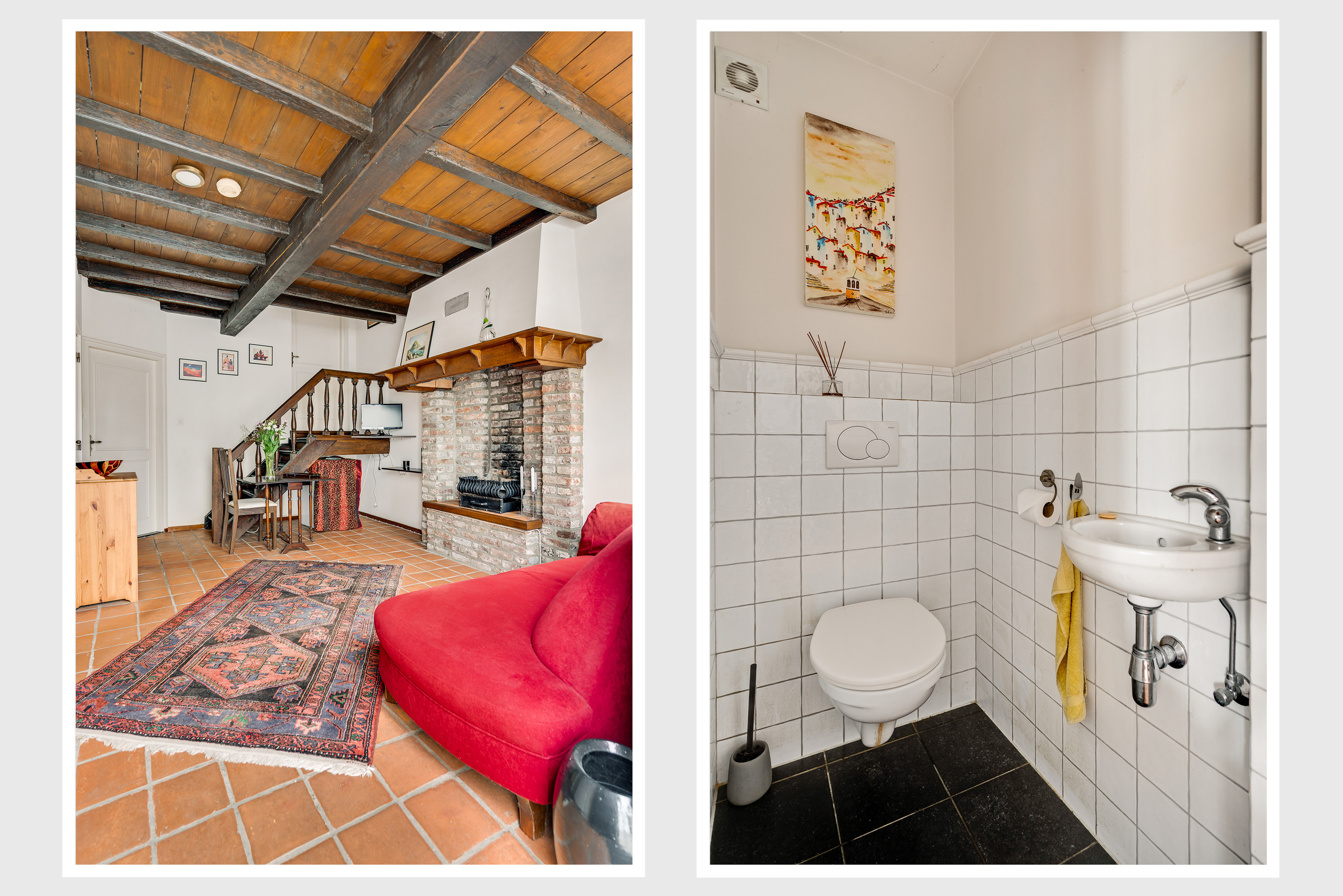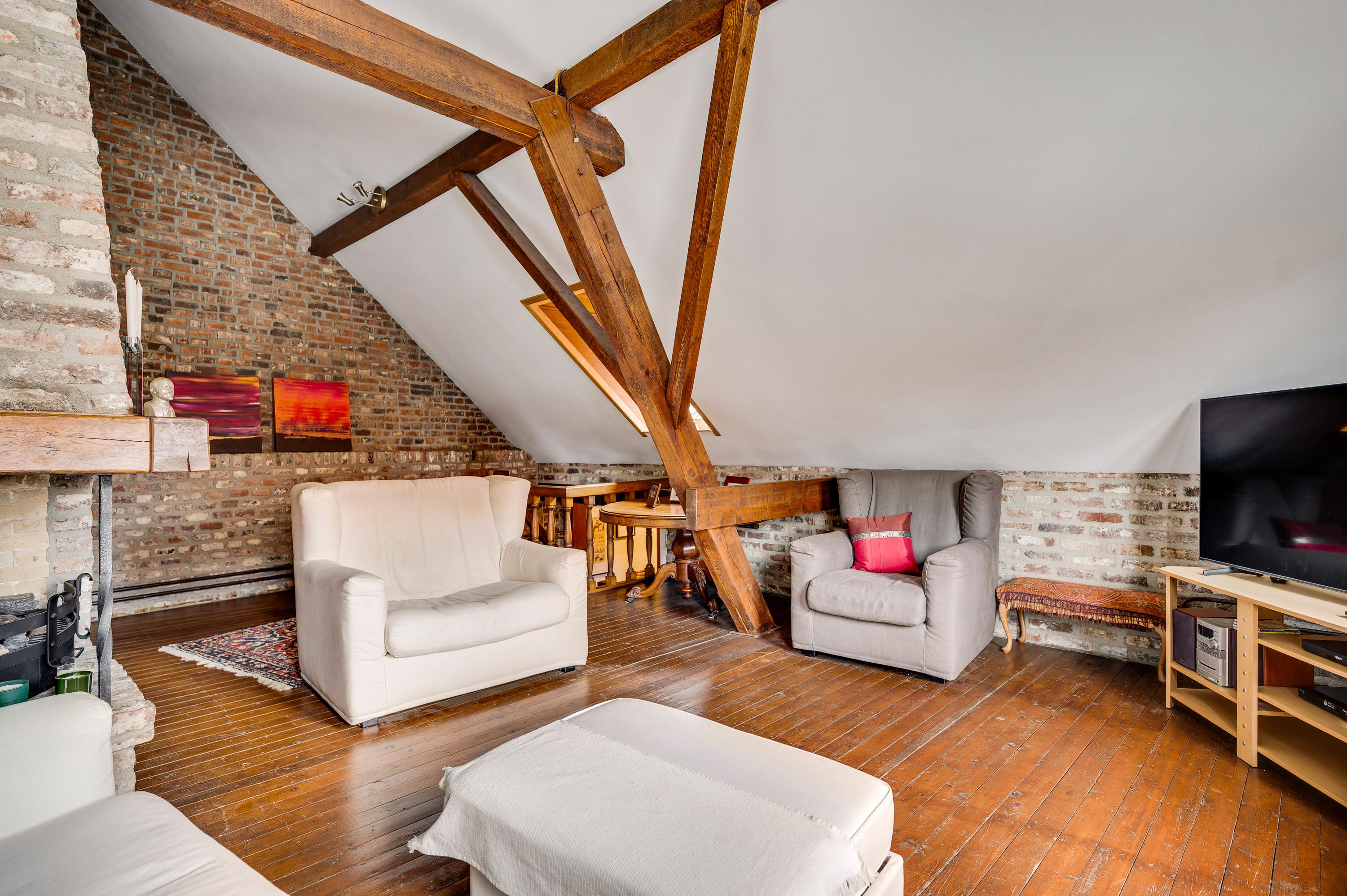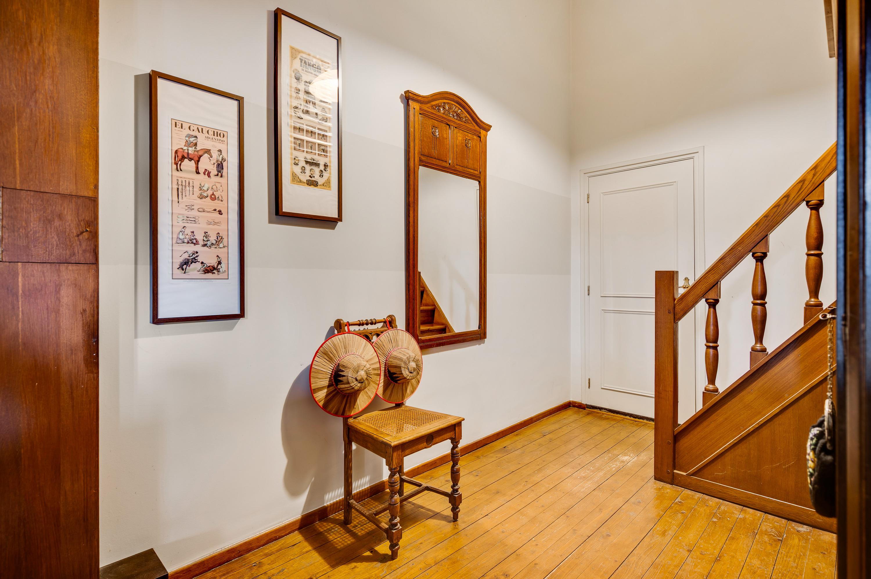 The spacious hall with a fireplace and meter cupboard provides access to the toilet, a bedroom with a separate bathroom, and the kitchen. The stairs to the first floor are also accessible from the hall. The hall also served as the B&B's former living room. This space can be used for various purposes.