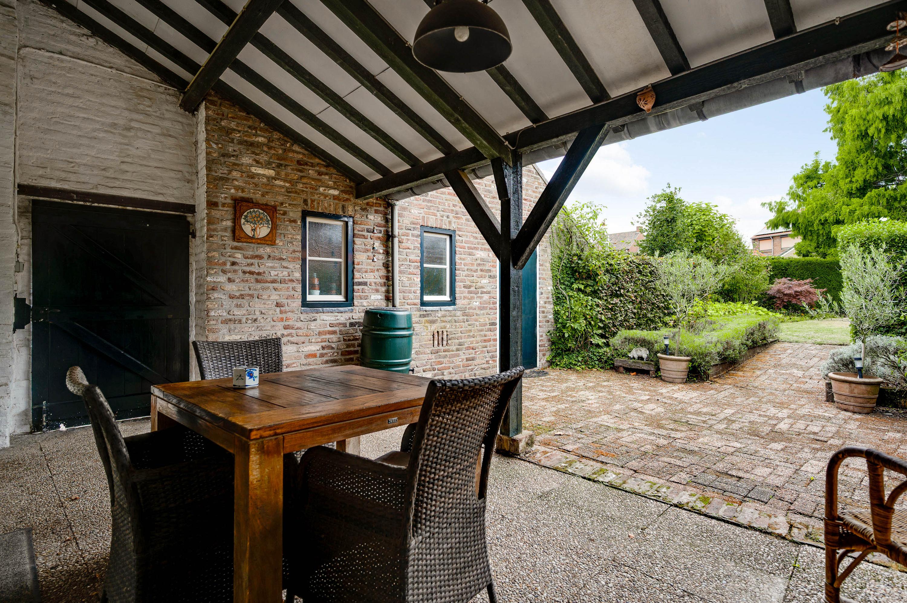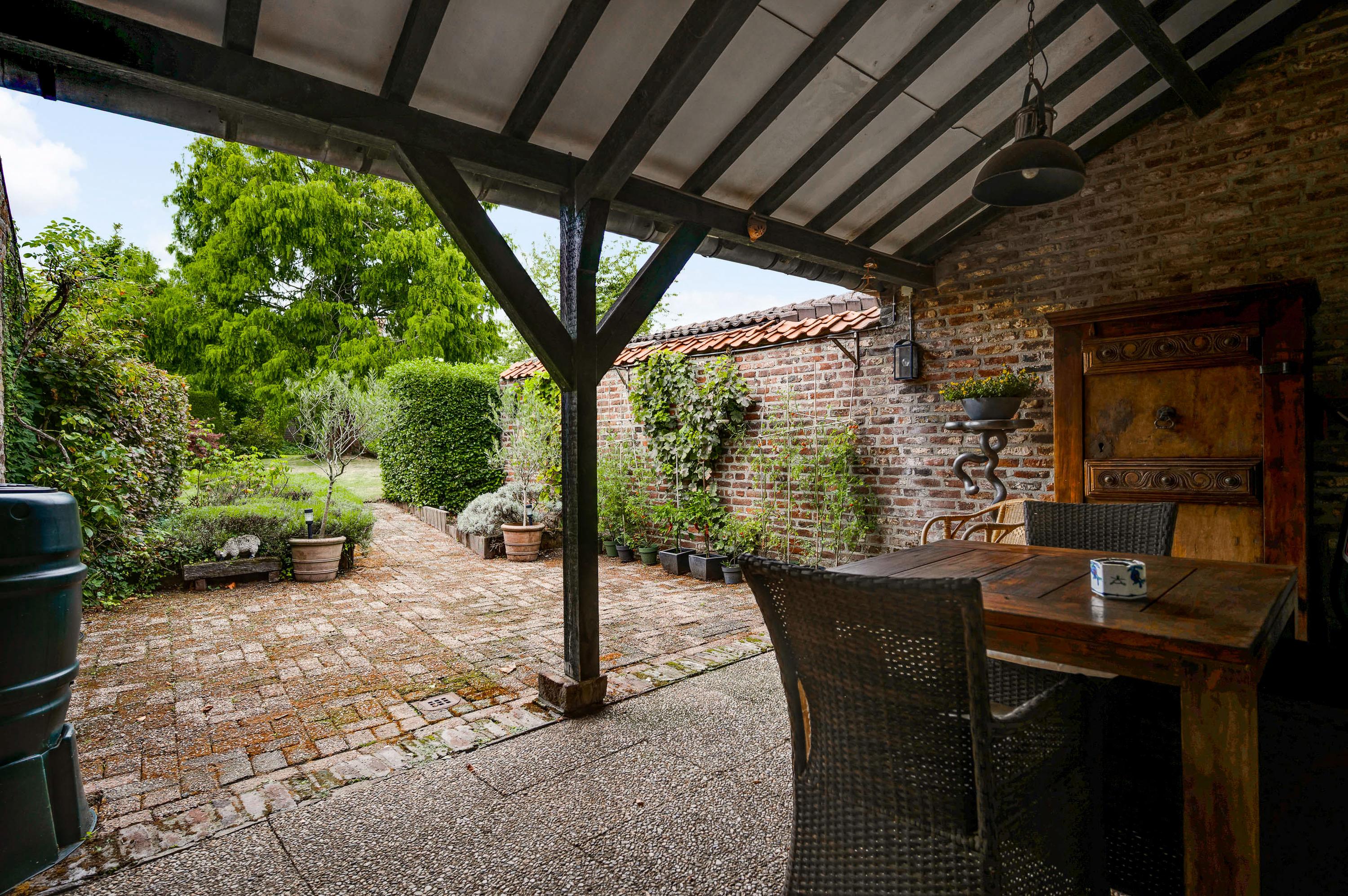 The garden seamlessly blends in with the house and offers plenty of privacy, despite its central location in the historic town center. The back garden is accessible via a private rear entrance and features several patios – one of which is covered – a lawn, and attractive flower beds.