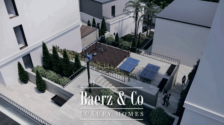 Located on the first floor, the apartment features a bright living room with kitchen and dining area, one bedroom, a bathroom, and a terrace. The turnkey concept delivers bespoke interiors curated by ANSER & Partners, furnished with pieces by Old Hara, and complemented by integrated household appliances and smart home systems. Every detail, from Villeroy & Boch fixtures to Samsung WindFree climate control, is designed for understated comfort and technological ease.