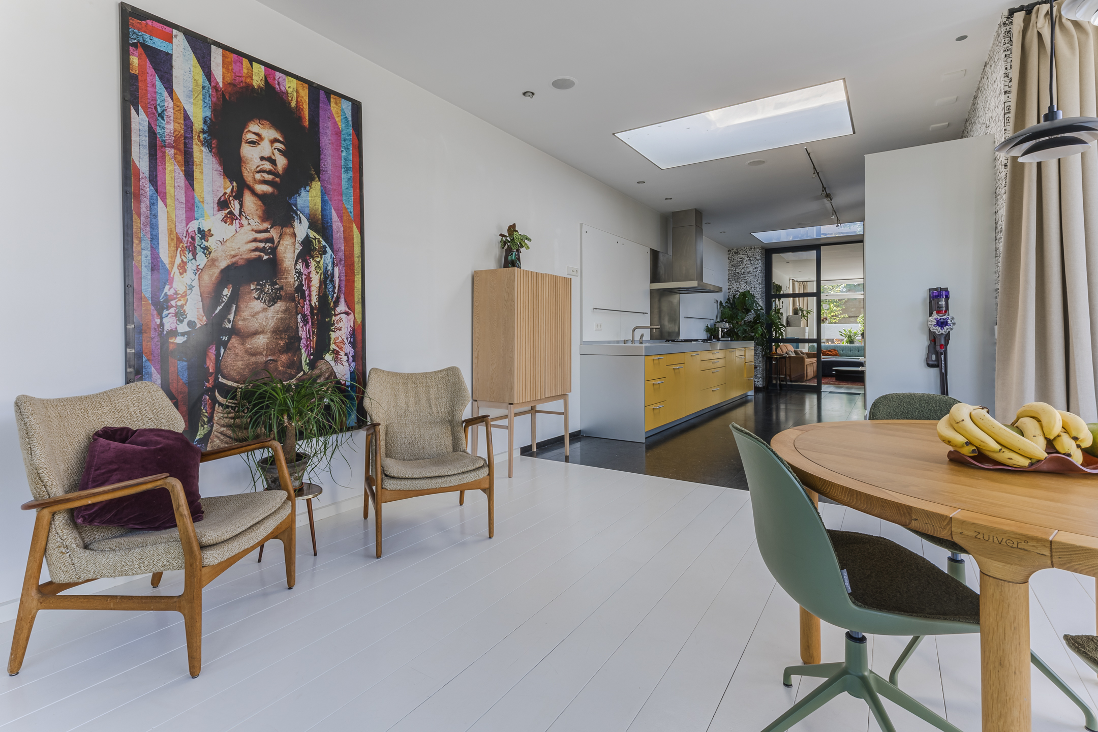 The modern, luxurious kitchen is both stylish and functional, offering generous space and beautiful views of the garden—perfect for relaxed dining. The kitchen is equipped with built-in appliances including a ceramic oven, combination oven-microwave, steam oven, American-style fridge (with water connection) and a Quooker tap. Provisions are also in place for a built-in coffee machine.