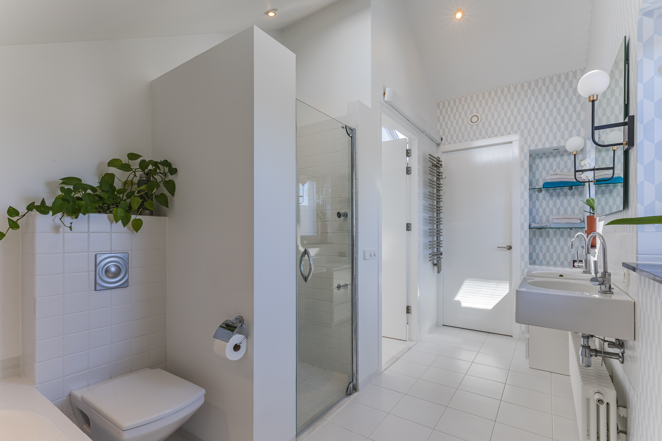 The tiled bathroom features underfloor heating, a bathtub, walk-in shower, wall-mounted toilet, washbasin, mirror heating, and adjustable mechanical ventilation.