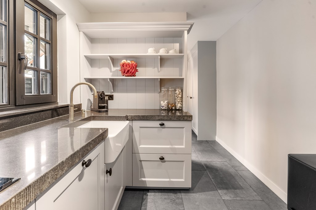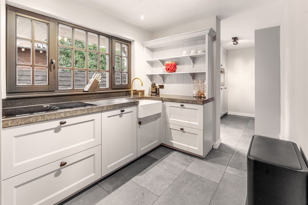 De in 2021 vernieuwde keuken is voorzien van een inductie kookplaat, oven, magnetron, vaatwasser, koelkast en een Quooker. Vanuit de keuken bereikt u de bijkeuken met praktische wandkasten, de cv-combiketel (Nefit uit 2021) en de meterkast.