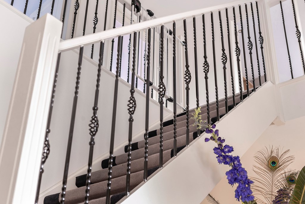 Enter via a hall highlighted by an impressive staircase—an elegant, open structure that leads to both upper floors and the basement. The hall also provides access to the tiled WC with washbasin, the utility room, and the living room.