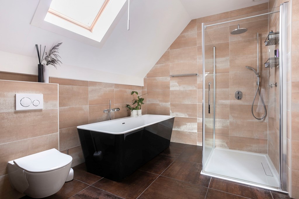 A second full bathroom (off the first-floor landing) is tiled and very complete, with bathtub, vanity, toilet, shower, and a roof window for light and ventilation.
