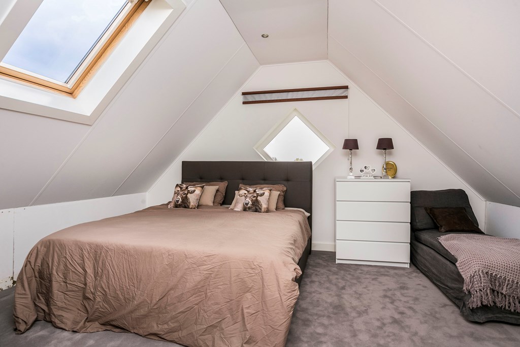 The remaining first-floor bedrooms lie to the rear, with a fourth on the side and a fifth above the garage—an inviting, spacious room under the sloped roof with dormers front and back.