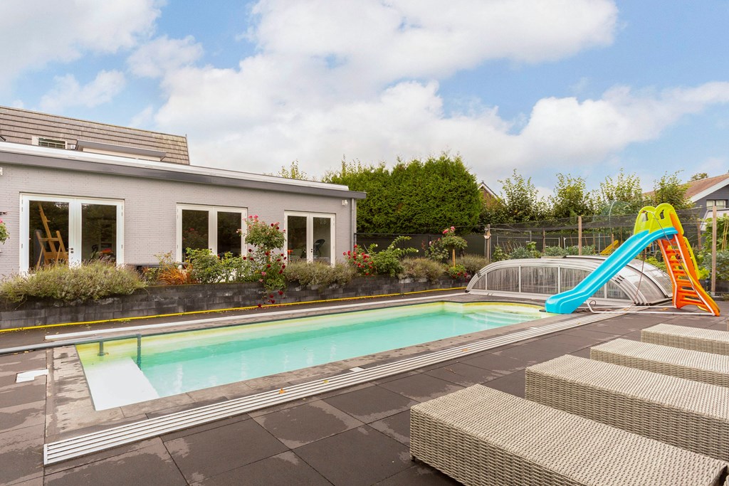 The garden-facing living room with conservatory is wonderfully bright, featuring a roof light and two pairs of French doors to the garden. The live-in kitchen is just as sunny and stands out for its generous, luxurious design. Big family or many guests? With seven bedrooms and three bathrooms, there’s room for everyone. The primary suite also features a balcony and a luxury en-suite bathroom. With a spacious, garden-facing office and a vast souterrain, the home offers countless possibilities. Add a utility room, a large back garden with play area and pool, driveway, and double garage—this is a truly unique villa.