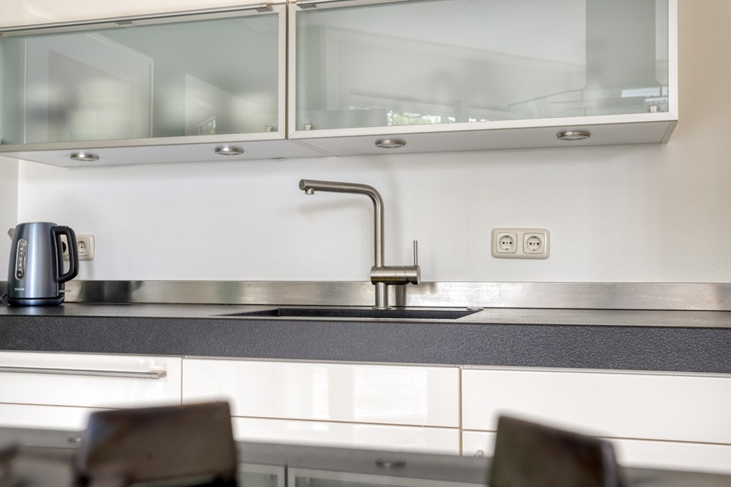 The spacious open-plan kitchen adjoins the living room. The kitchen is modern and generously designed, featuring an elongated kitchen island that invites social gatherings. It also includes a practical countertop along the wall and various built-in appliances, such as a gas stove with extractor hood, a sink, and a dishwasher. Additionally, you will find a built-in oven combination, a refrigerator, and ample storage space. This kitchen perfectly combines functionality with style and comfort.