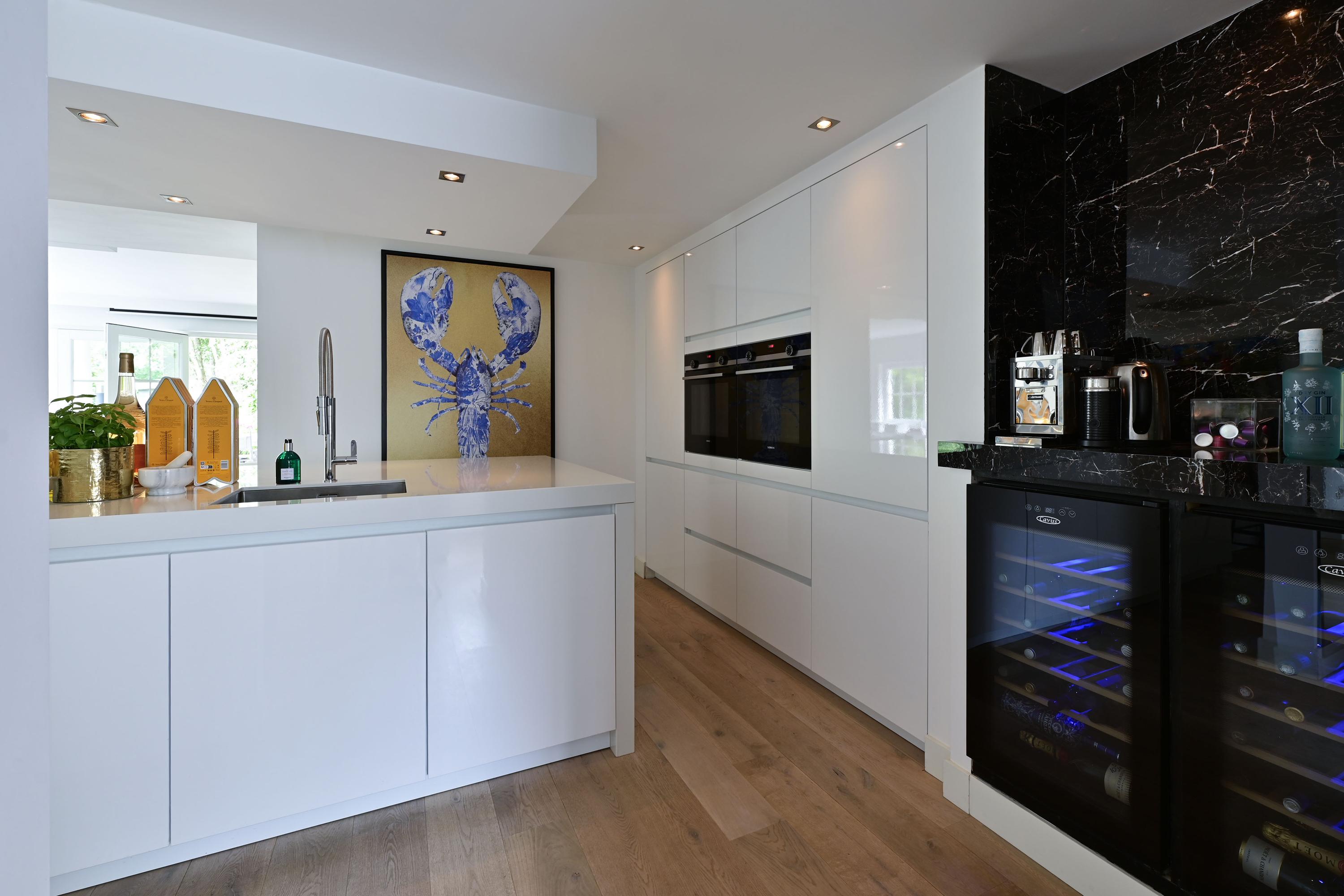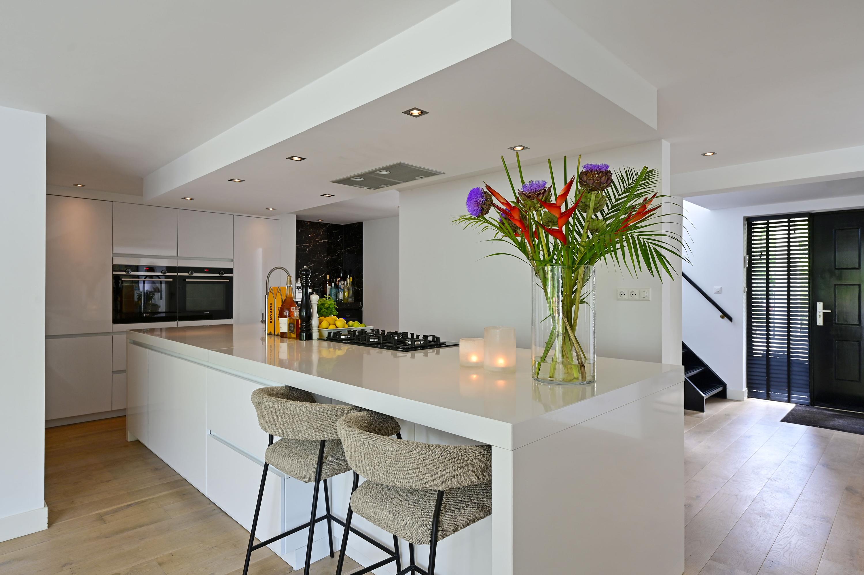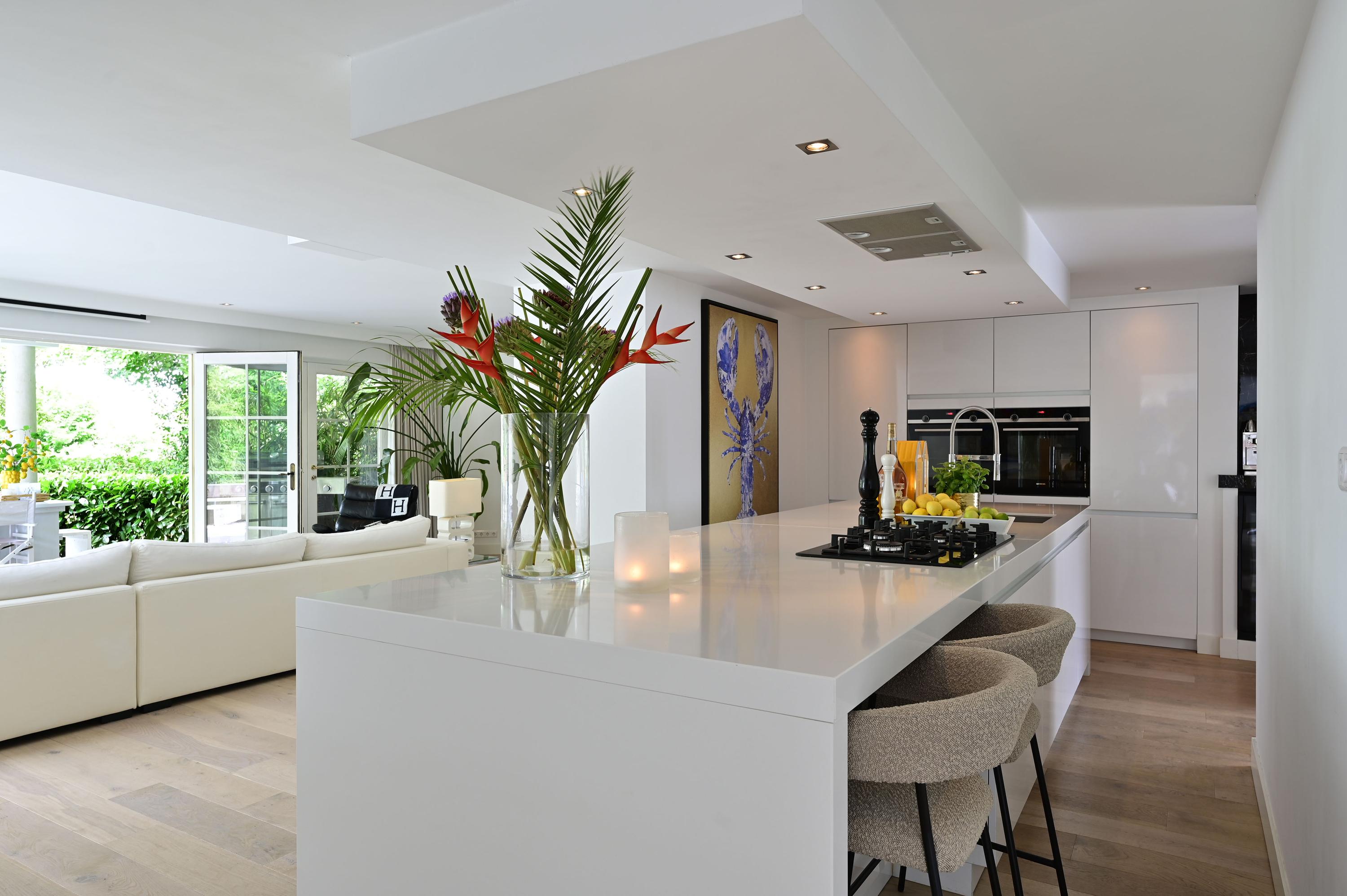 Inside, a spacious open-plan living area awaits, centered around a luxurious kitchen that flows effortlessly into a stylish lounge. This kitchen is a dream for any culinary enthusiast: a large cooking island with premium Siemens built-in appliances, two dishwashers, wine climate cabinets, and even a dedicated barista corner. Adjacent is a practical utility room with an American-style fridge, ice maker, and extra freezer.