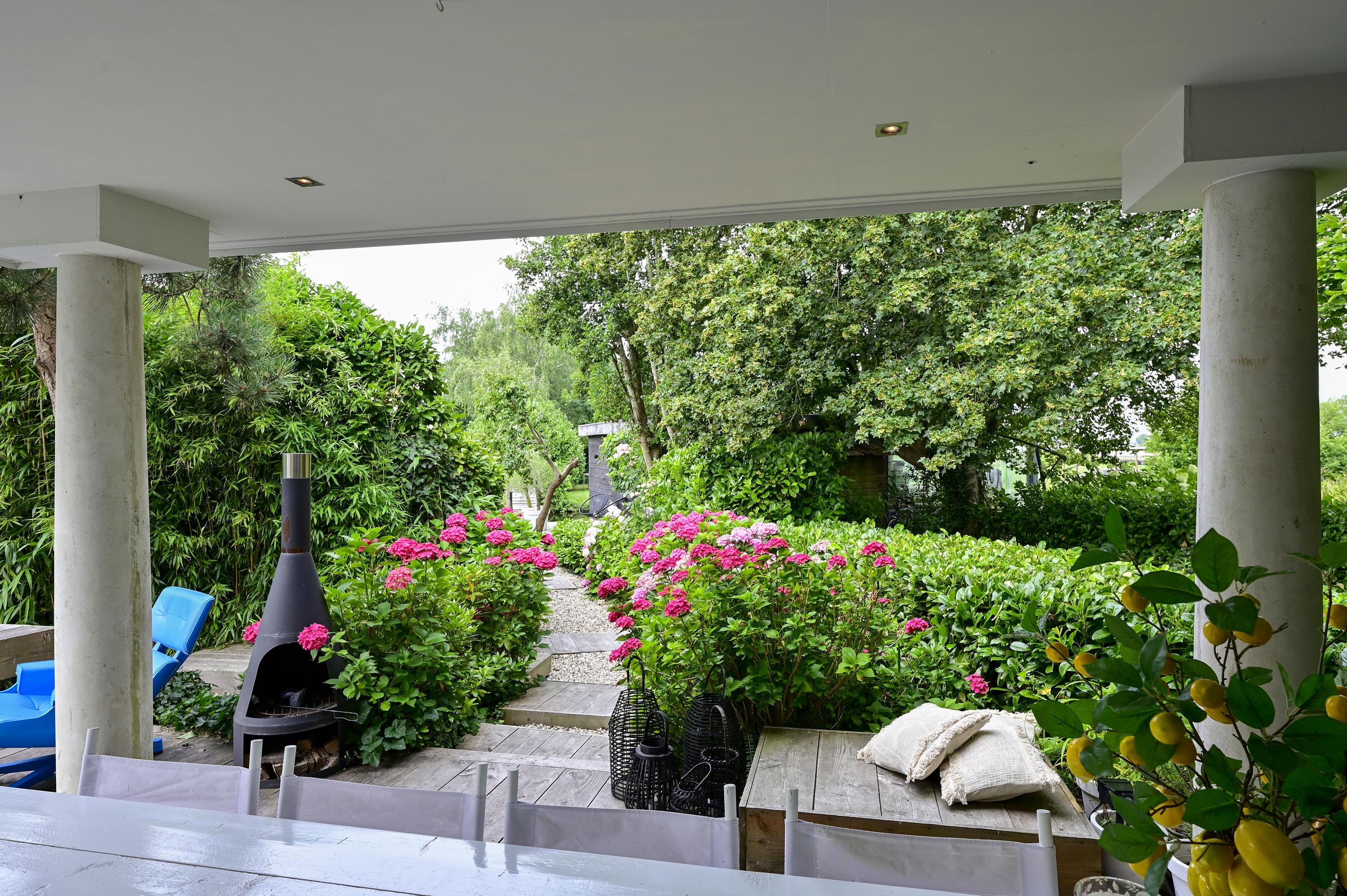 Set on a generous plot with ideal sun exposure, abundant privacy, and direct water access, this villa is a dream for outdoor living. The beautifully landscaped, low-maintenance garden features multiple terraces, a compact pool, a six-person jacuzzi, and a spacious covered patio with a BBQ and dining table – the perfect place where indoor and outdoor living blend seamlessly. A charming footbridge leads to a rented private island with a mooring spot for your boat – a rare luxury for water sports enthusiasts. Additional boat moorings are also available.