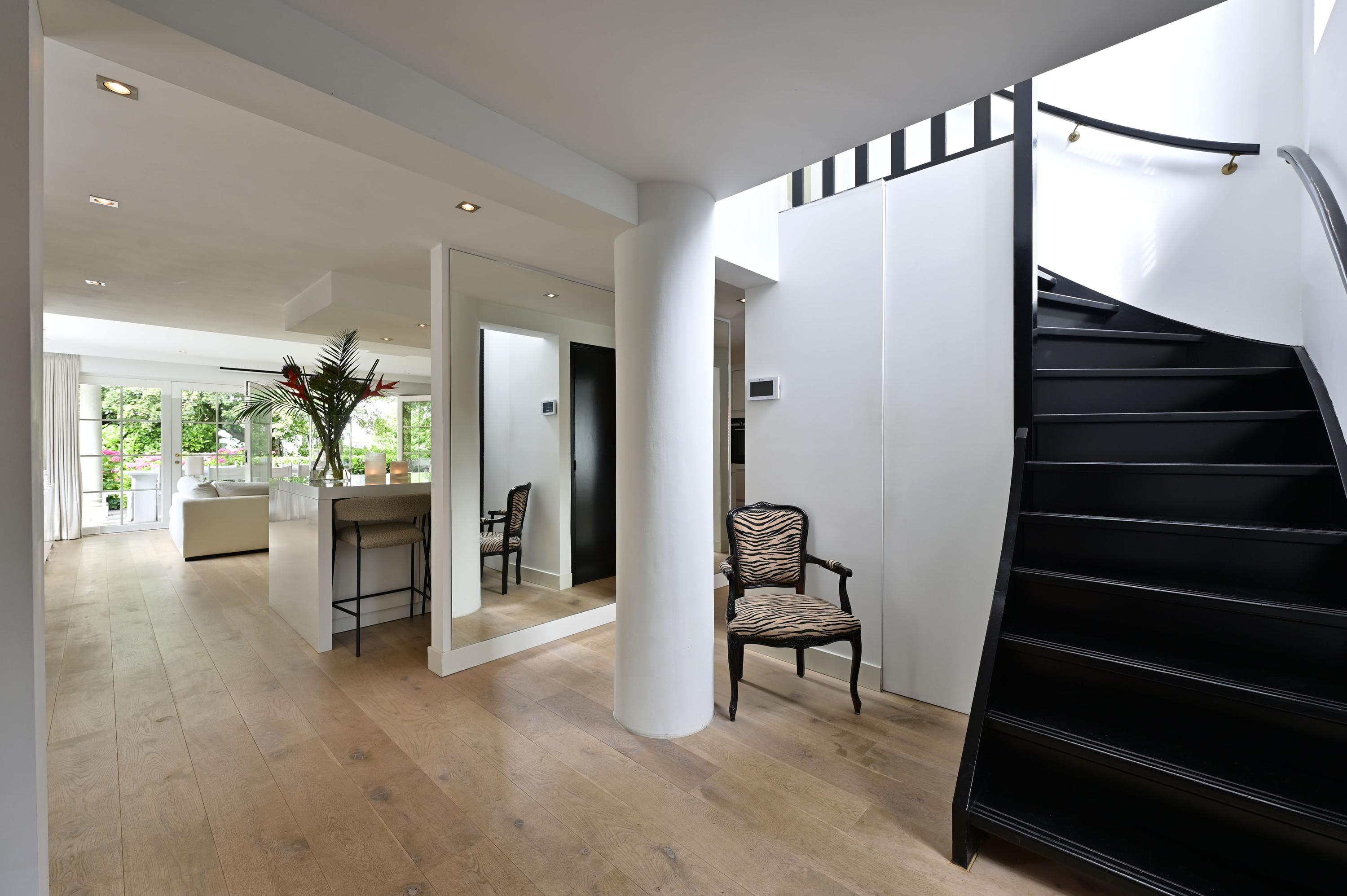 Through the spacious entrance, you step into a home where every detail has been thoughtfully considered. The generous hallway feels welcoming and open. A stylish staircase and practical built-in wardrobe under the stairs complete the space. The oak wood engineered parquet floor with underfloor heating provides both warmth and elegance.