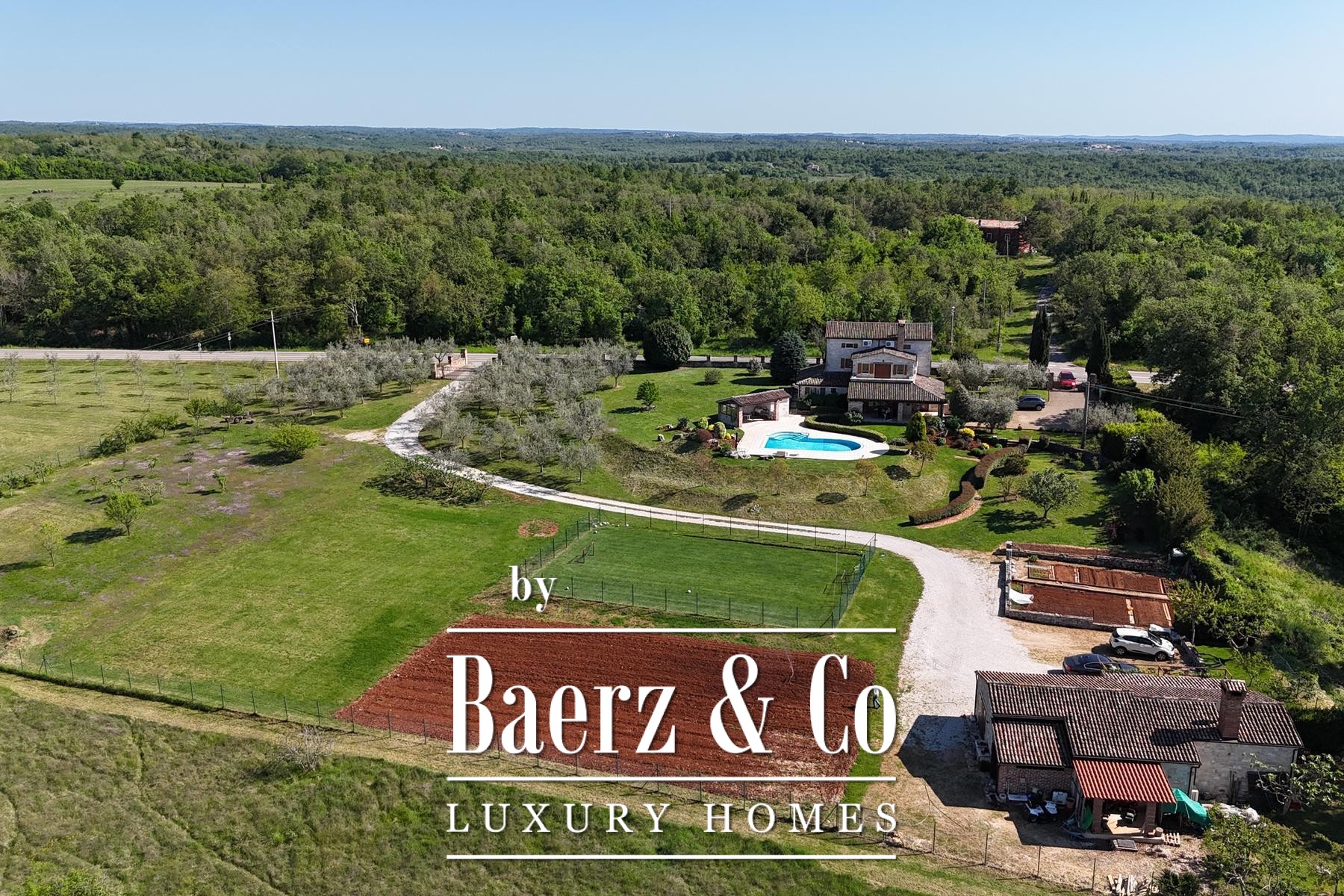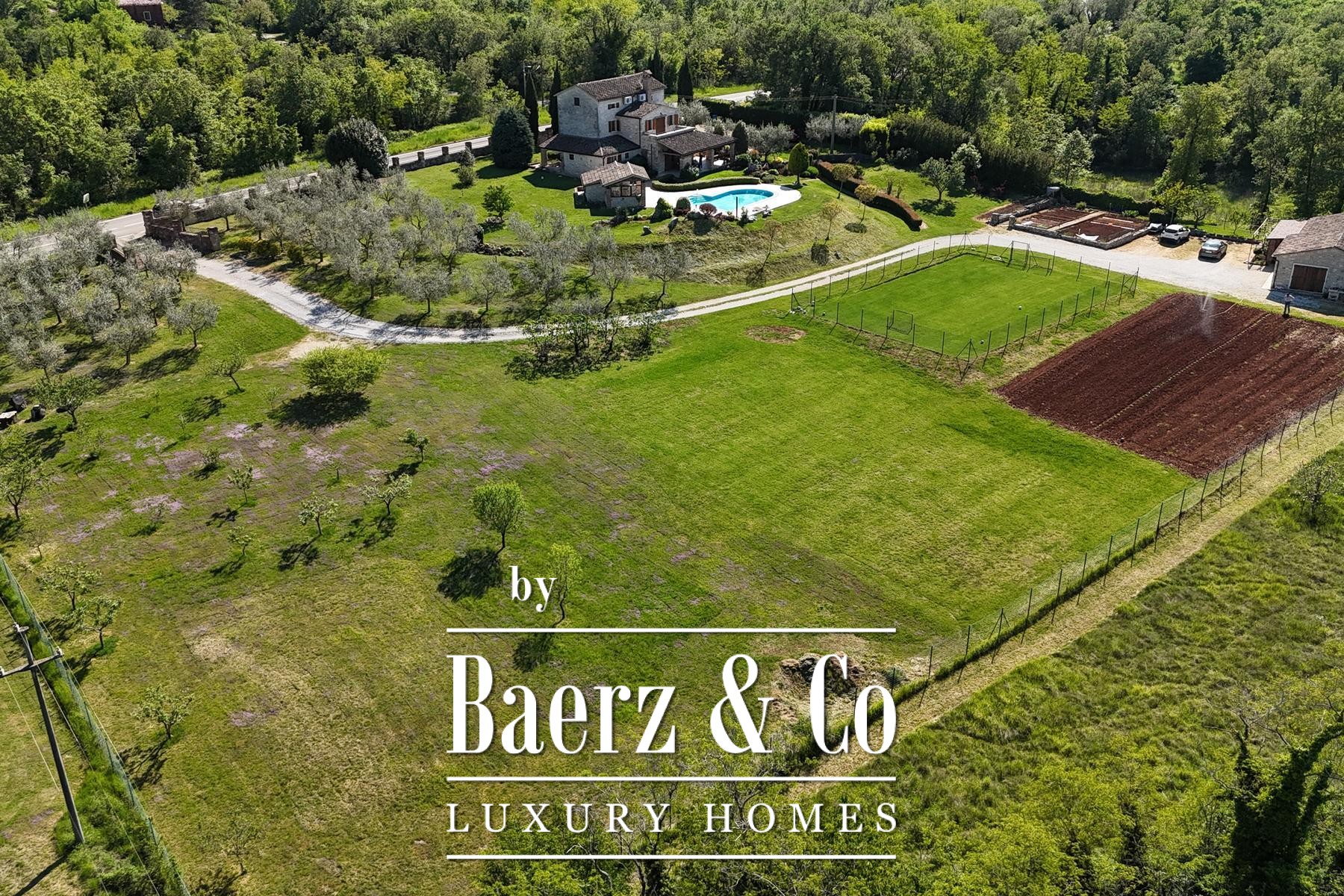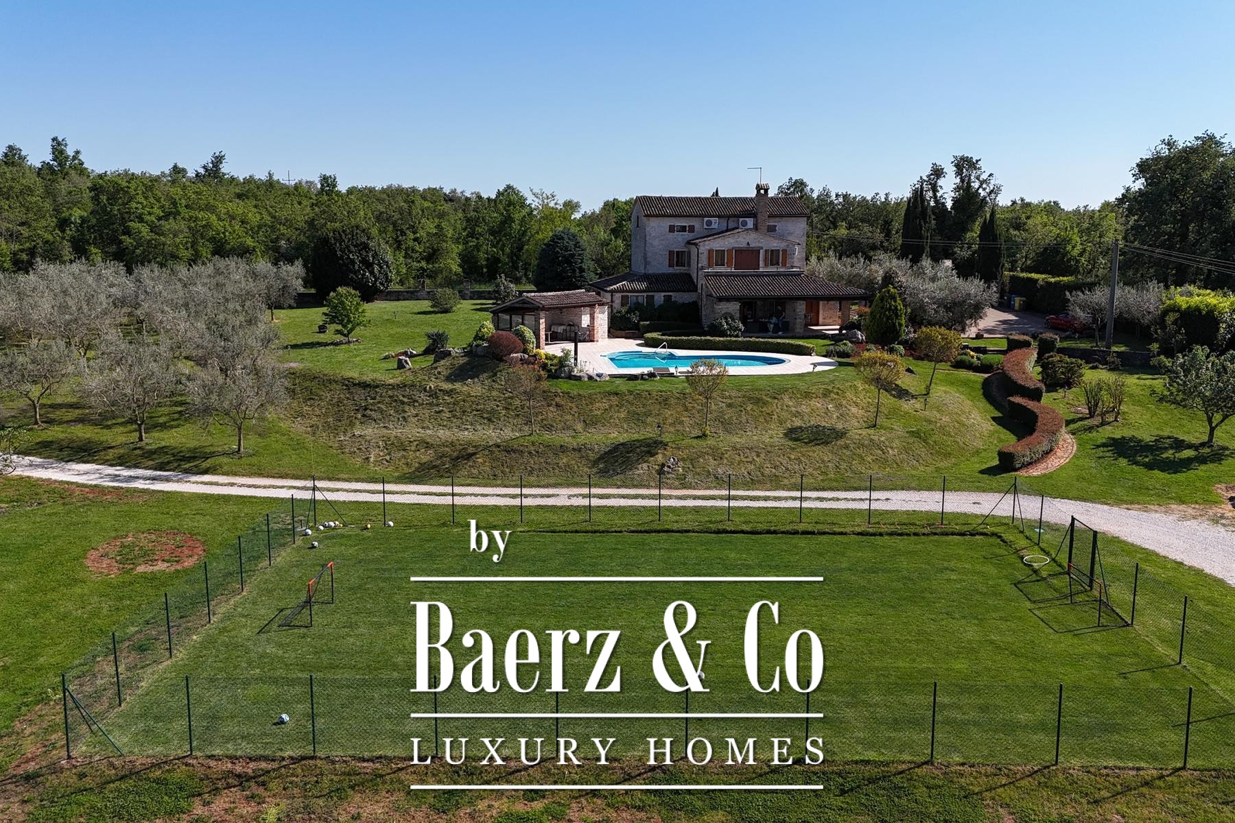 The estate encompasses a separate tavern with a fireplace and kitchen, additional parking, and space designed for wellness, fitness, or guest use. Outdoor amenities include automatic-irrigated lawns, an olive grove with approximately 110 trees, an orchard, and a football field. The grounds offer further opportunities for development, with privacy and investment potential at the forefront.