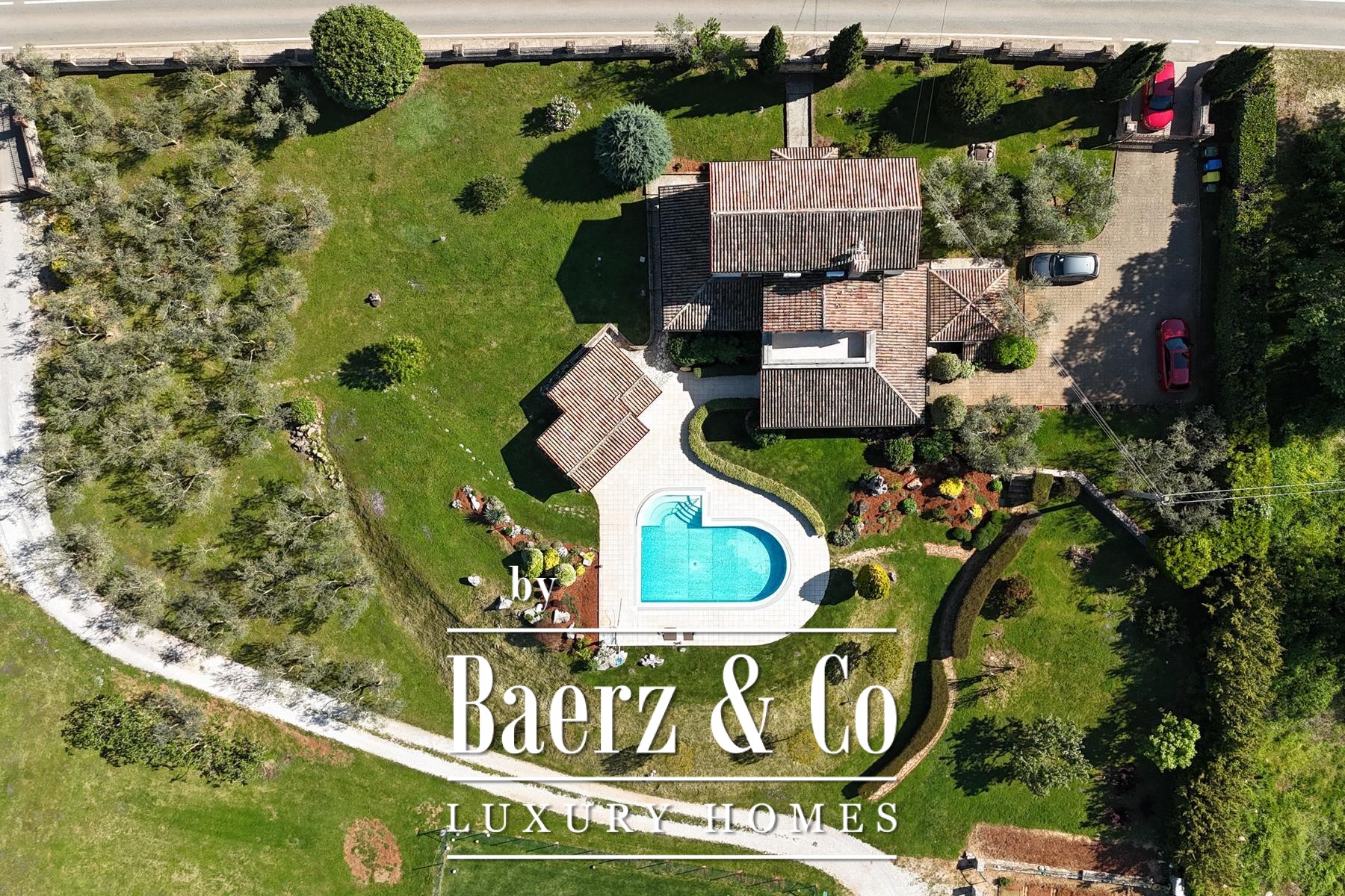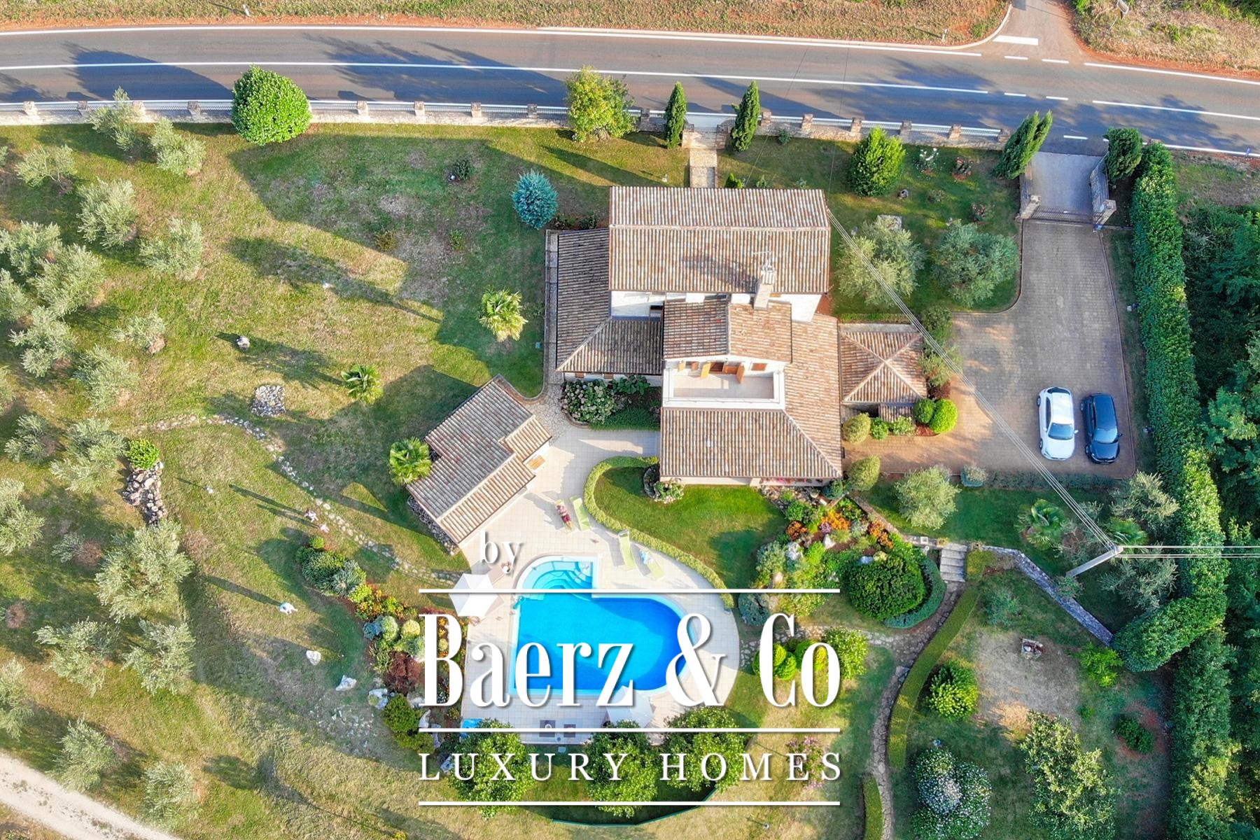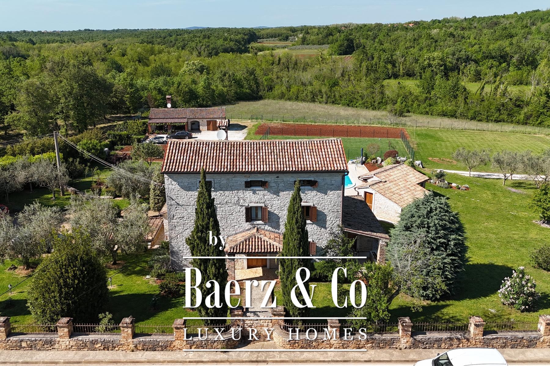 The estate encompasses a separate tavern with a fireplace and kitchen, additional parking, and space designed for wellness, fitness, or guest use. Outdoor amenities include automatic-irrigated lawns, an olive grove with approximately 110 trees, an orchard, and a football field. The grounds offer further opportunities for development, with privacy and investment potential at the forefront.