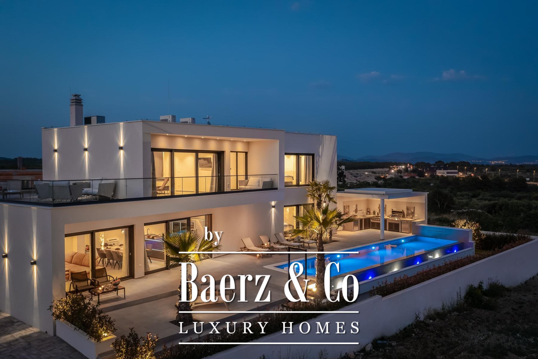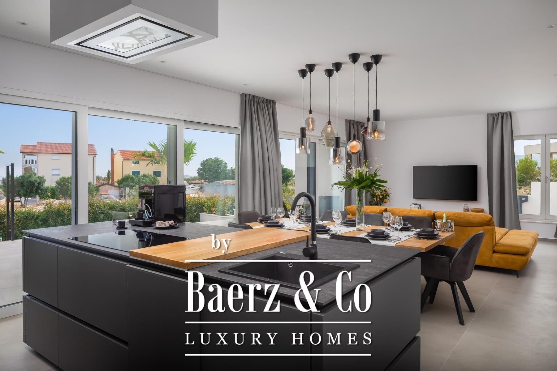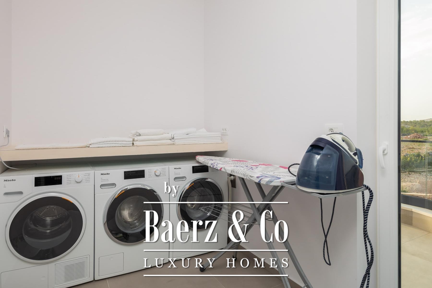 Architectural quality is evident throughout, from Miele appliances and a central vacuum system to underfloor heating, aluminum joinery, and smart home control. Prepared for future solar installation, equipped for electric vehicles, and enclosed by a tranquil garden with further parking, this modern villa for sale in Vodice aligns modern amenity with lasting design.