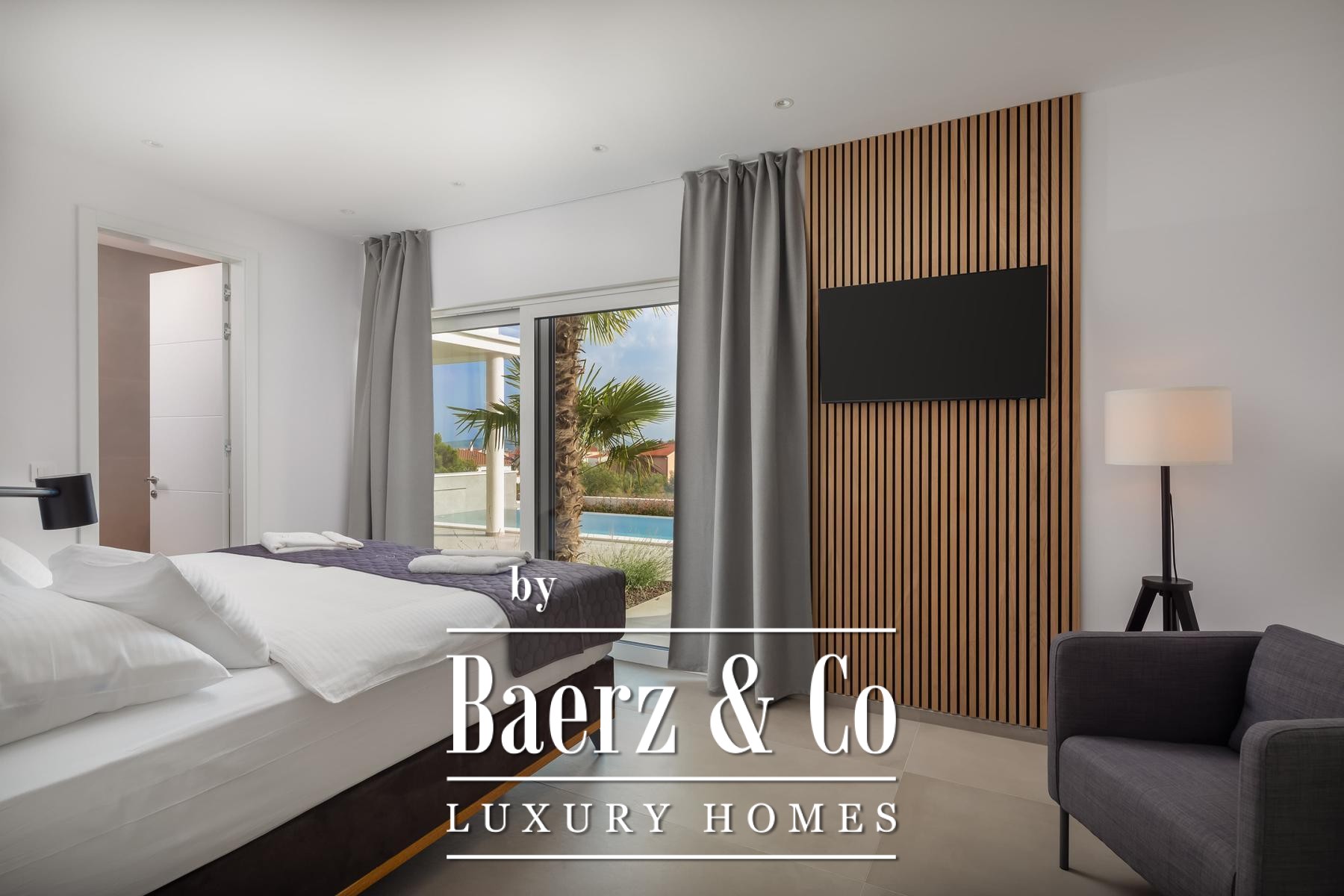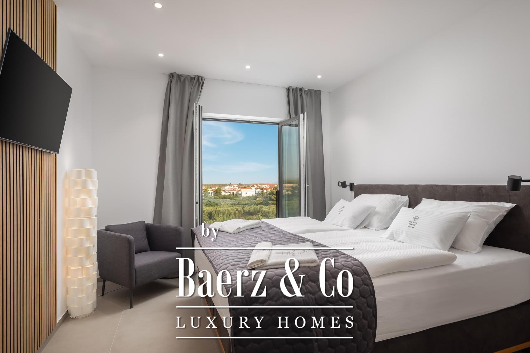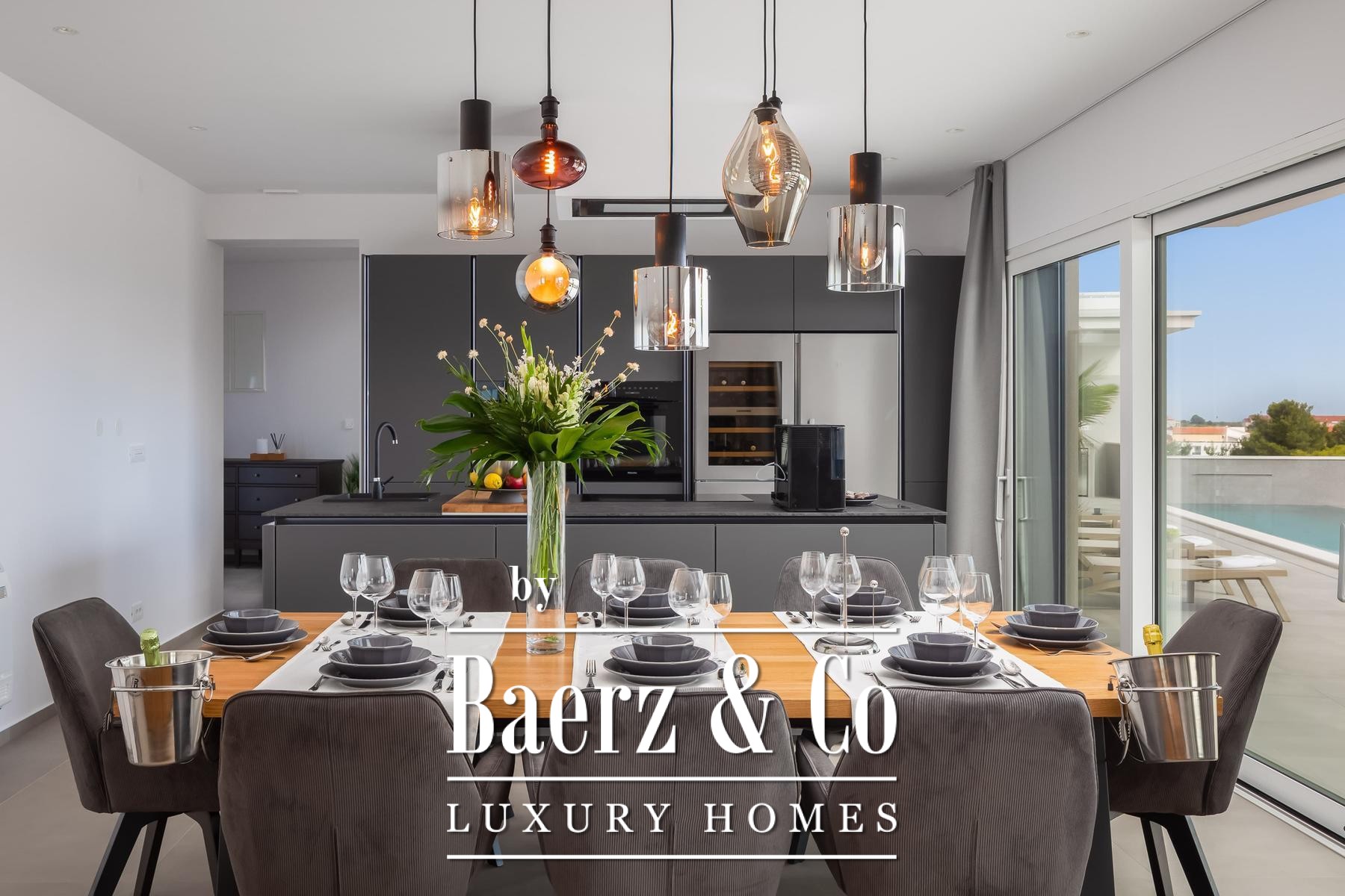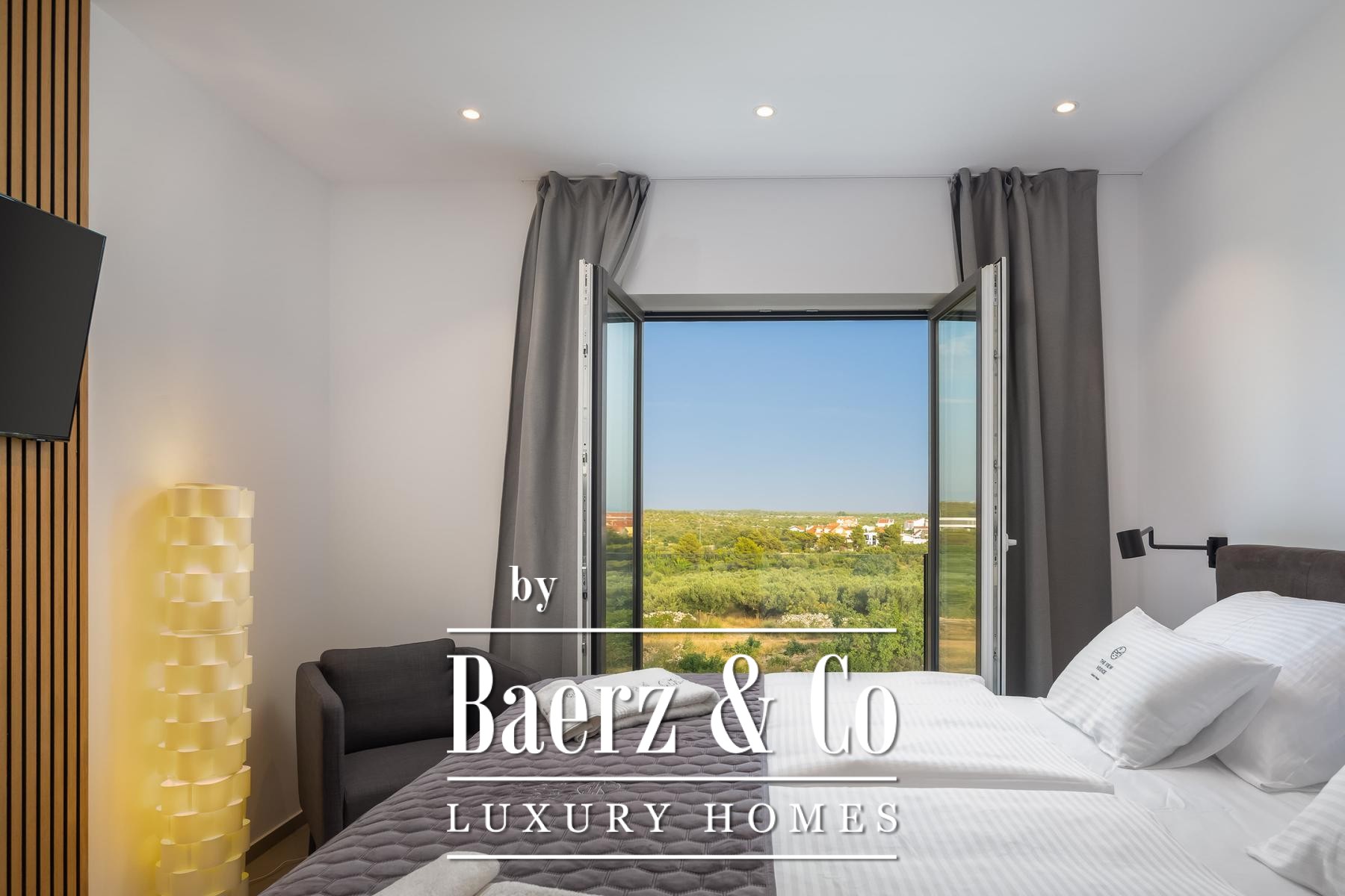 Architectural quality is evident throughout, from Miele appliances and a central vacuum system to underfloor heating, aluminum joinery, and smart home control. Prepared for future solar installation, equipped for electric vehicles, and enclosed by a tranquil garden with further parking, this modern villa for sale in Vodice aligns modern amenity with lasting design.