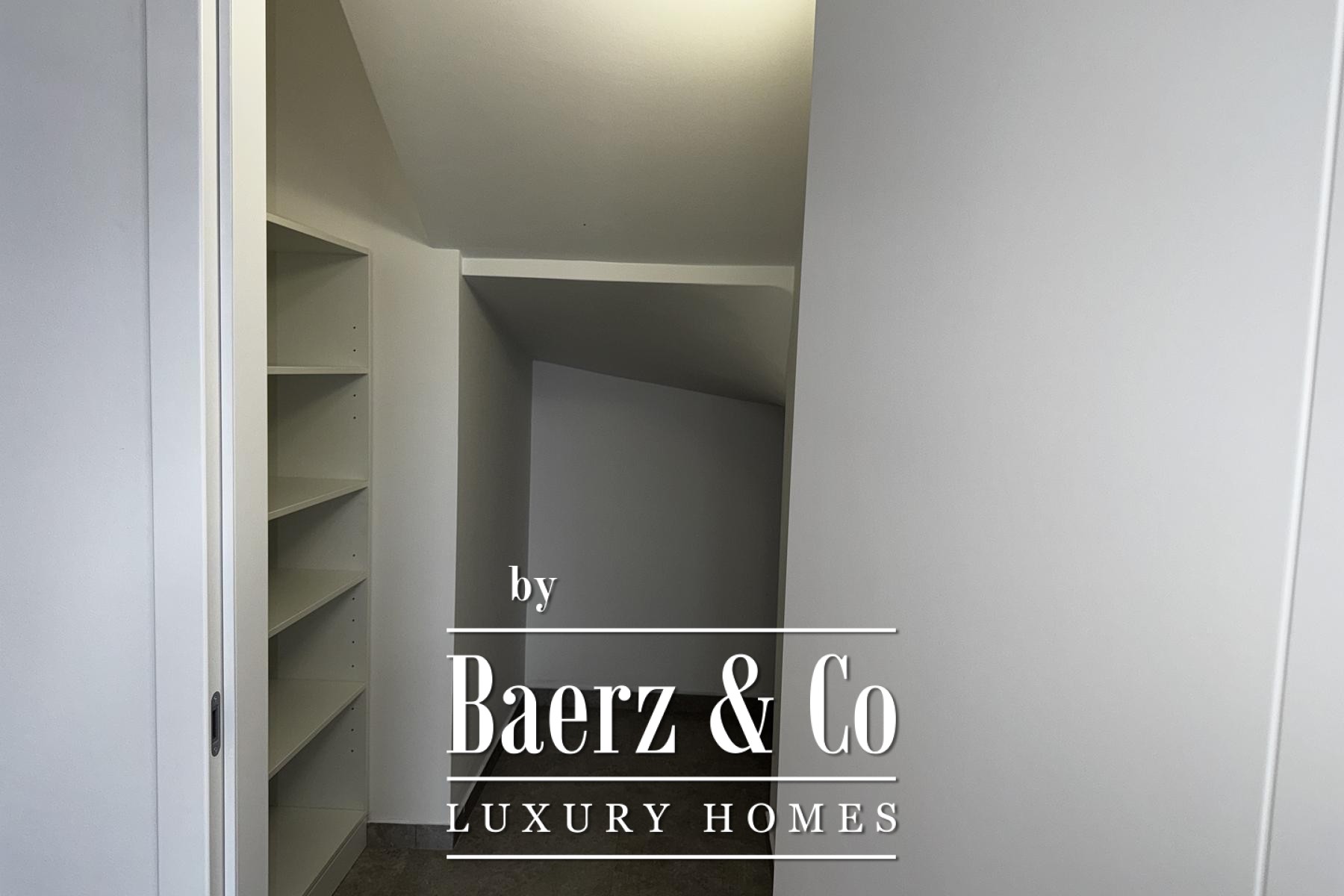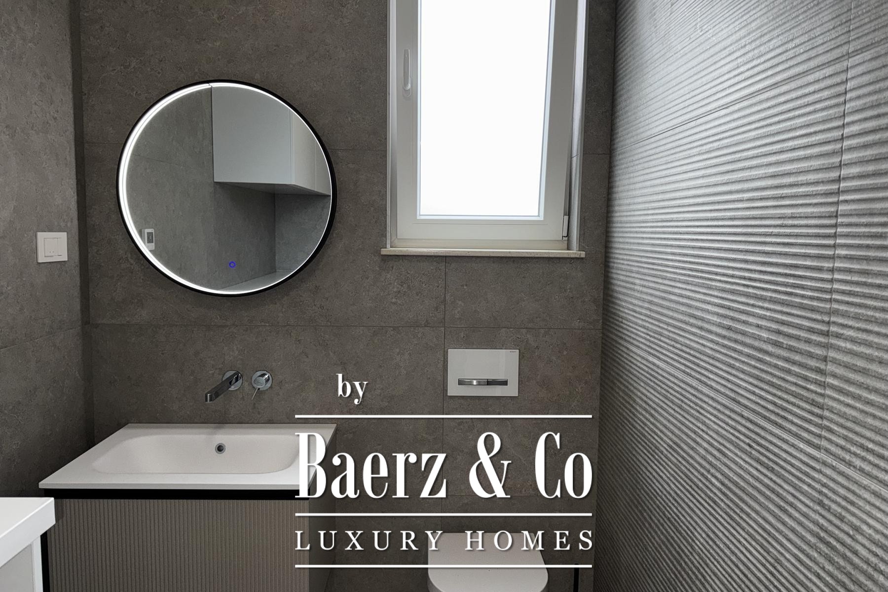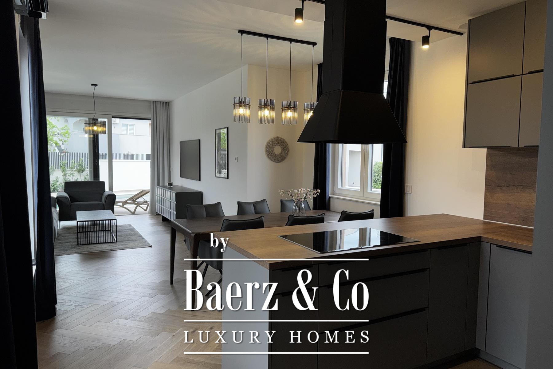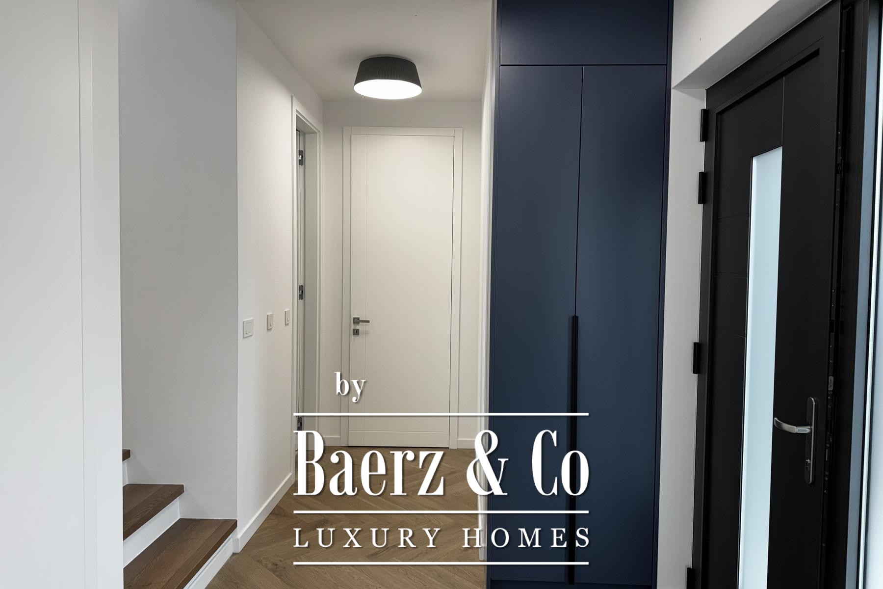 Upstairs, three bedrooms, including a master suite with walk-in wardrobe and a secondary suite with private bathroom and terrace access, deliver a thoughtful balance of privacy and light. Rich materiality abounds: three-layer parquet flooring, solid wood stairs, full-height doors, and quality finishes establish an atmosphere of understated elegance.
