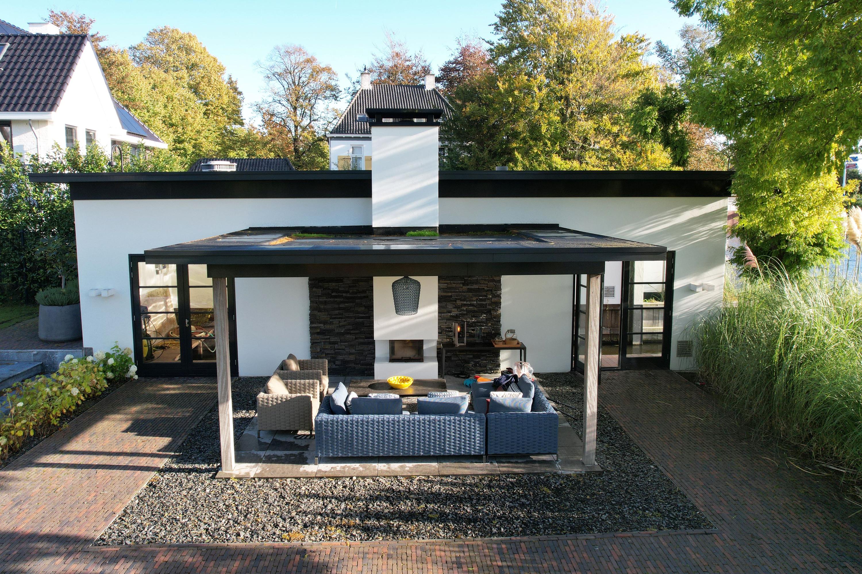 Gardens designed by a landscape architect frame terraces and a 53 m² boathouse with remote-controlled lift, enabling private access to Dutch waterways. An adjacent covered veranda with wood-burning fireplace allows year-round enjoyment outdoors.