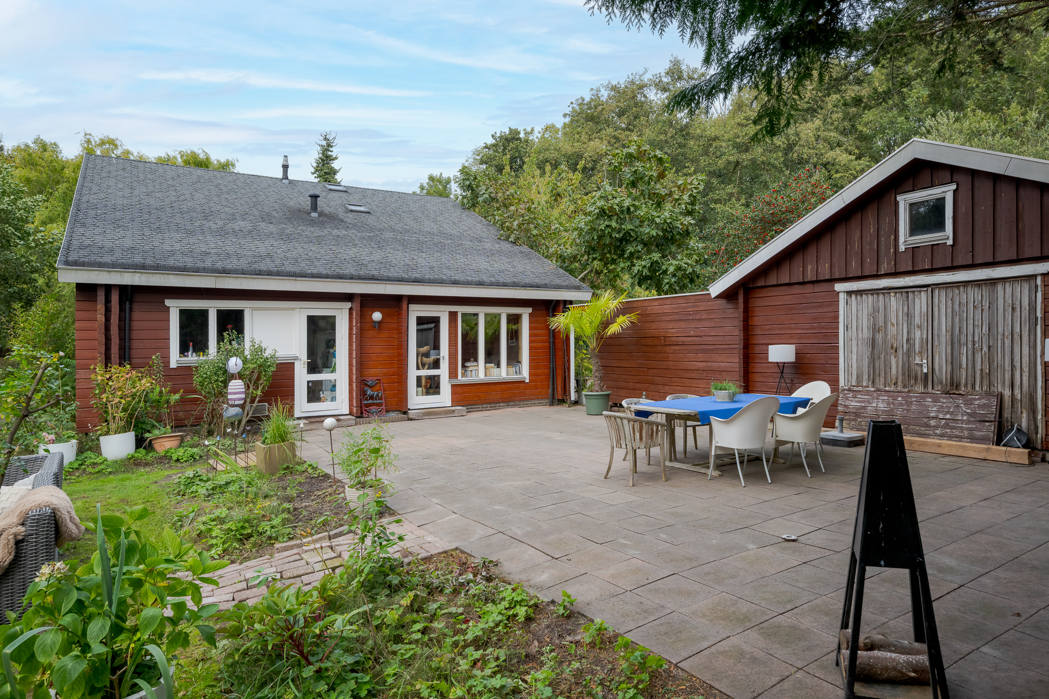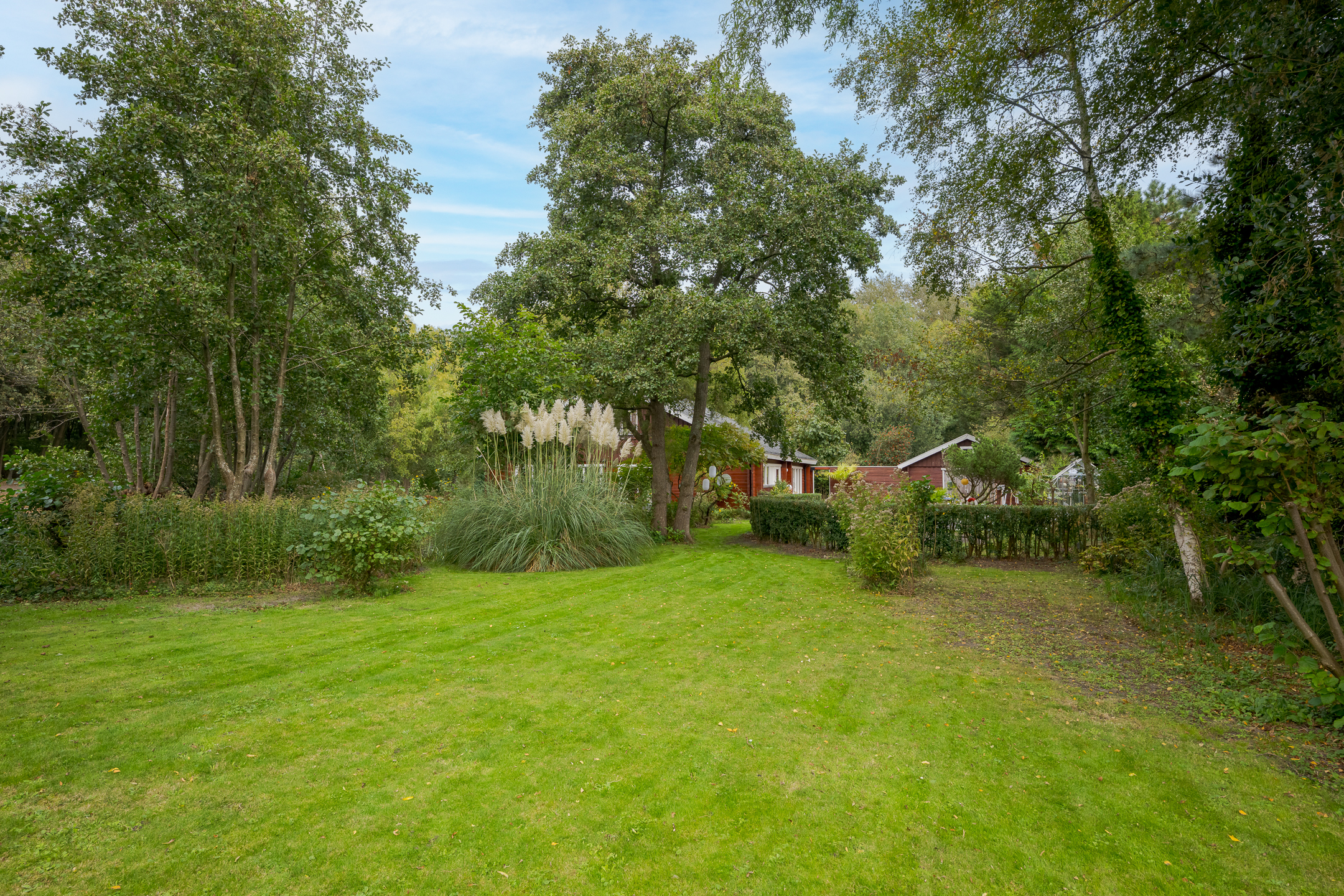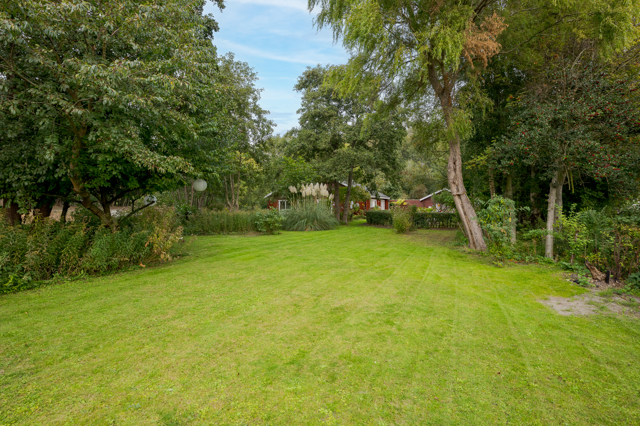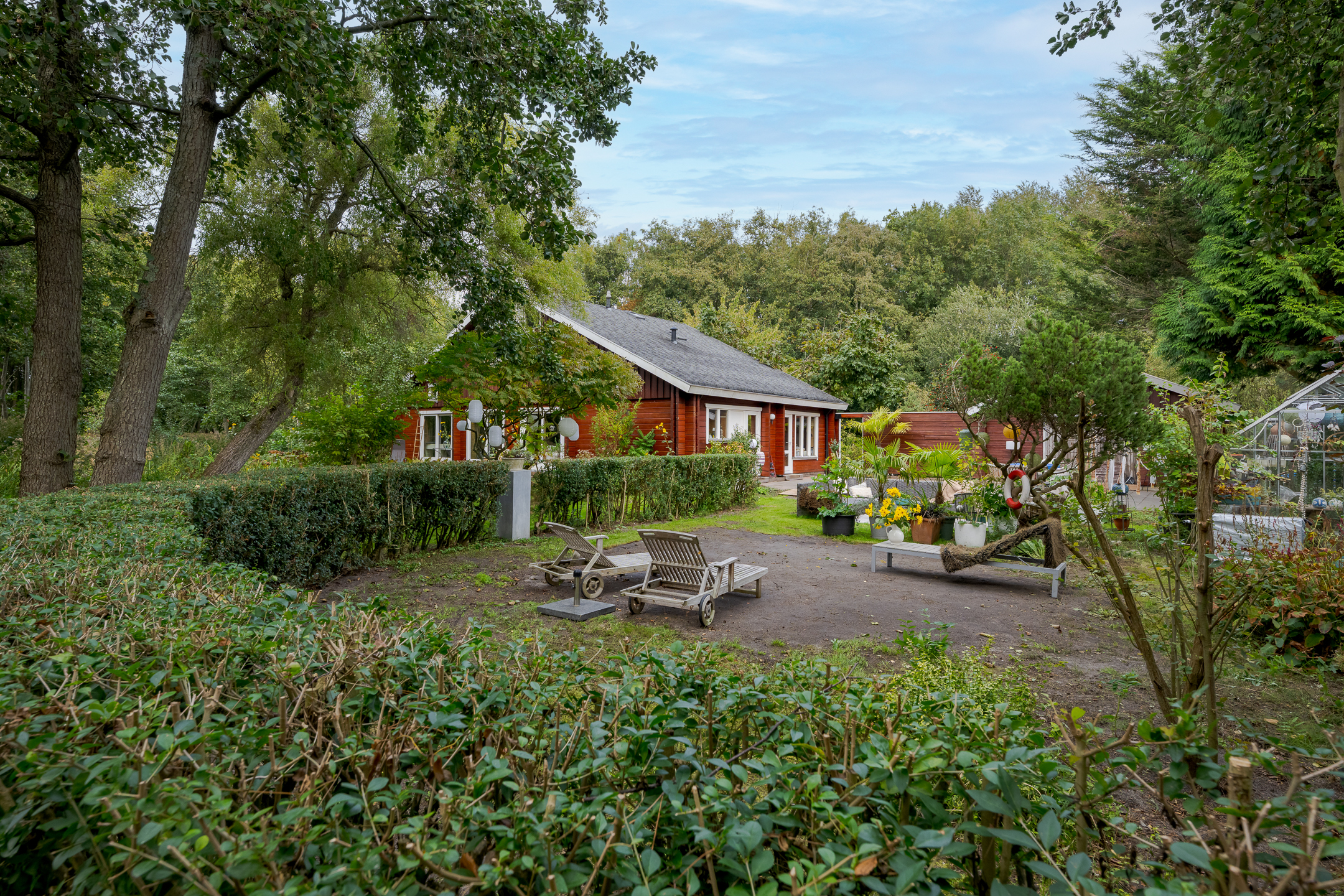 In the front yard, a spacious wooden garage (approximately 6 by 12 meters) sits perpendicular to the house, creating a courtyard with ample parking for several cars. But the real action is behind the house: the garden is over 50 meters deep and borders a tranquil lake with a view of a bird island.