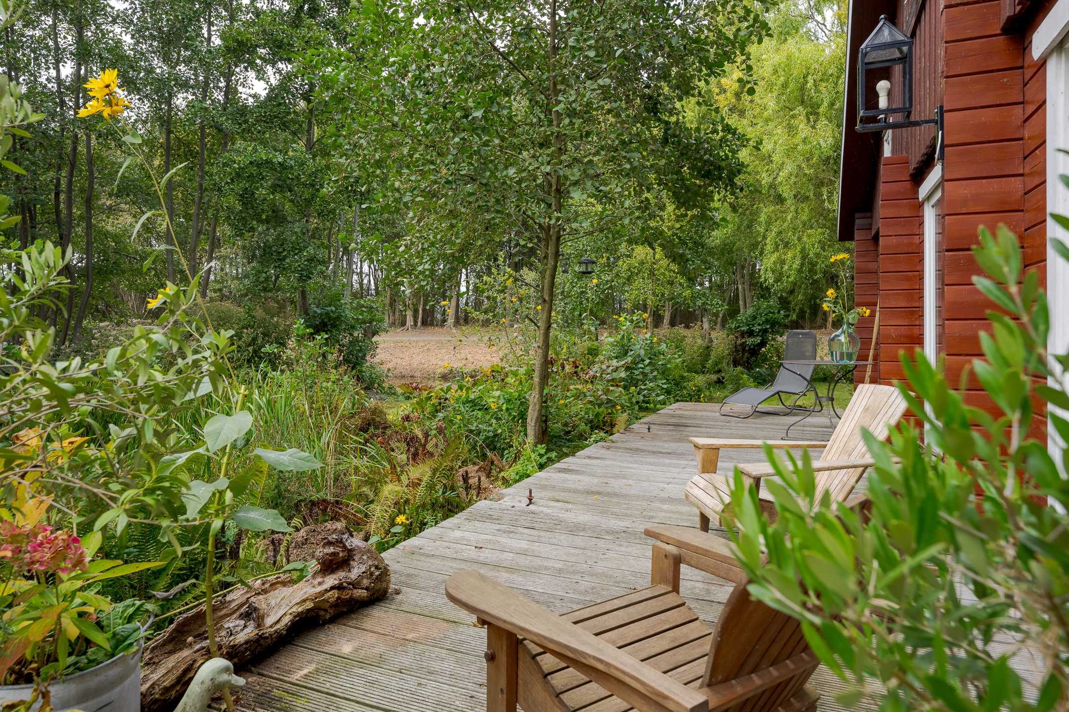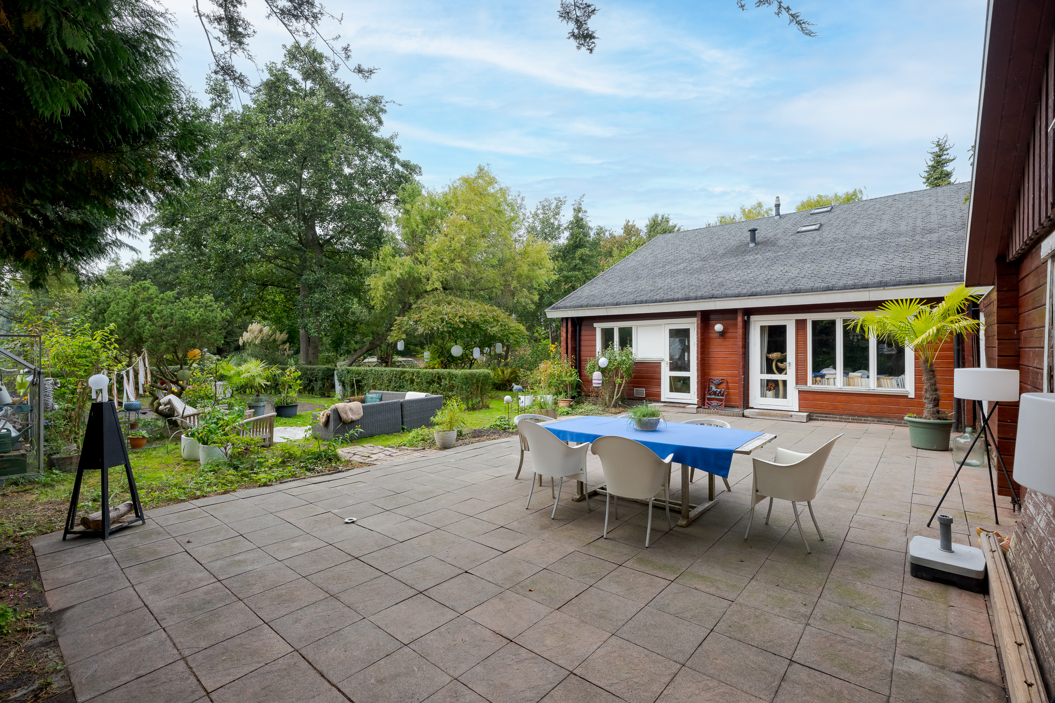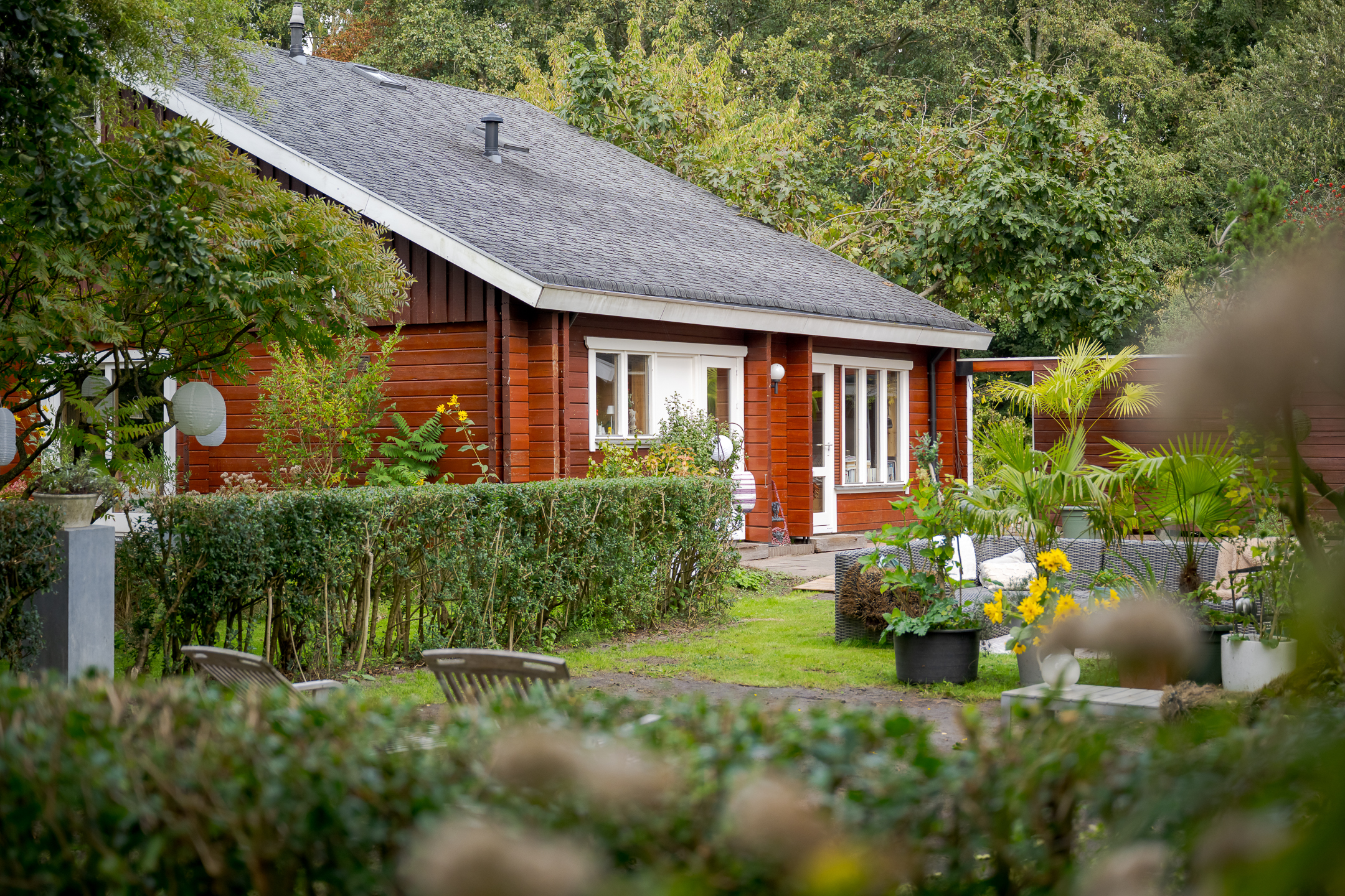 In the front yard, a spacious wooden garage (approximately 6 by 12 meters) sits perpendicular to the house, creating a courtyard with ample parking for several cars. But the real action is behind the house: the garden is over 50 meters deep and borders a tranquil lake with a view of a bird island.
