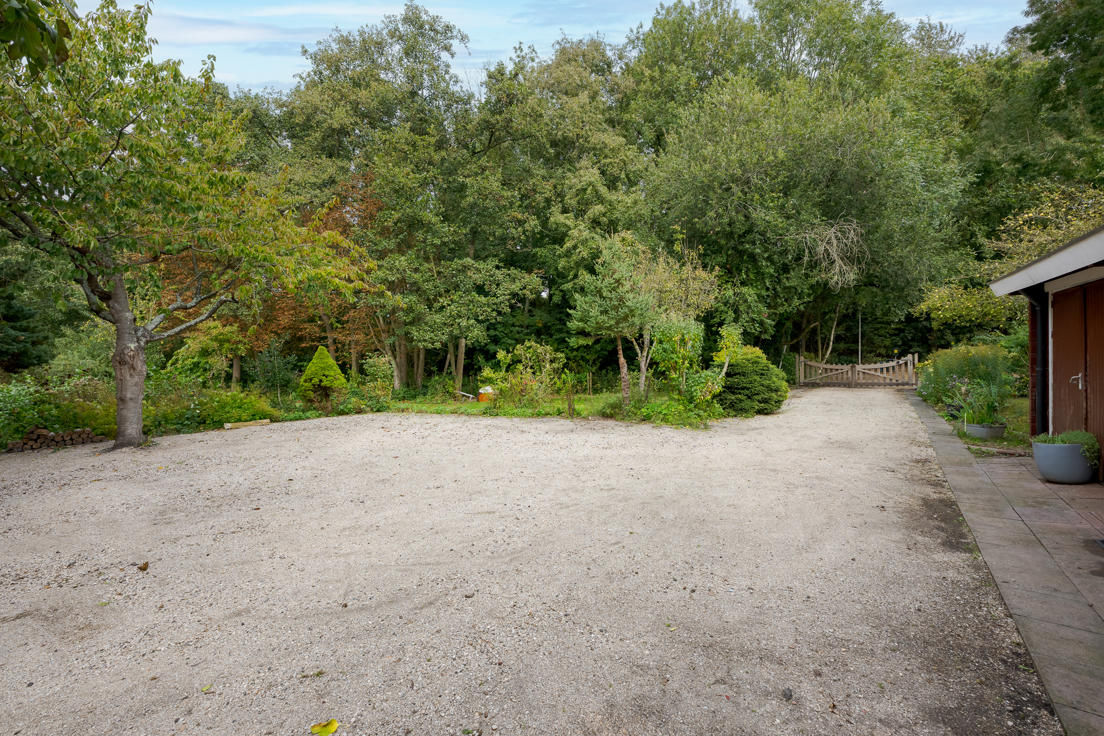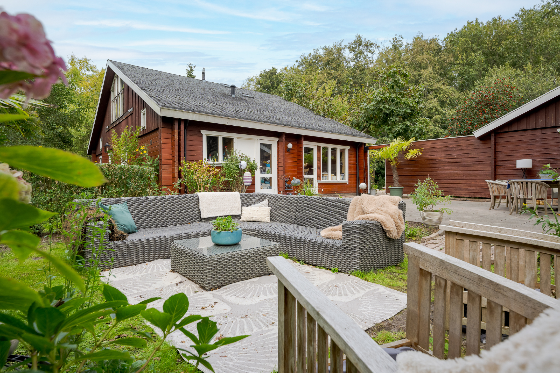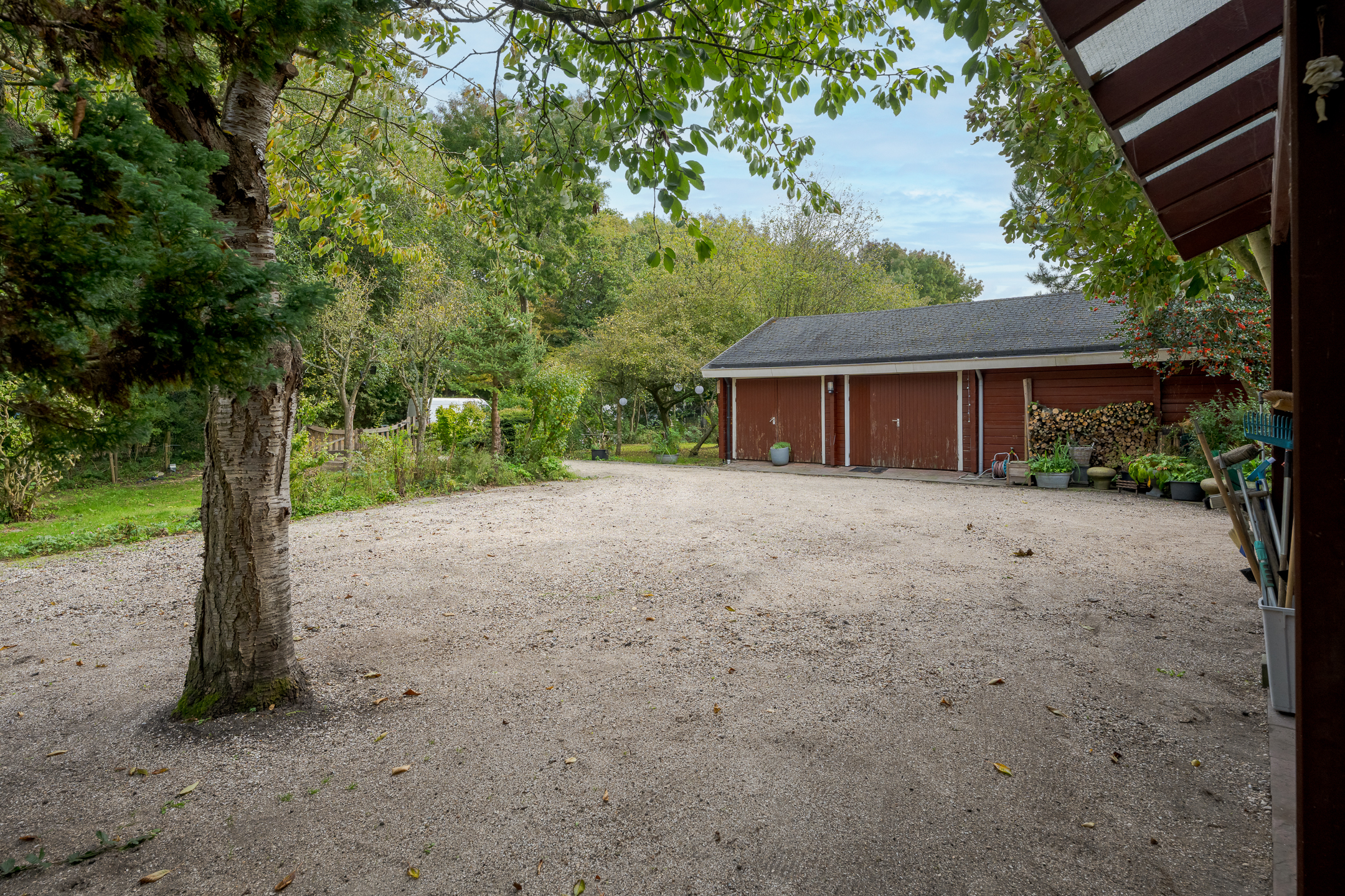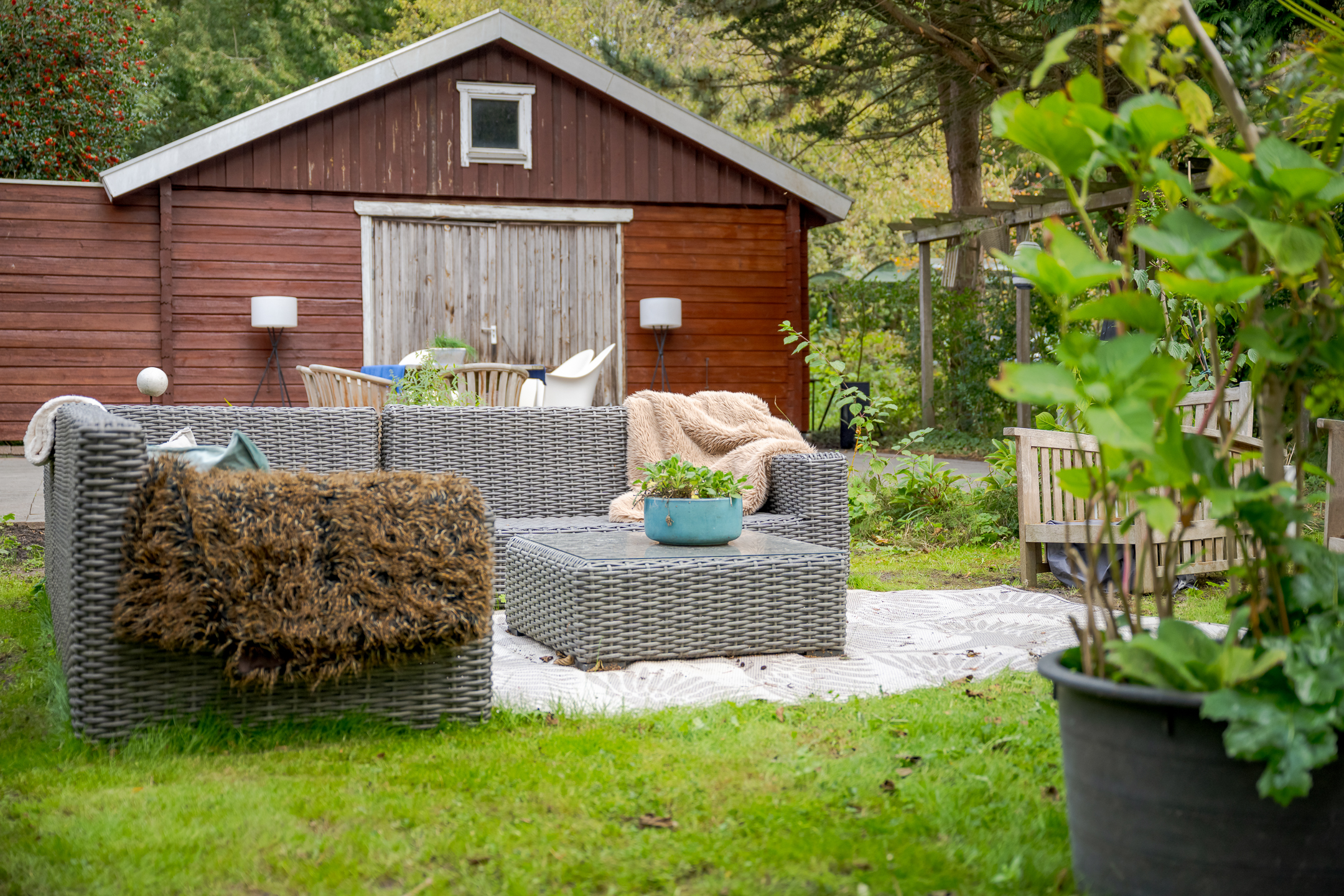 In the front yard, a spacious wooden garage (approximately 6 by 12 meters) sits perpendicular to the house, creating a courtyard with ample parking for several cars. But the real action is behind the house: the garden is over 50 meters deep and borders a tranquil lake with a view of a bird island.