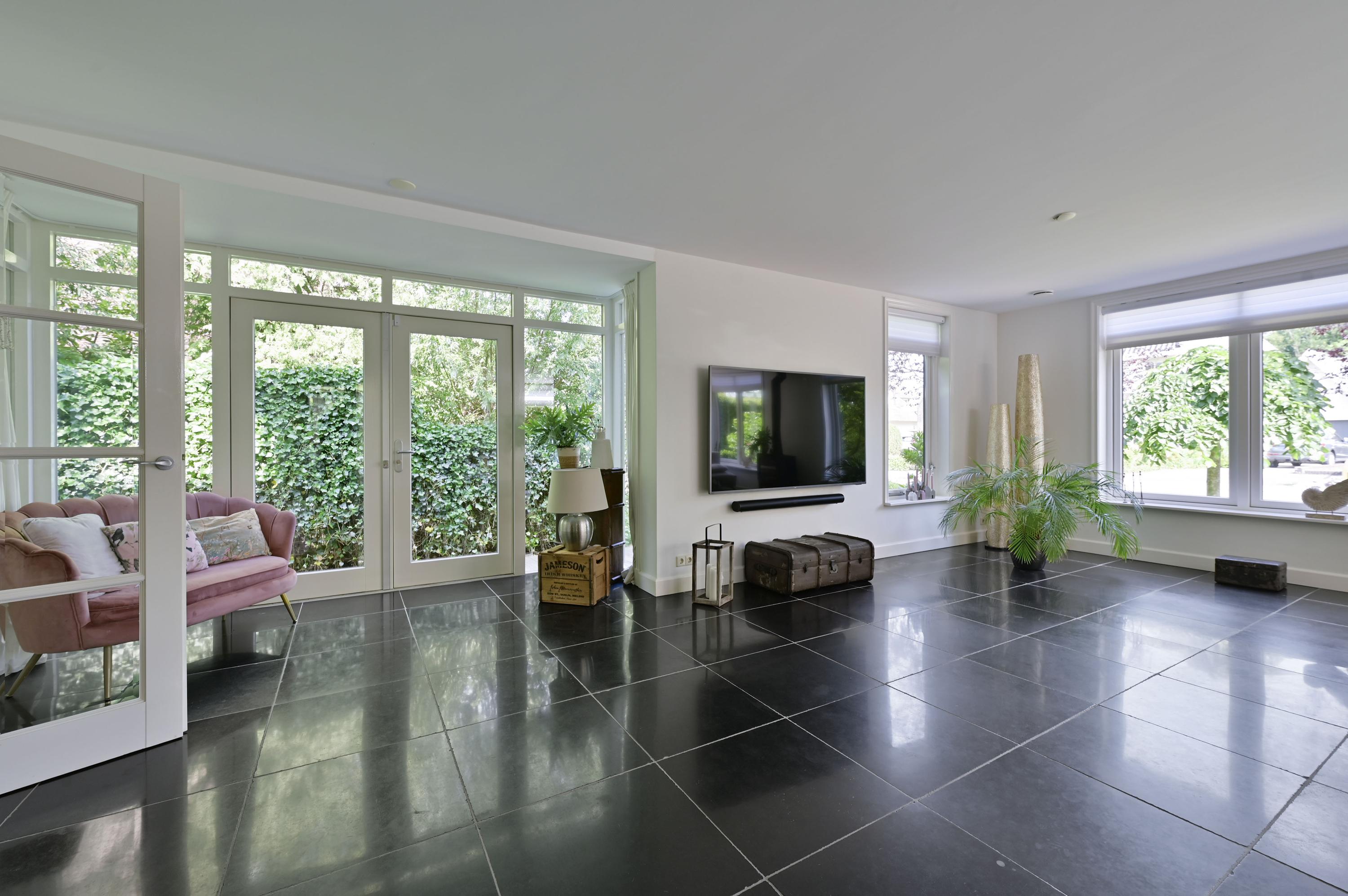 Upon entering the house, the spacious and tall staircase immediately catches the eye. Thanks to the large skylight above the stairwell, this central and highly representative hallway is remarkably bright. The hall offers a practical cloakroom, the meter cupboard, and a spacious toilet with a washbasin. From the hall, you enter the living room. This L-shaped living room is located at the front of the house and offers beautiful views of the front and side garden through the many low windows. A charming wood-burning stove (Dick Geurts) forms the cosy heart of the room. To the side is a delightful bay window with double doors leading to a decked terrace by the water — a perfect place to unwind.