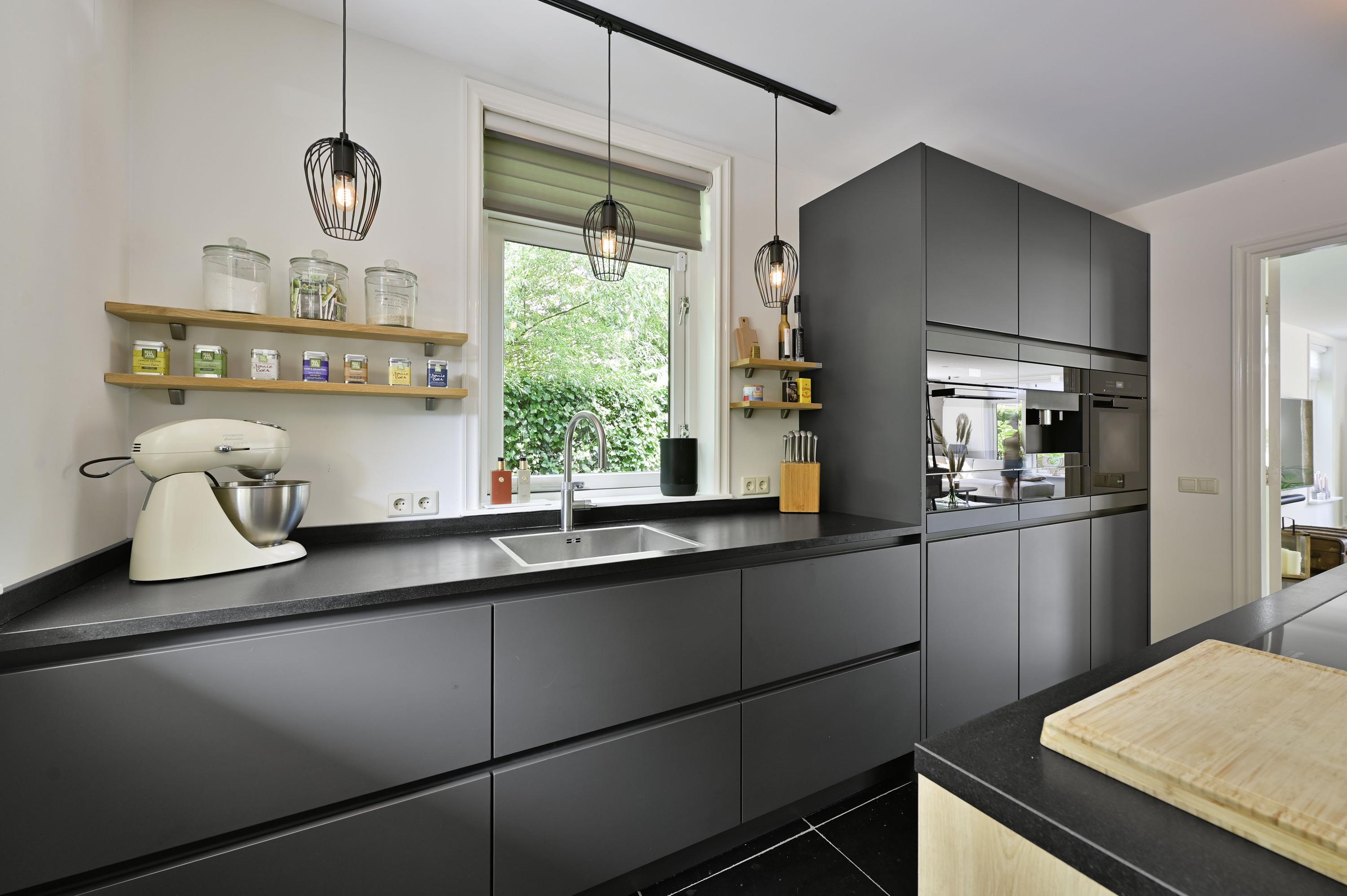 Double doors lead to the spacious kitchen-diner, designed with functionality and style in mind. A central cooking island with induction hob and integrated extractor, ample drawers, and workspace, along with an additional countertop with sink and Quooker. The adjacent tall cabinet wall houses luxurious built-in appliances, including a combination steam oven/microwave, coffee machine, large oven, sliding fridge, dishwasher, vacuum, and warming drawer. The Siematic kitchen features Miele built-in appliances from 2018. Naturally, there is also ample space for a large dining table, with French doors (fitted with insect screens) opening onto the sunny rear garden. An awning provides additional comfort.