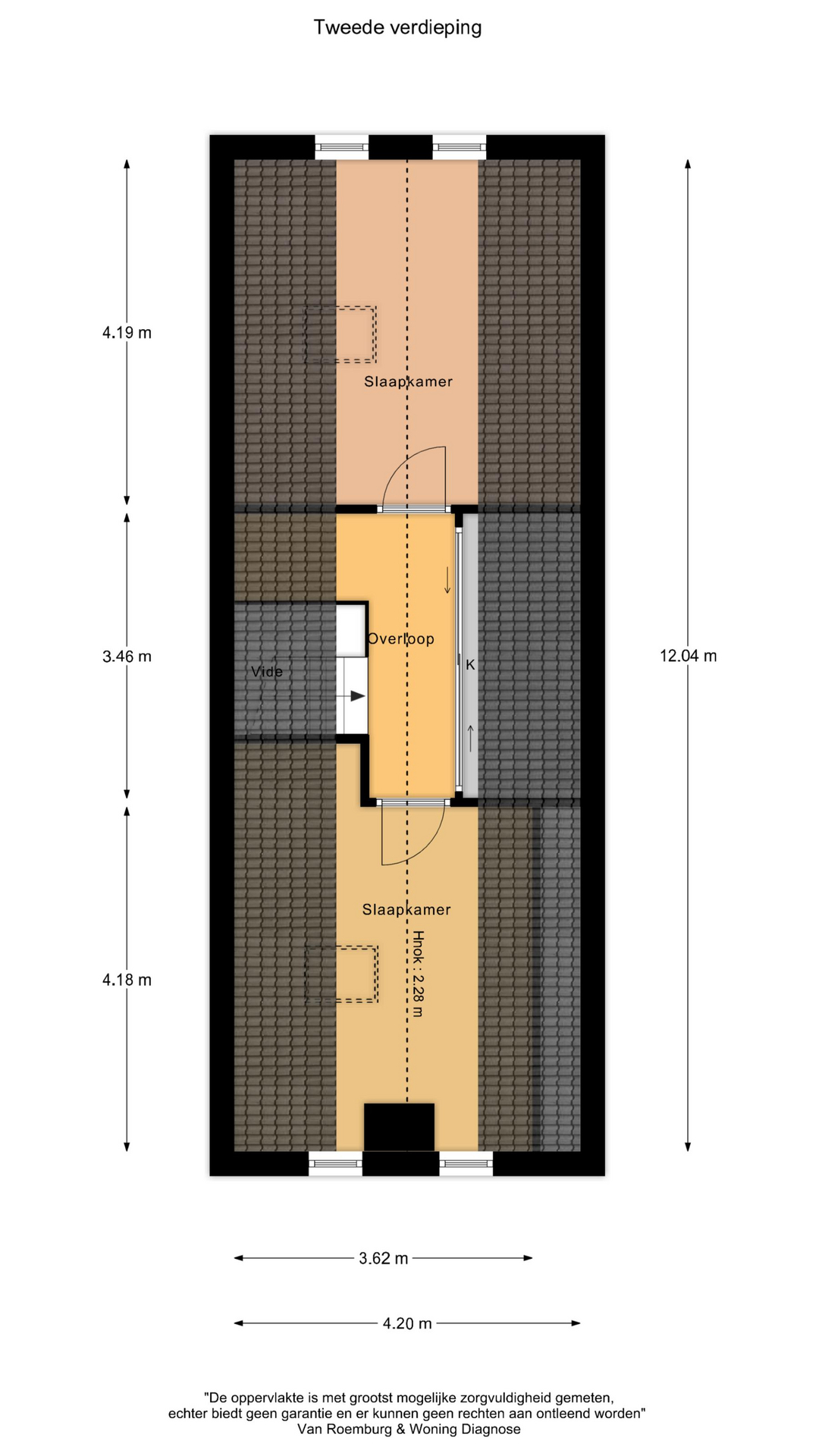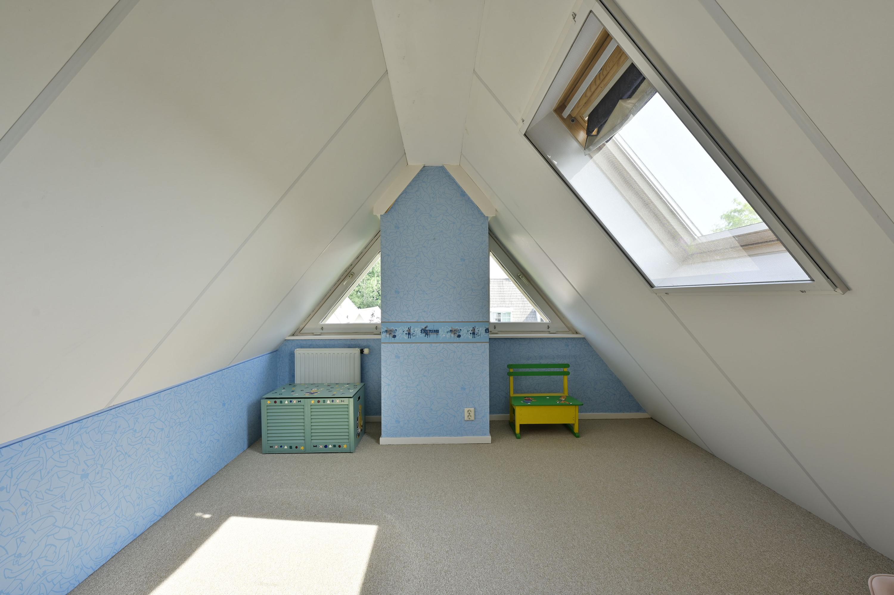 A fixed staircase leads to the second floor with a landing featuring a built-in wardrobe housing the heat recovery system (WTW) and central heating boiler, with additional storage space. There are two further bedrooms, both with skylights and distinctive windows in the gable walls, adding character and natural light to these rooms.