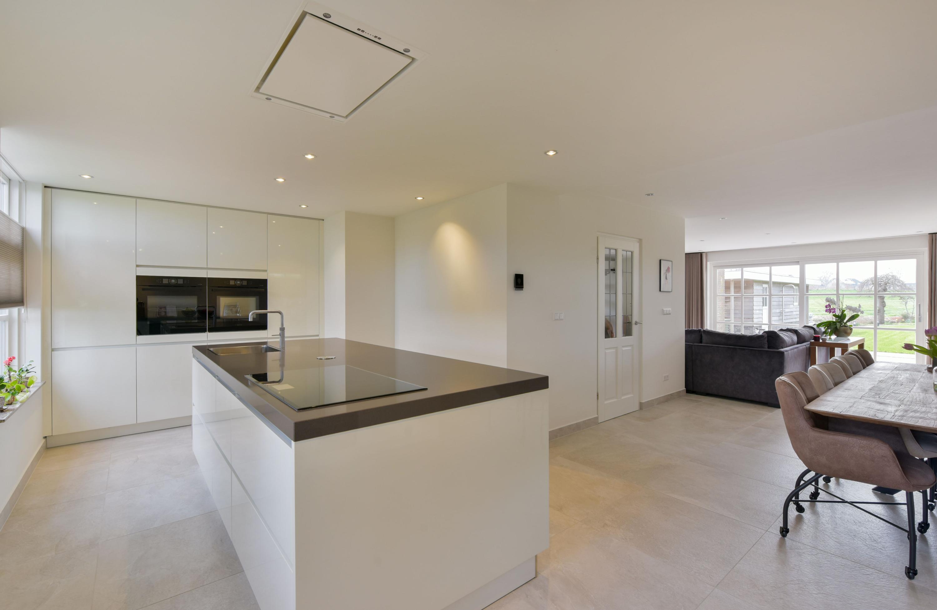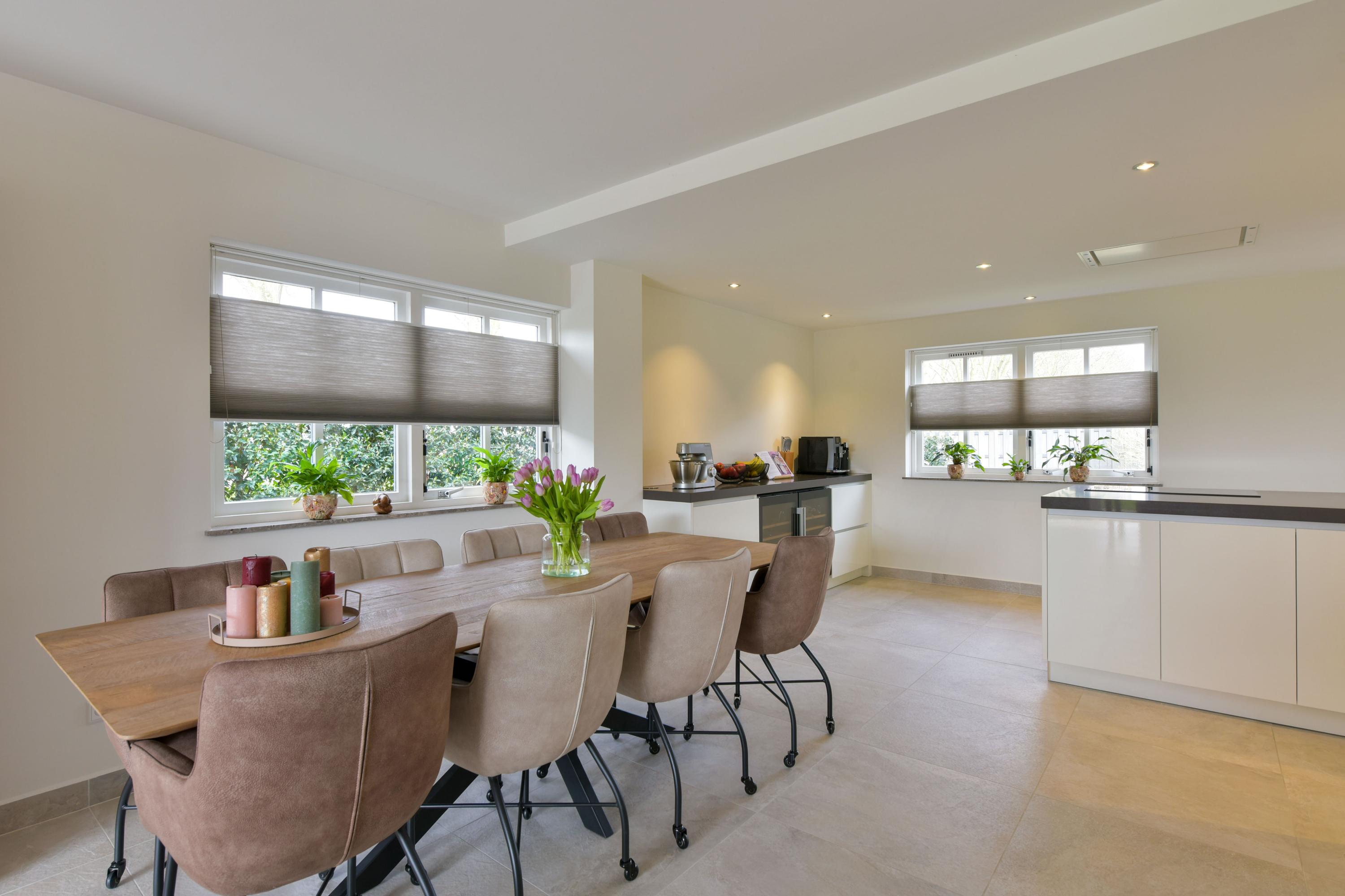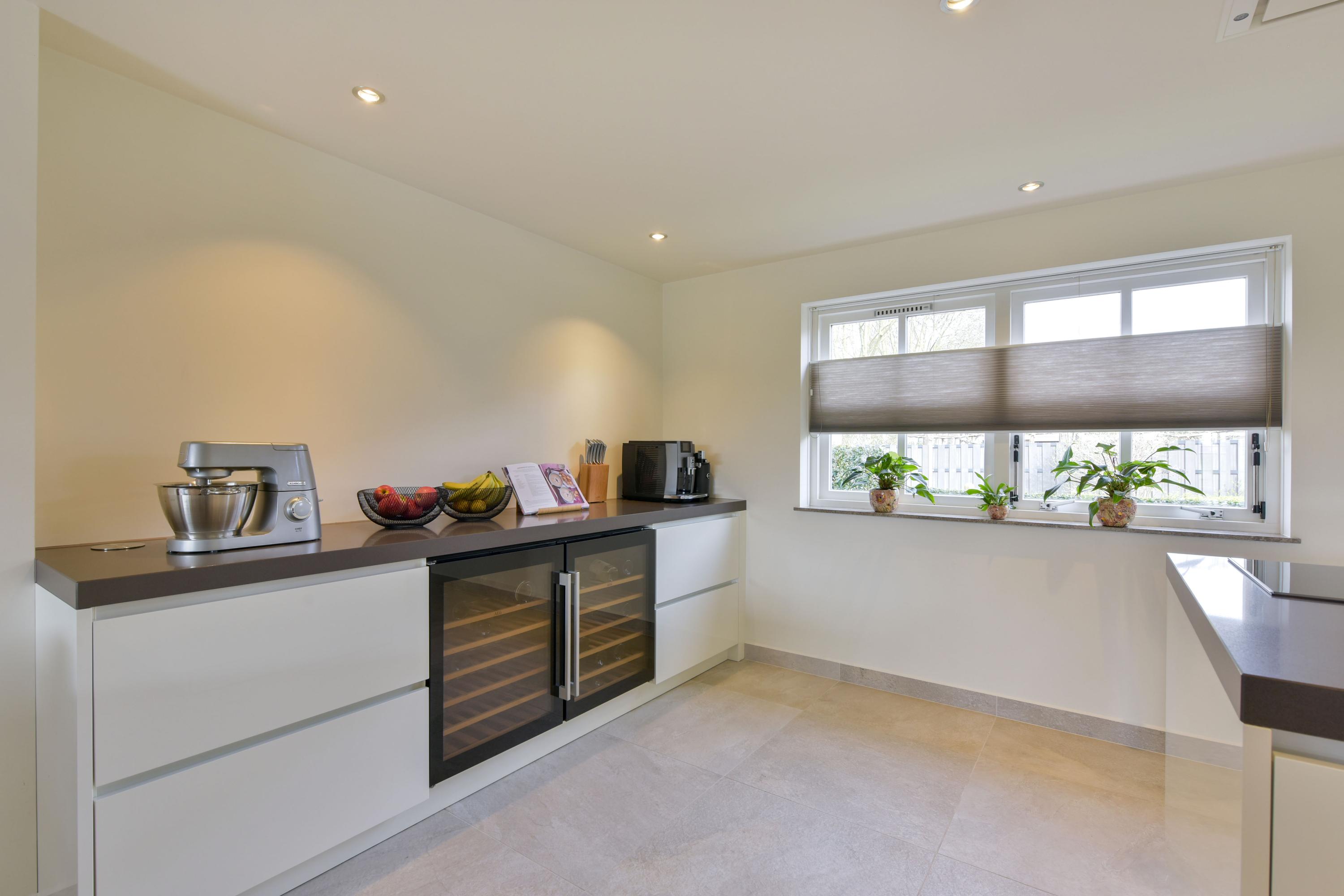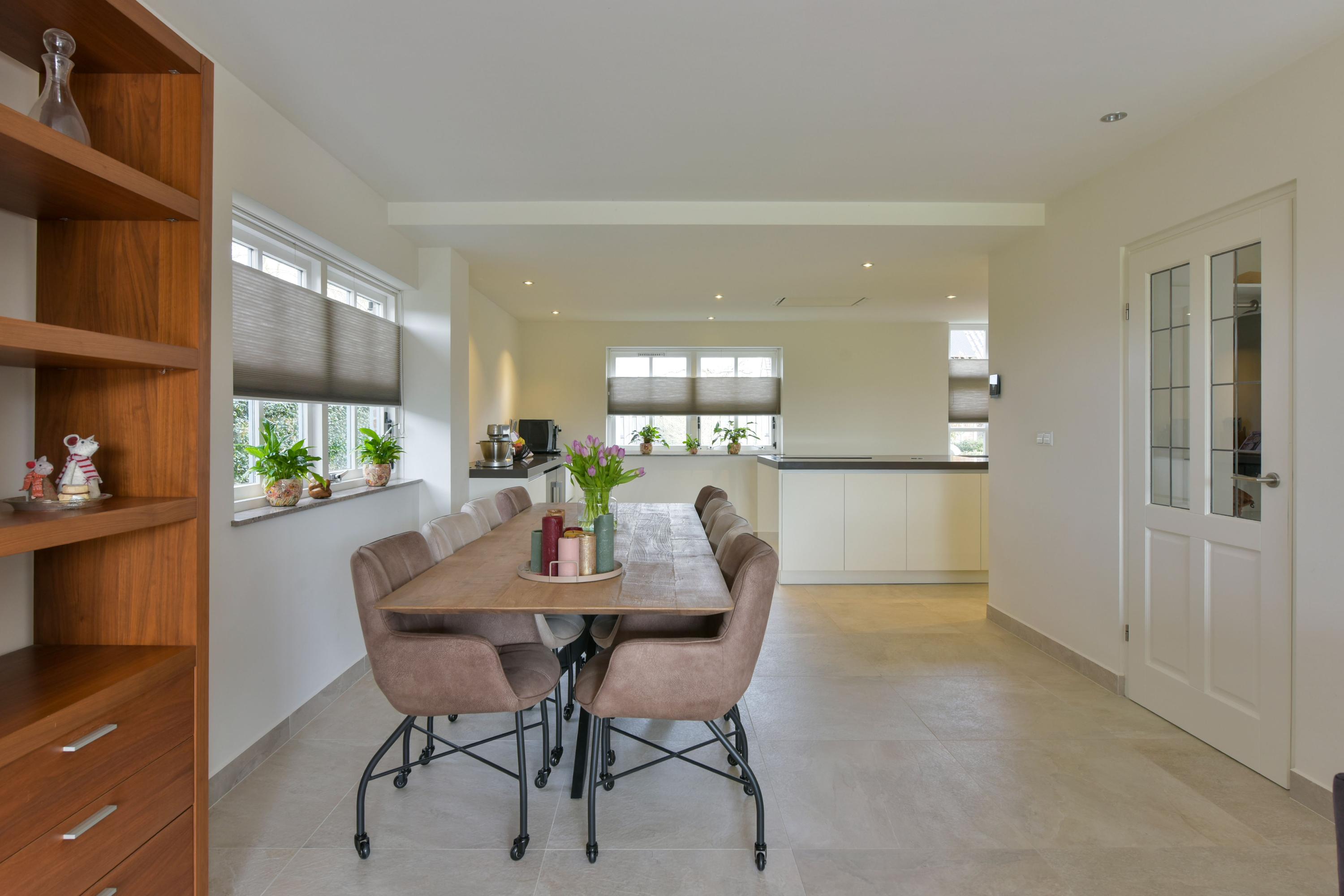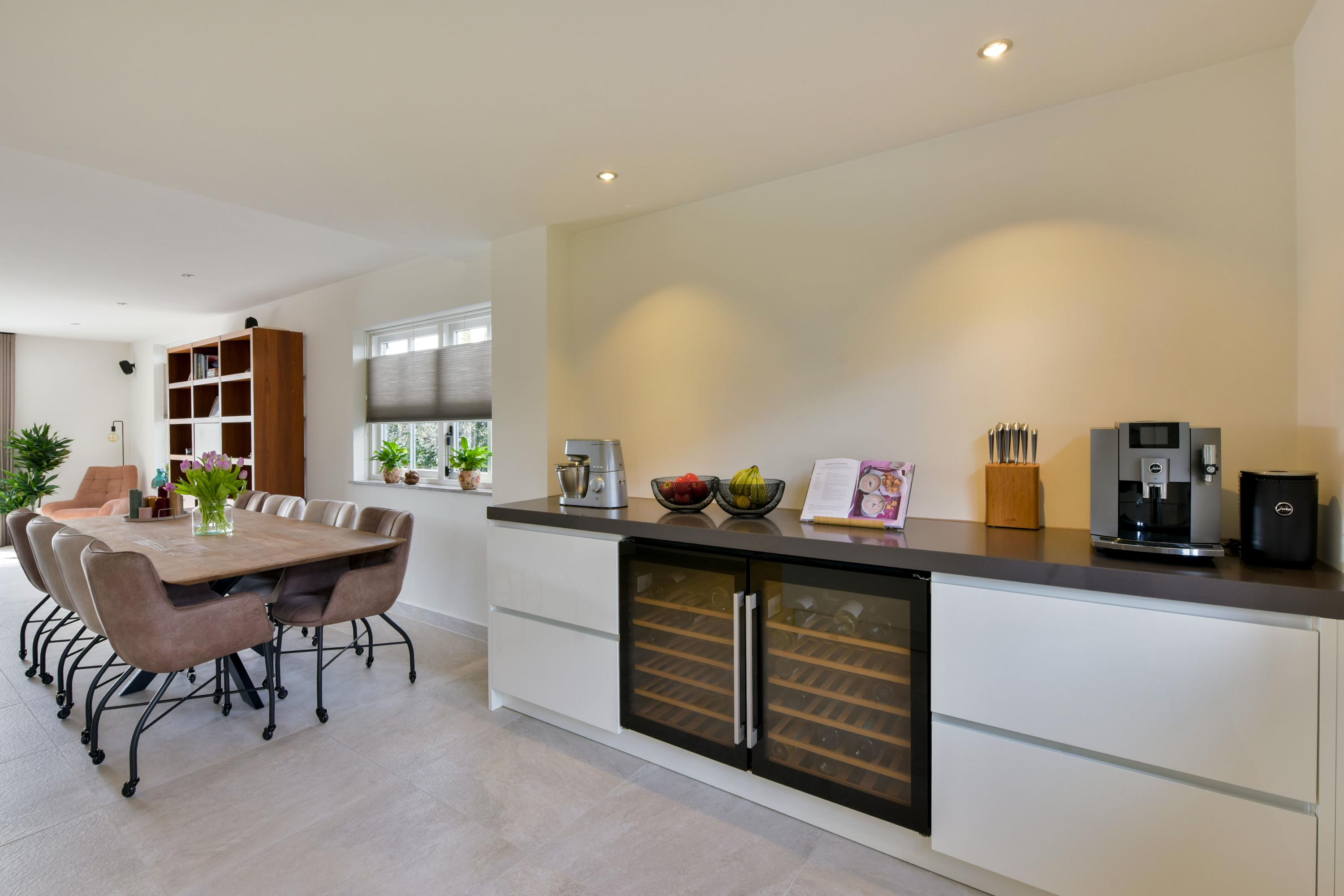 At the front of the house, you will find the impressive open kitchen (installed in 2019), which can truly be described as spacious. The large kitchen island forms the central hub—perfect for cooking together or enjoying casual dining. On both sides, stylish cabinet walls house a full range of built-in appliances, including a combination oven, steam oven, refrigerator, freezer, dishwasher, induction hob, ceiling extractor, Quooker, and two wine climate cabinets.