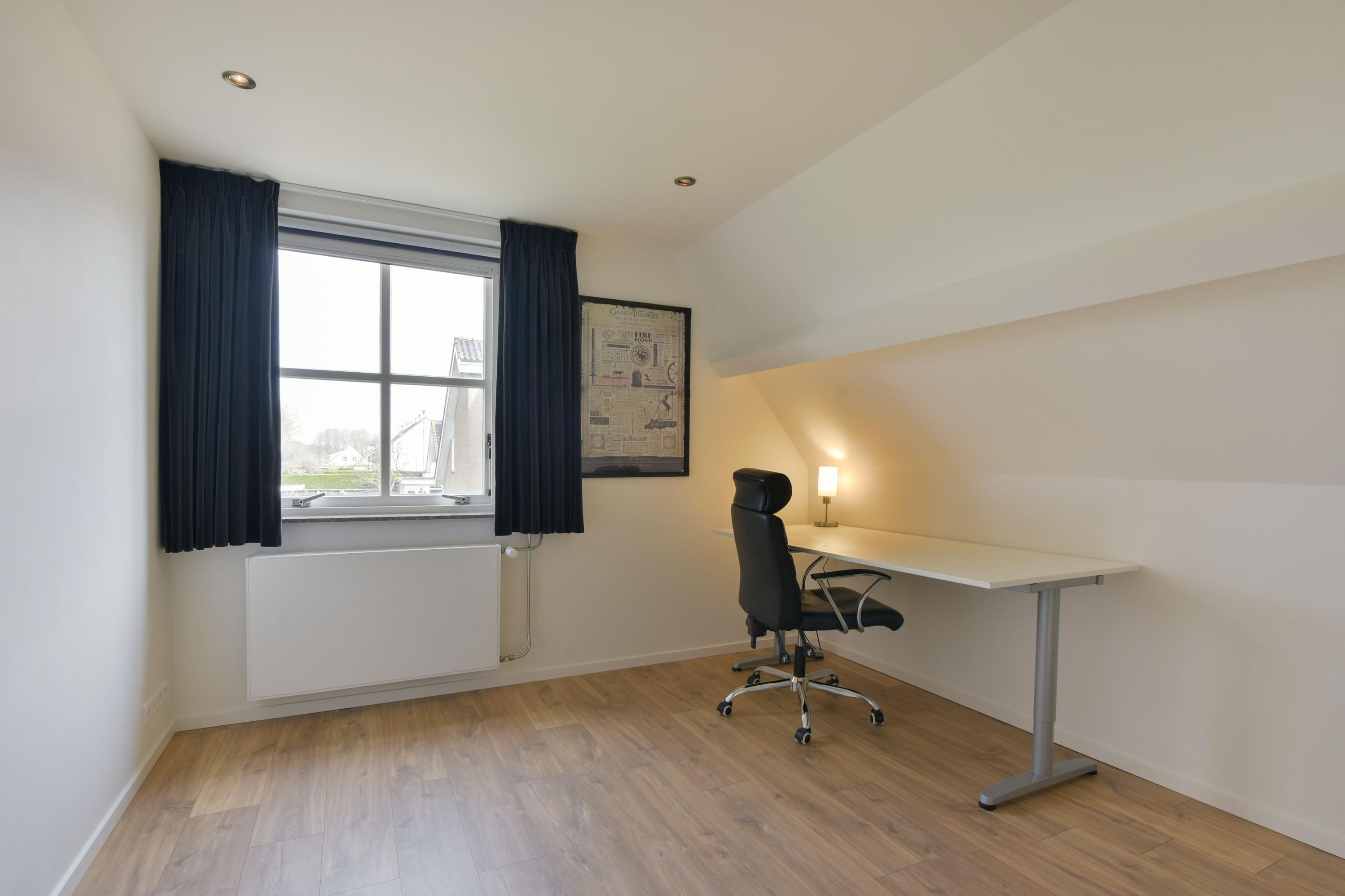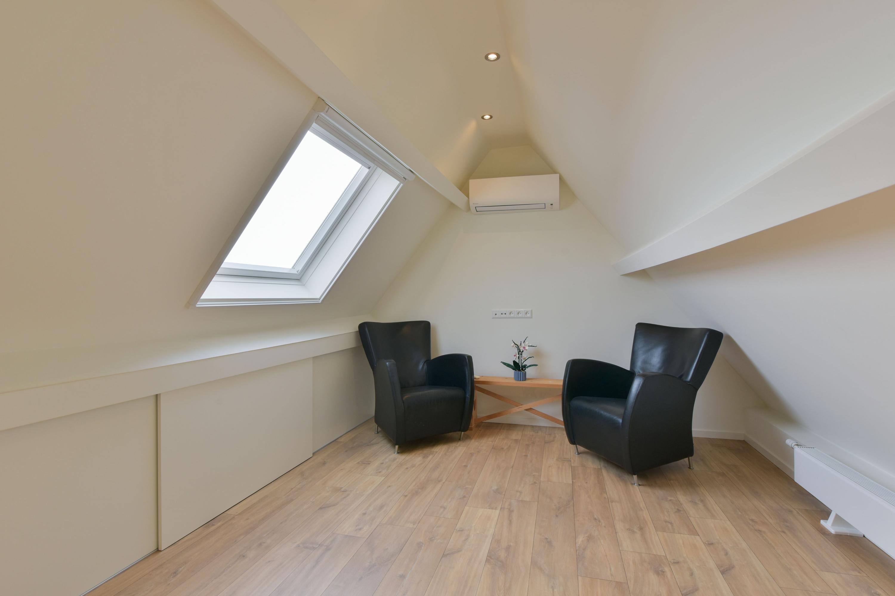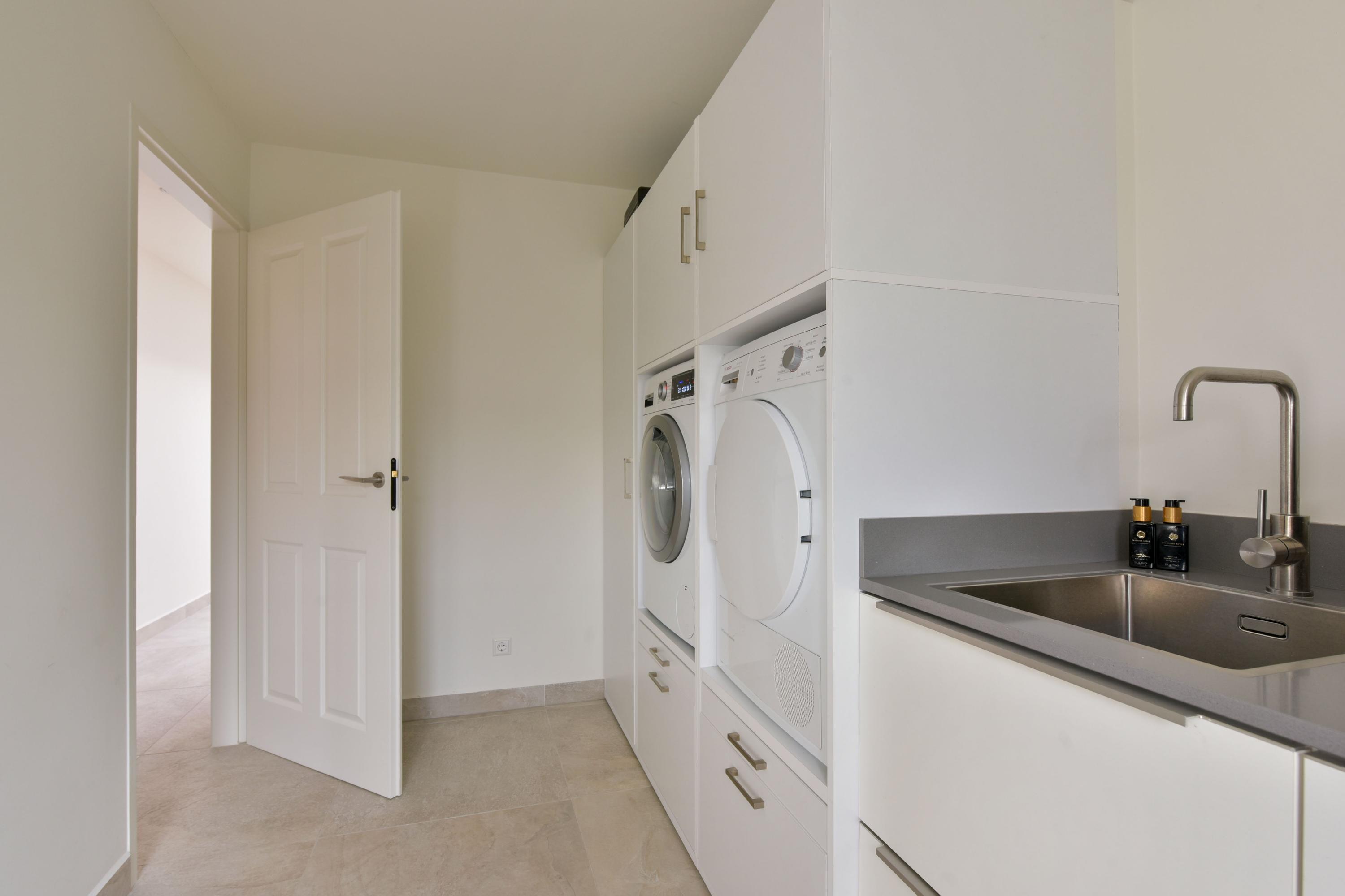A separate laundry room with space for a washing machine and dryer, a small kitchenette, and a neatly concealed central heating system (2020) complete the ground floor. From this utility room, you have direct access to the garden.