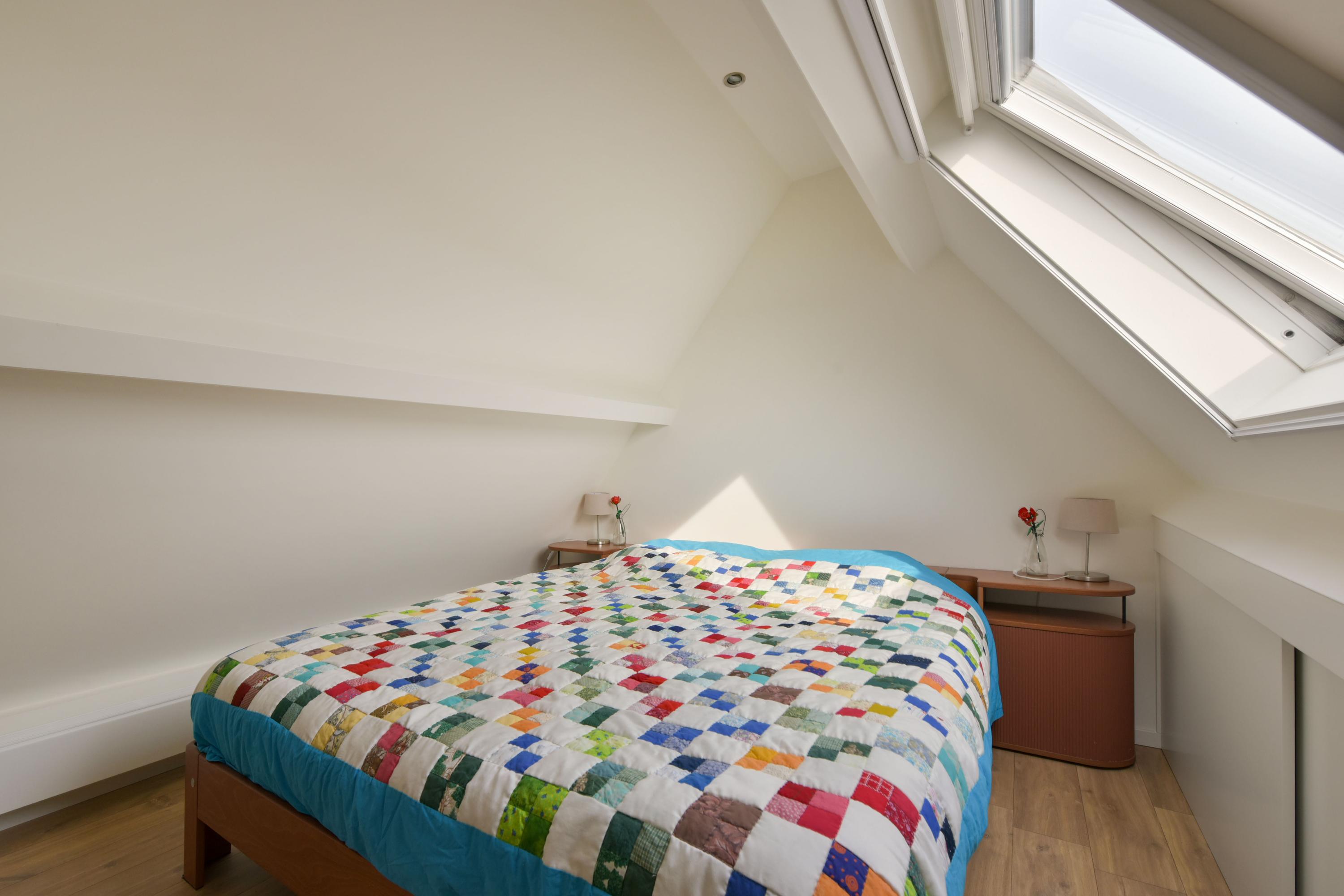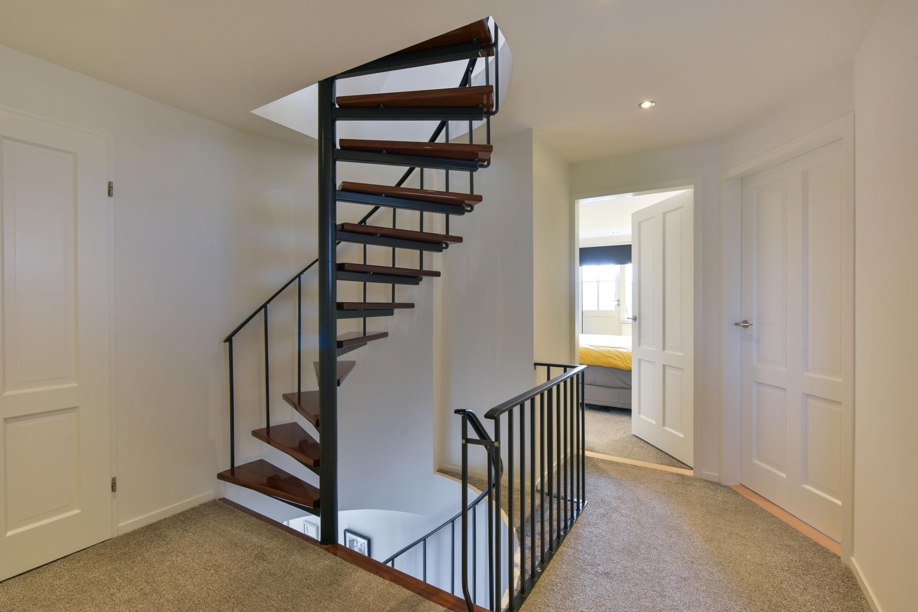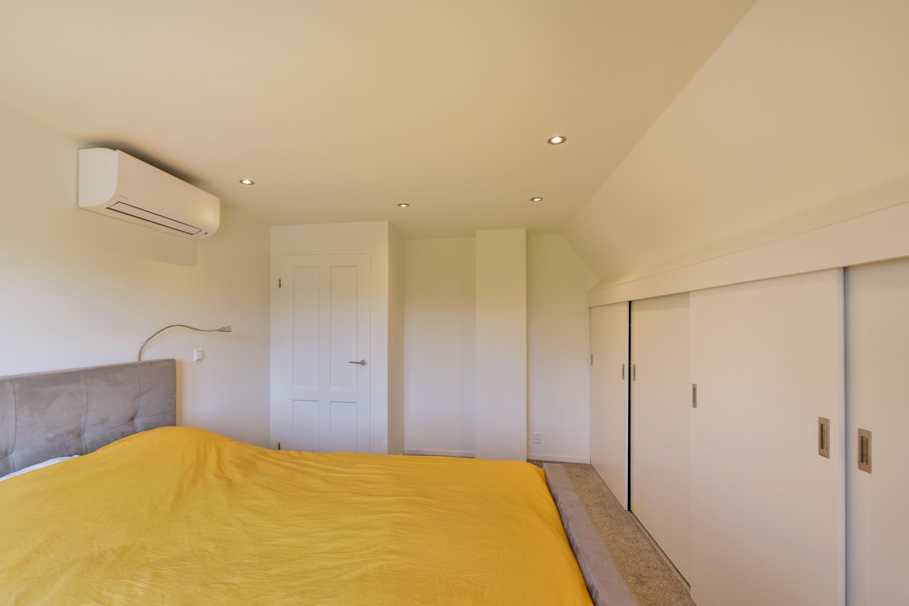 The second floor, accessible via a fixed spiral staircase, offers two additional bedrooms. The rear bedroom is also equipped with air conditioning. Both rooms include TV and internet connections and are neatly finished with laminate flooring and recessed spotlights.