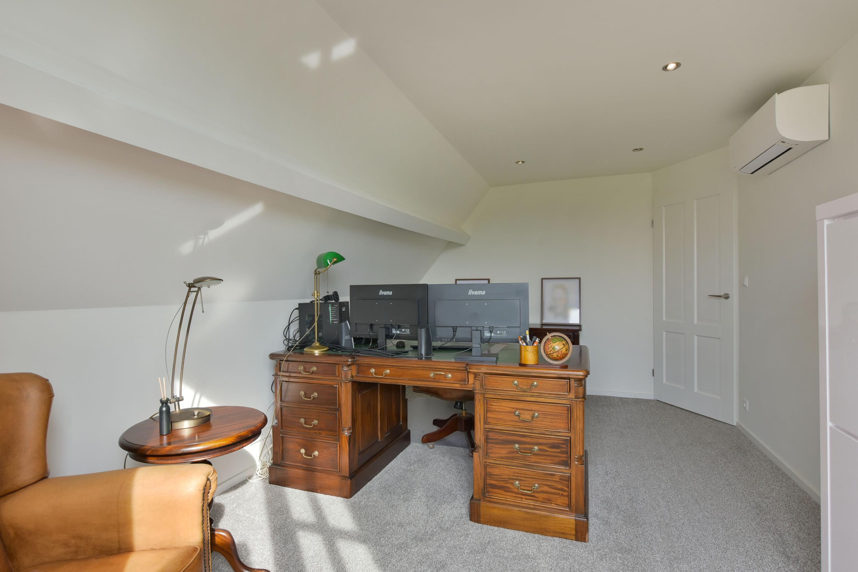 From the central hall, you also reach the multifunctional room, formerly the garage. This space is now fully integrated into the home and offers numerous possibilities, such as a home office, practice space, or additional living area. Here you will also find a modern bathroom (2022), equipped with double rain showers, a washbasin, toilet, and designer electric towel radiators. This makes having a bedroom on the ground floor entirely feasible.