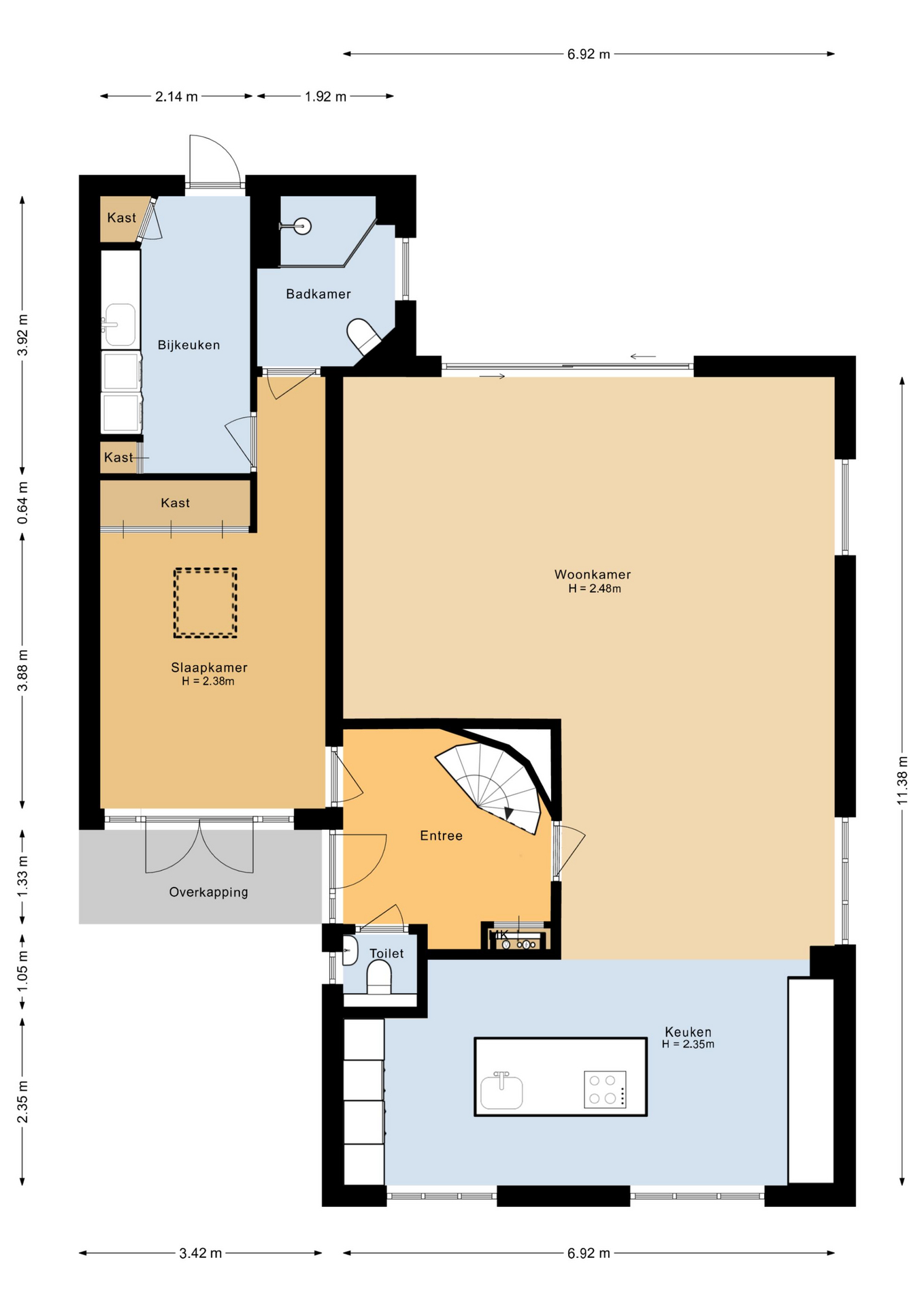 Upon entering, you are immediately welcomed by a spacious entrance hall that offers a pleasant and open reception. From this representative hall, you have access to the toilet, the modernized meter cupboard with a three-phase connection, a multifunctional room, and the wonderfully bright living room with open-plan kitchen.