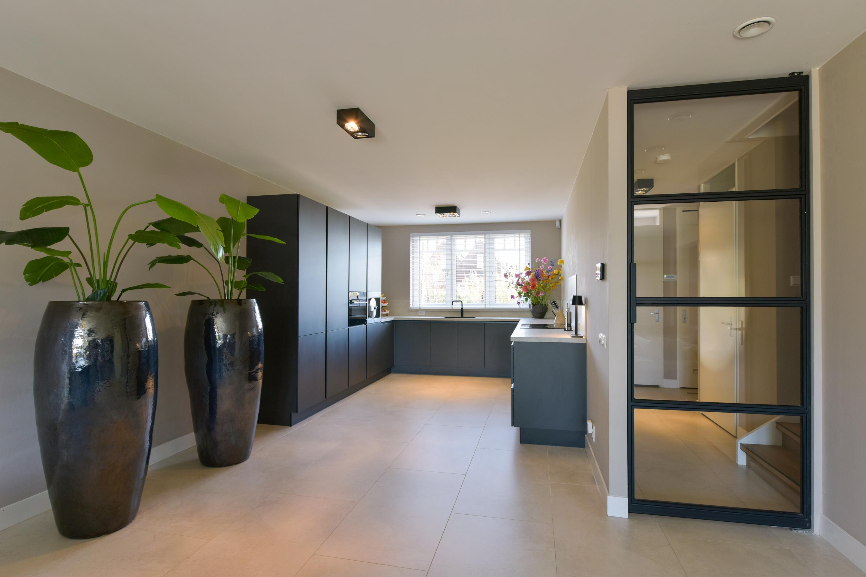 At the front of the house lies the modern U-shaped kitchen, a culinary dream for any cooking enthusiast. The kitchen includes two refrigerators, a freezer, a combination oven, an integrated Bora induction hob, a Quooker, a Le Mans corner unit, and plenty of drawers, providing abundant storage. A unique feature is the vacuum-sealing appliance integrated into the countertop (note: the steam oven will be taken by the seller). Luxury is further emphasized by the seamless tile finish: the backsplash and window sills are made of the same material as the floor, creating a beautifully harmonious look.